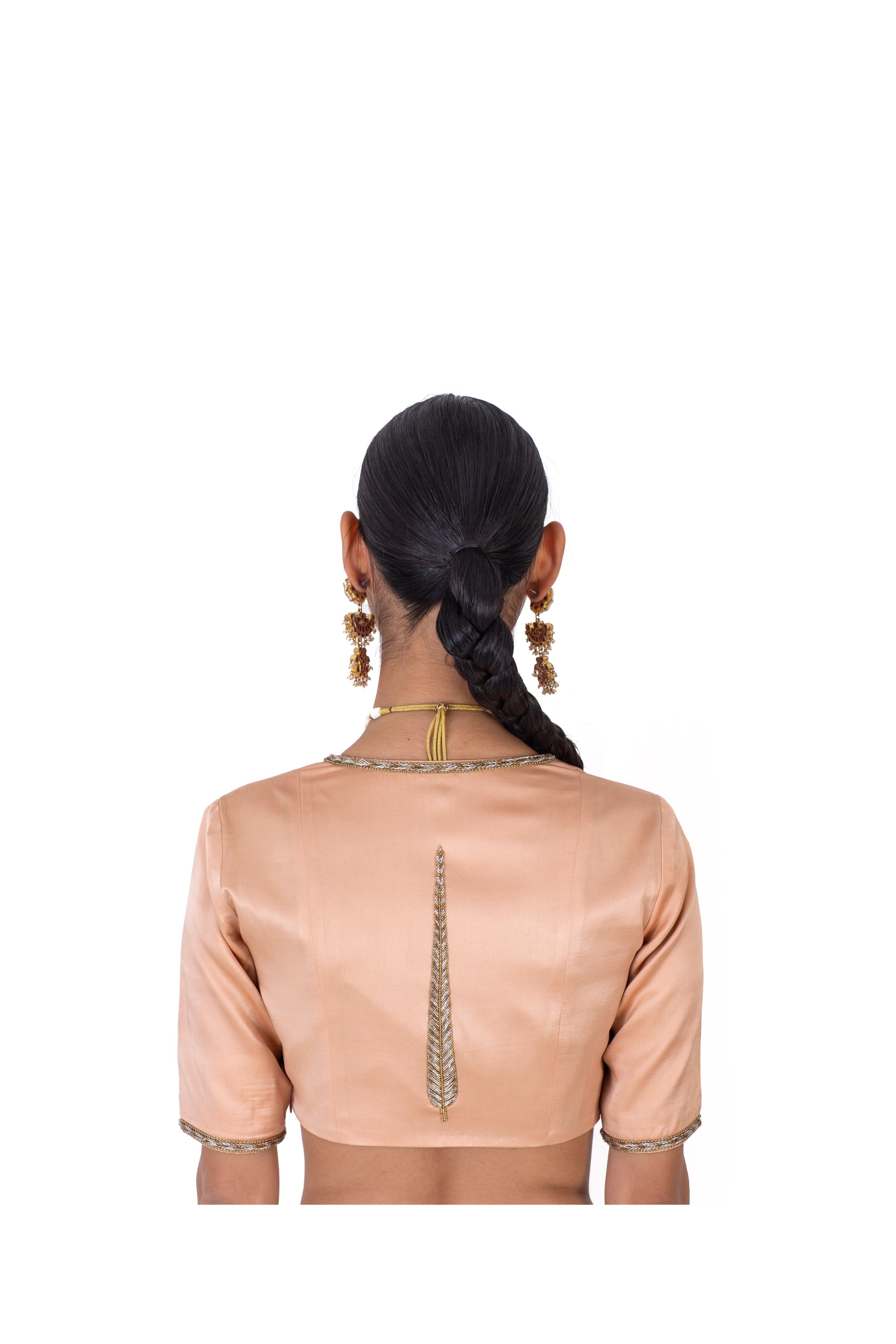 ‘Abhirami’ pale pink satin silk blouse with hand-embroidered highlights crafted through gold and silver glass beads.