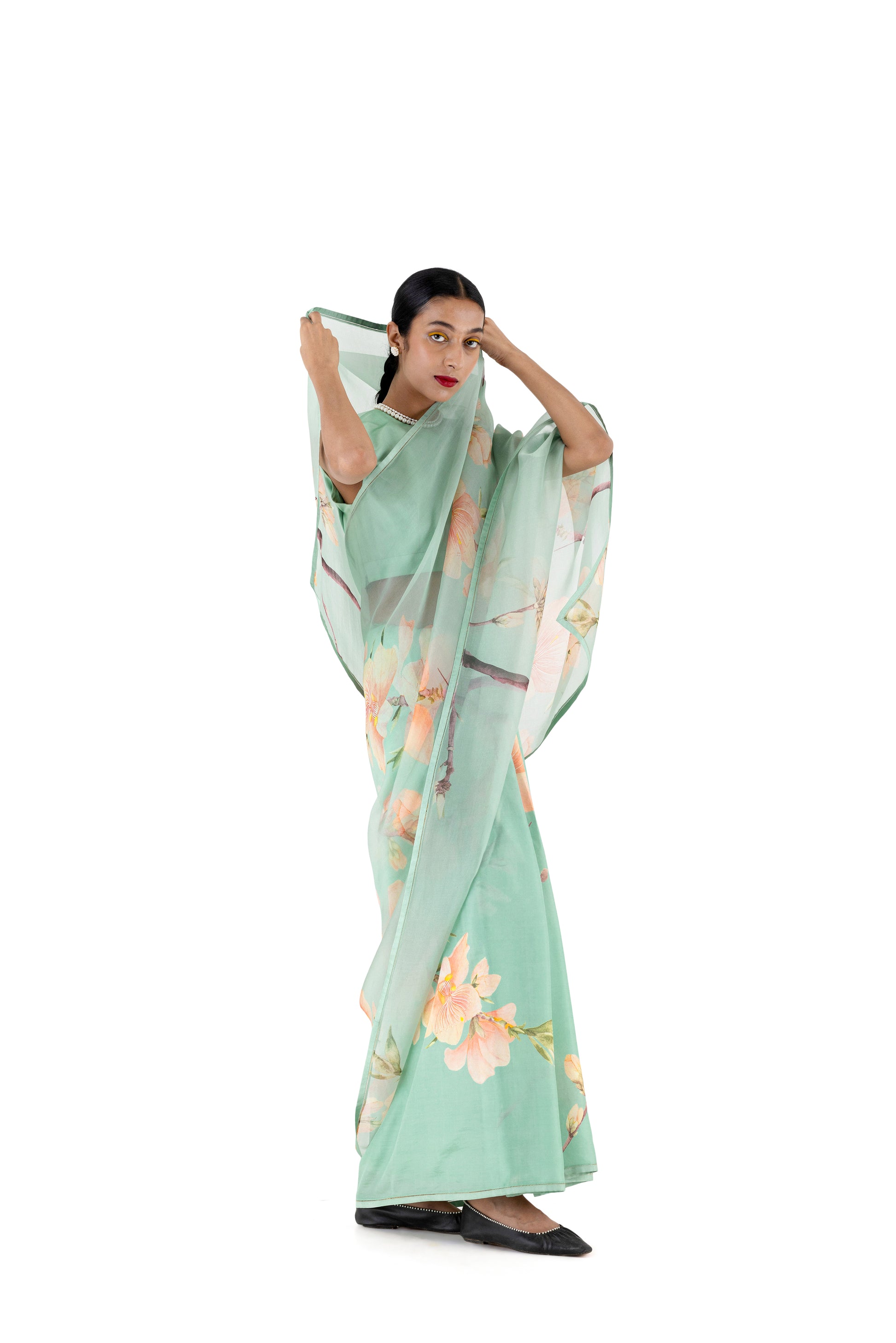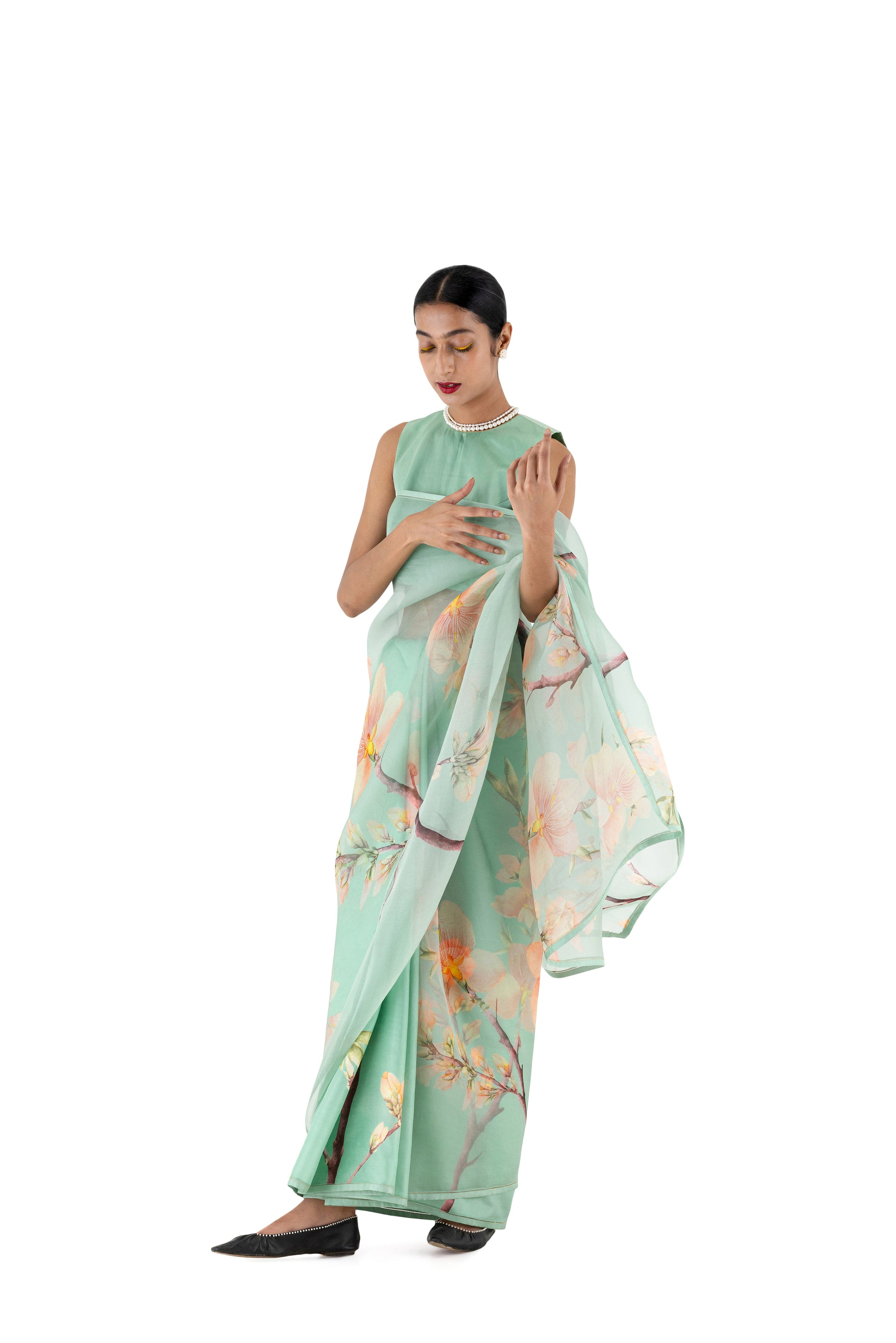‘Agati’ pale blue sari features flowers from the peach tree, found in the Indian forests of the Himalaya. Hand-painted and transferred on a joinery of mulberry silk and sheer organza silk, for a better suited drape and fall.