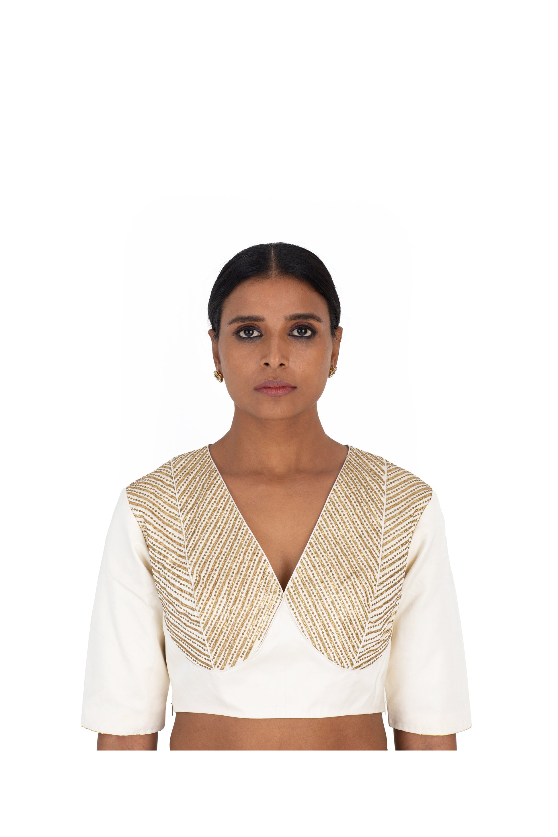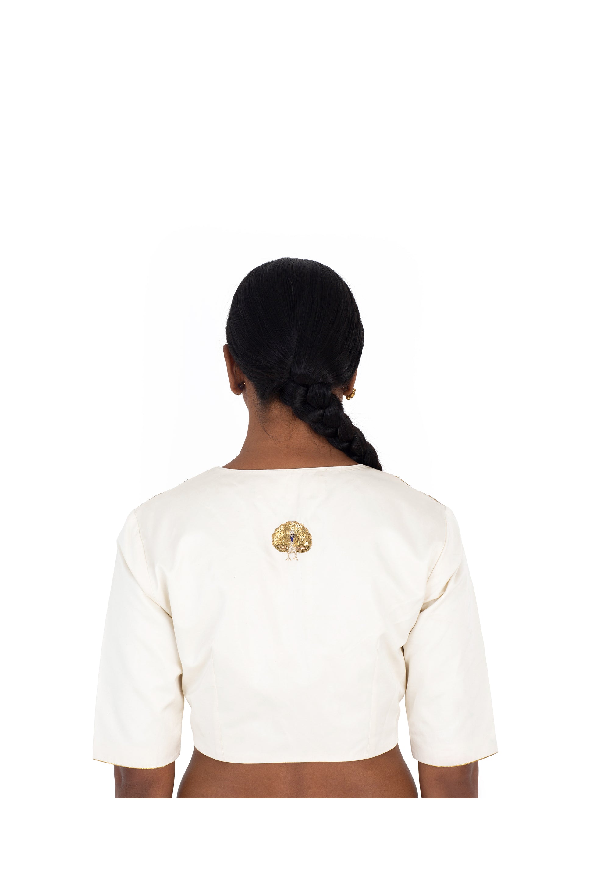 'Ajmer' natural striped silk blouse draws from the Rajasthani choli. It is made with fine 'gota', an appliqué technique where pieces of metal yarn ribbons are embroidered onto the fabric. It features an embroidered peacock on the back.