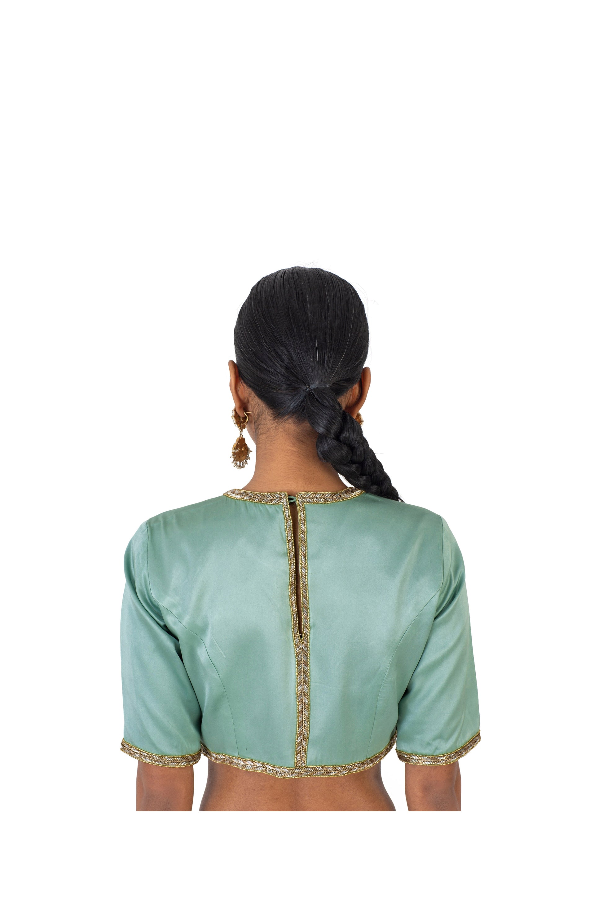 ‘Ambarisha’ pale blue satin silk blouse with hand-embroidered highlights crafted through gold and silver glass beads.