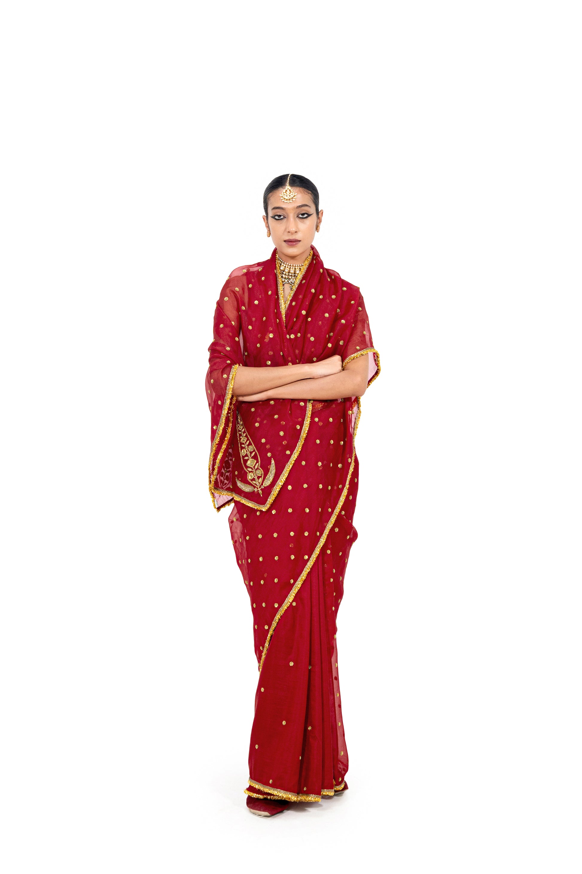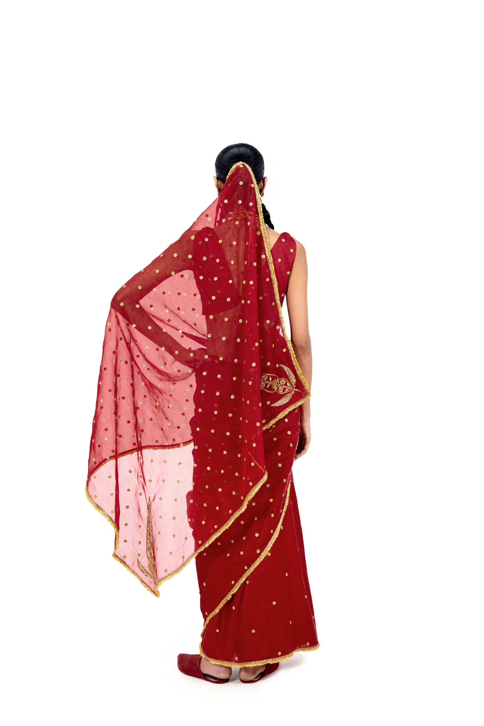 'Arsinga' red sari is made through a joinery of textiles: sheer organza silk and plain silk, which allows for a better suited drape and fall. It features an all-over placement of the 'ashrafi', an auspicious coin shaped buti, and an archival "kuniya" buta (motif placed at a corner) - embroidered through intricate zardozi embroidery and kiran along the border.