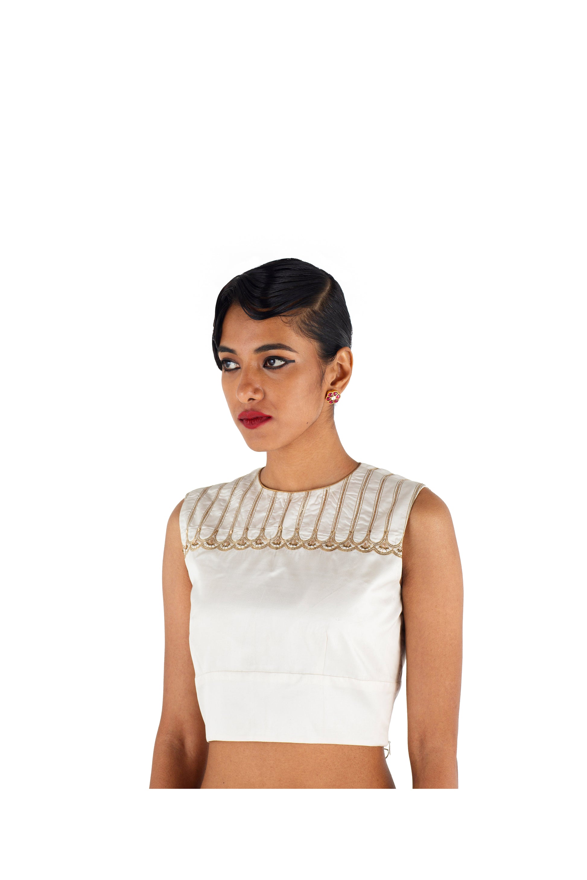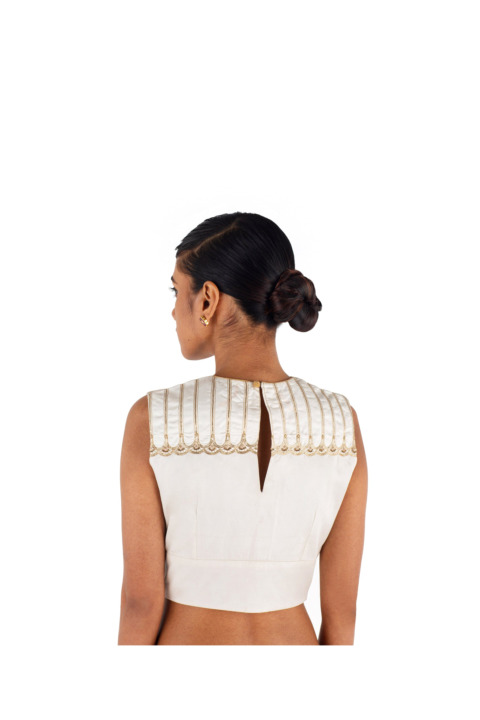 Satin silk natural sleeveless 'Artemio' blouse features gold zari embroidered palm leaf motifs that evoke those seen in Art Deco designs.
