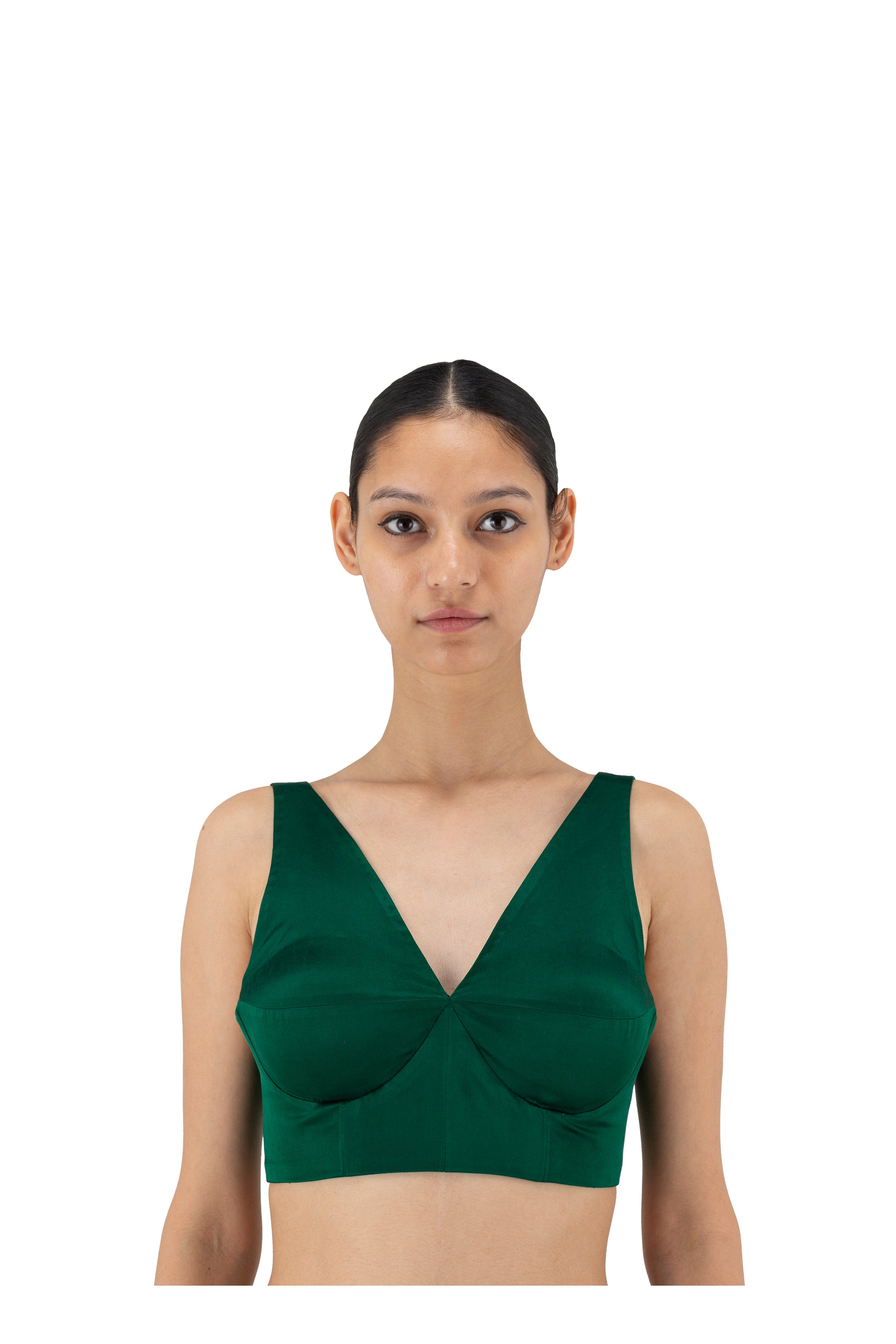 'Ashwem' green satin silk sleeveless blouse features a V-neck and form that draws from that of the corset.