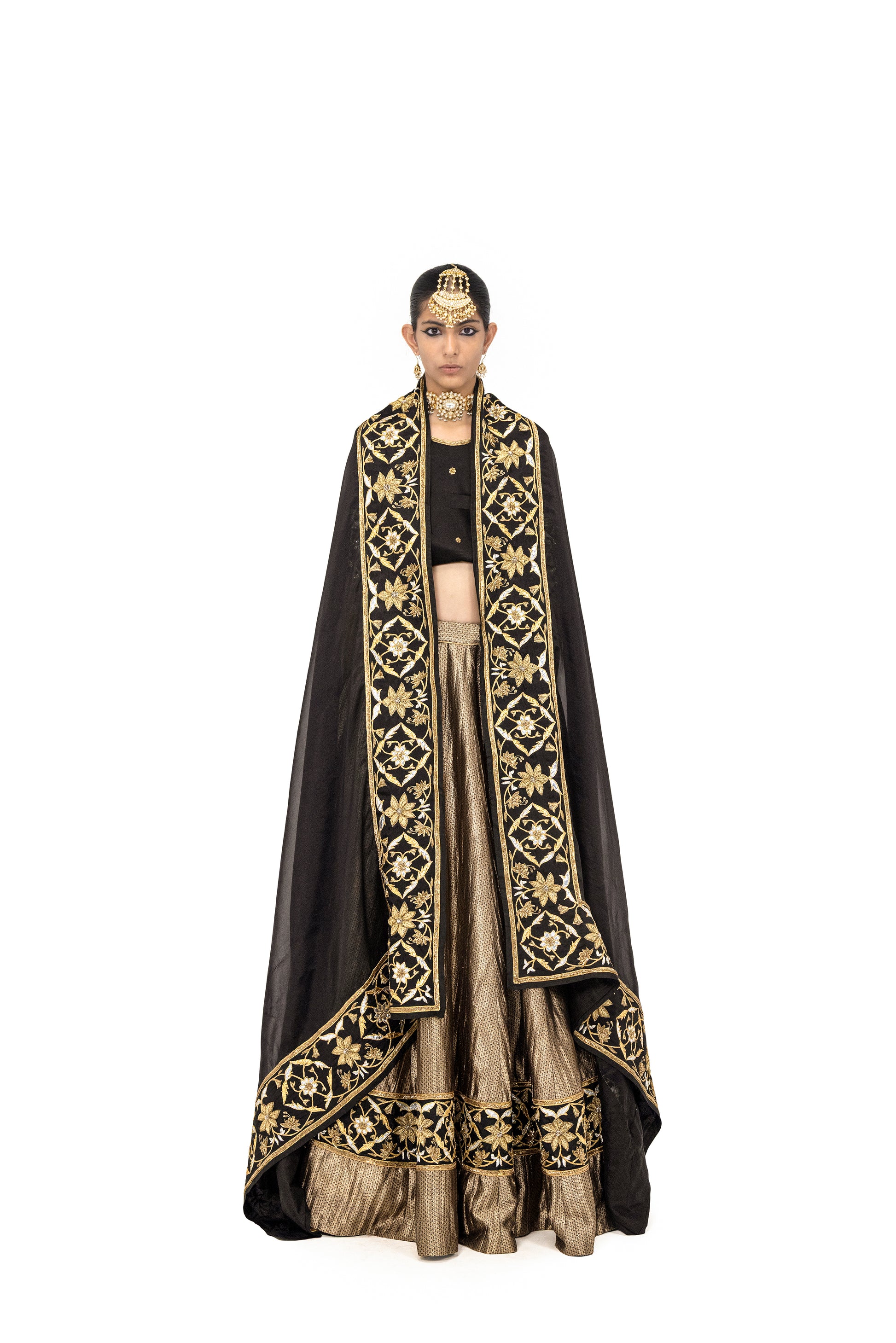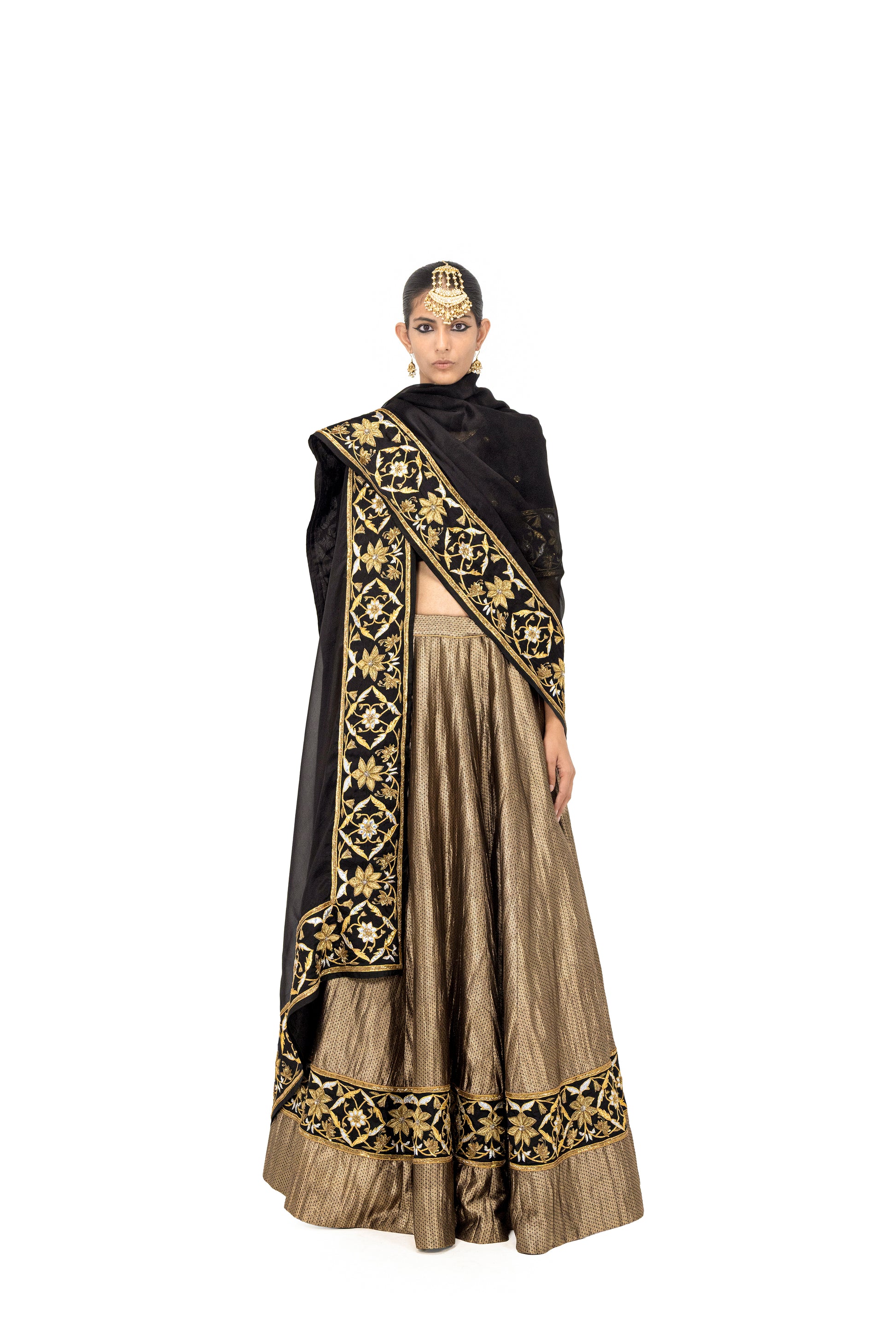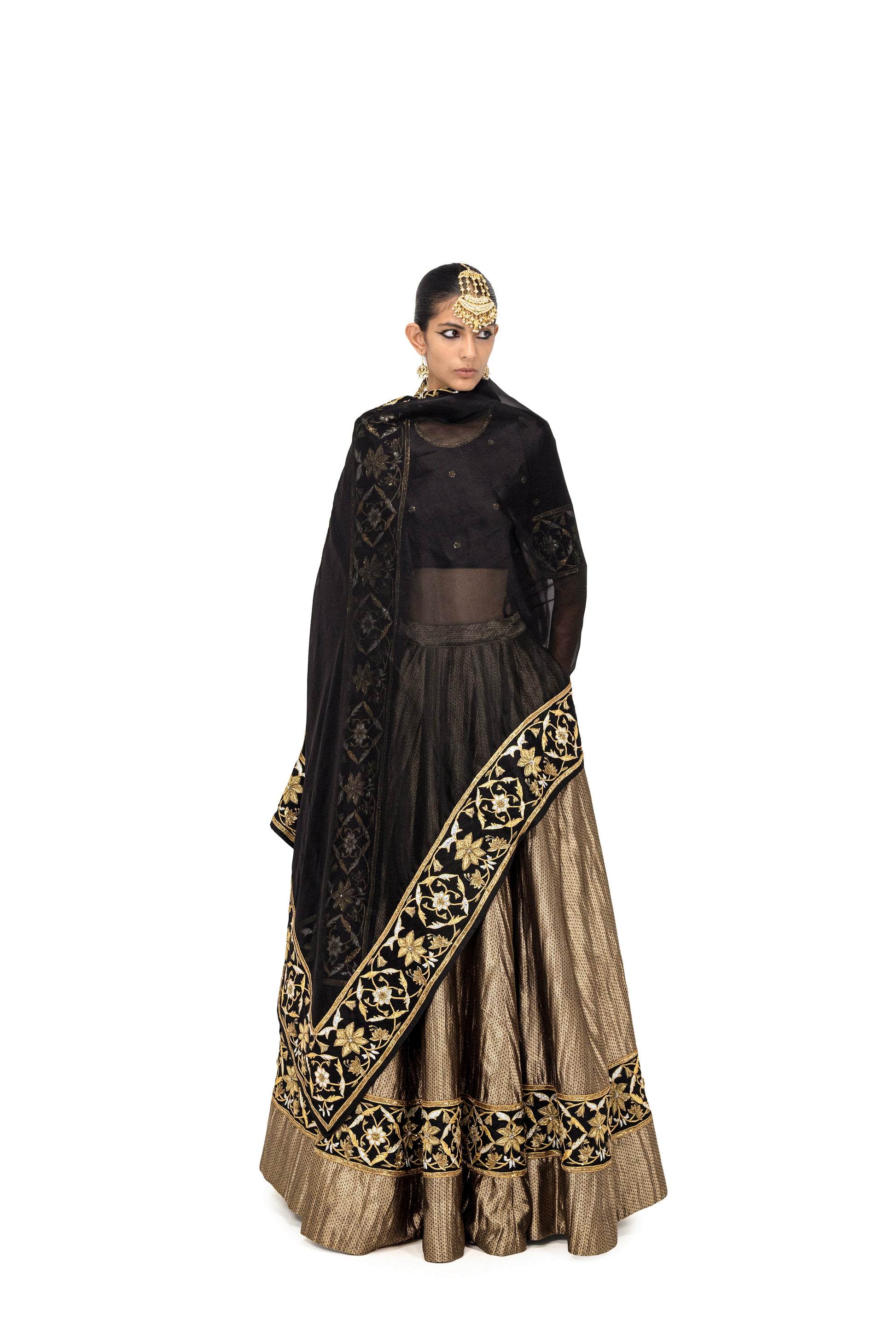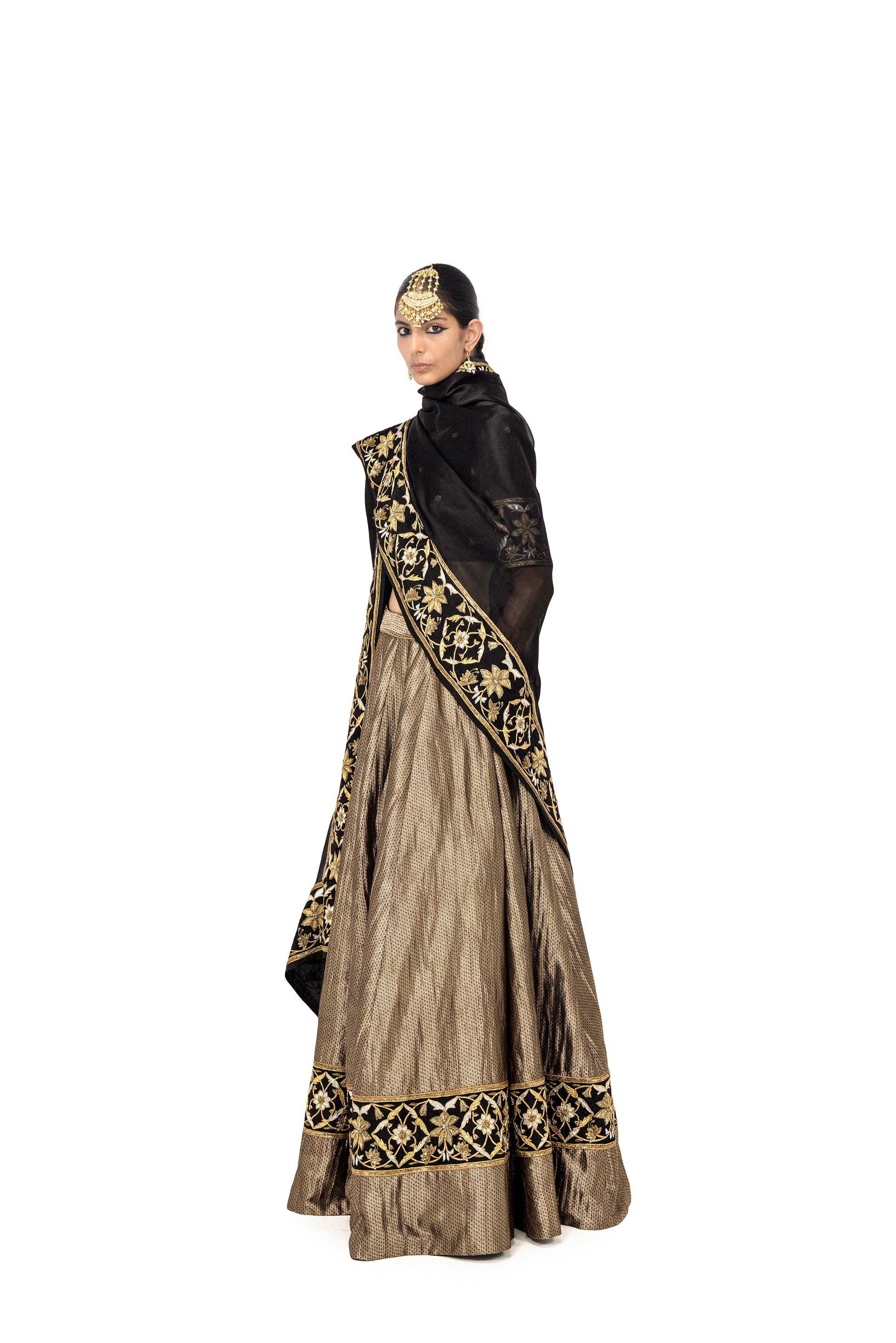 ‘Bagseu' black silk organza odhani echoes the marble inlay work seen in Mughal architecture. The border is embroidered in zardozi, along with silver and gold gota appliqué, speaking to the Ganga Jamuni tehzeeb of the Awadh.