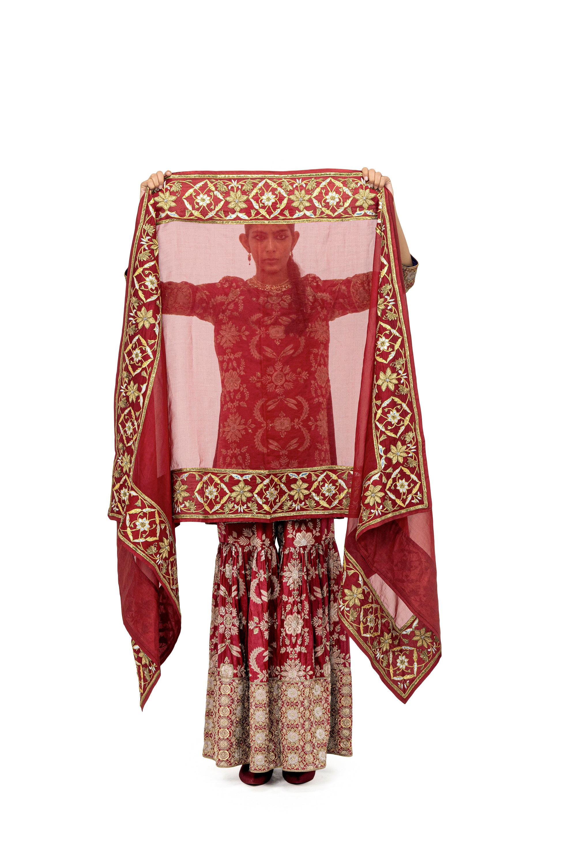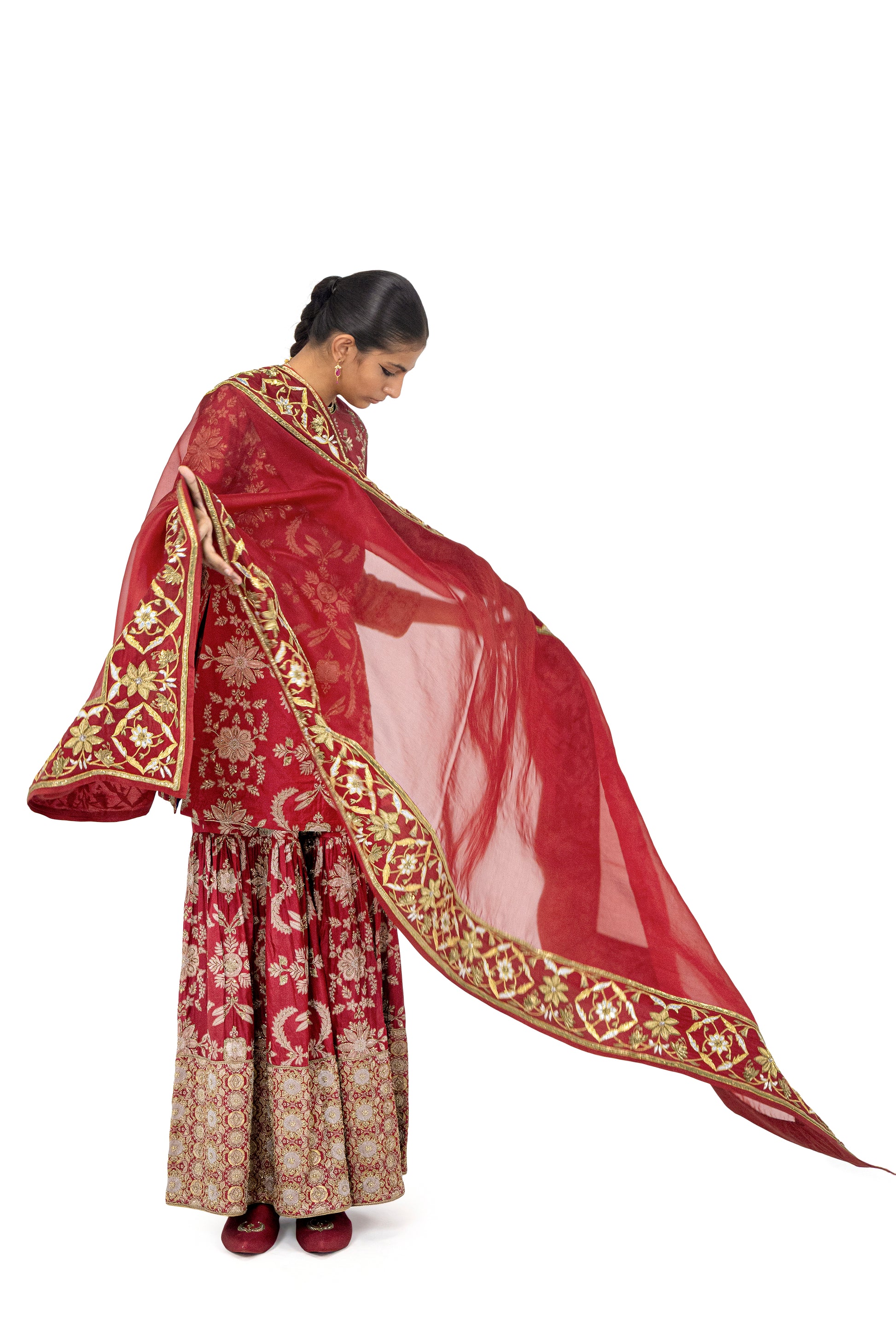 ‘Bagseu' red silk organza odhani echoes the marble inlay work seen in Mughal architecture. The border is embroidered in zardozi, along with silver and gold gota appliqué, speaking to the Ganga Jamuni tehzeeb of the Awadh.