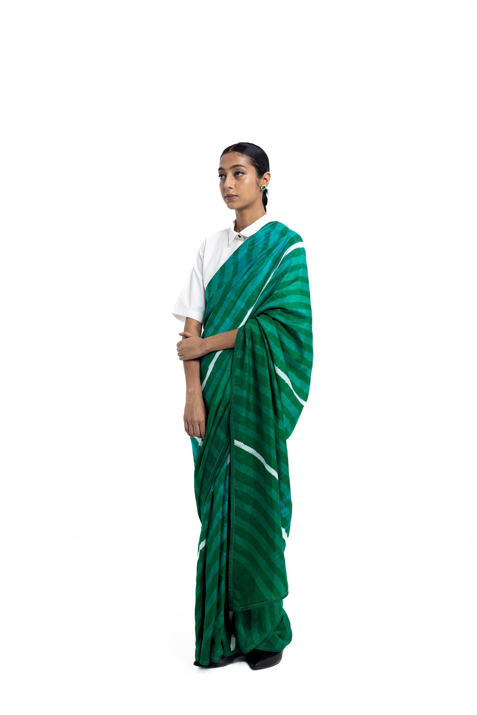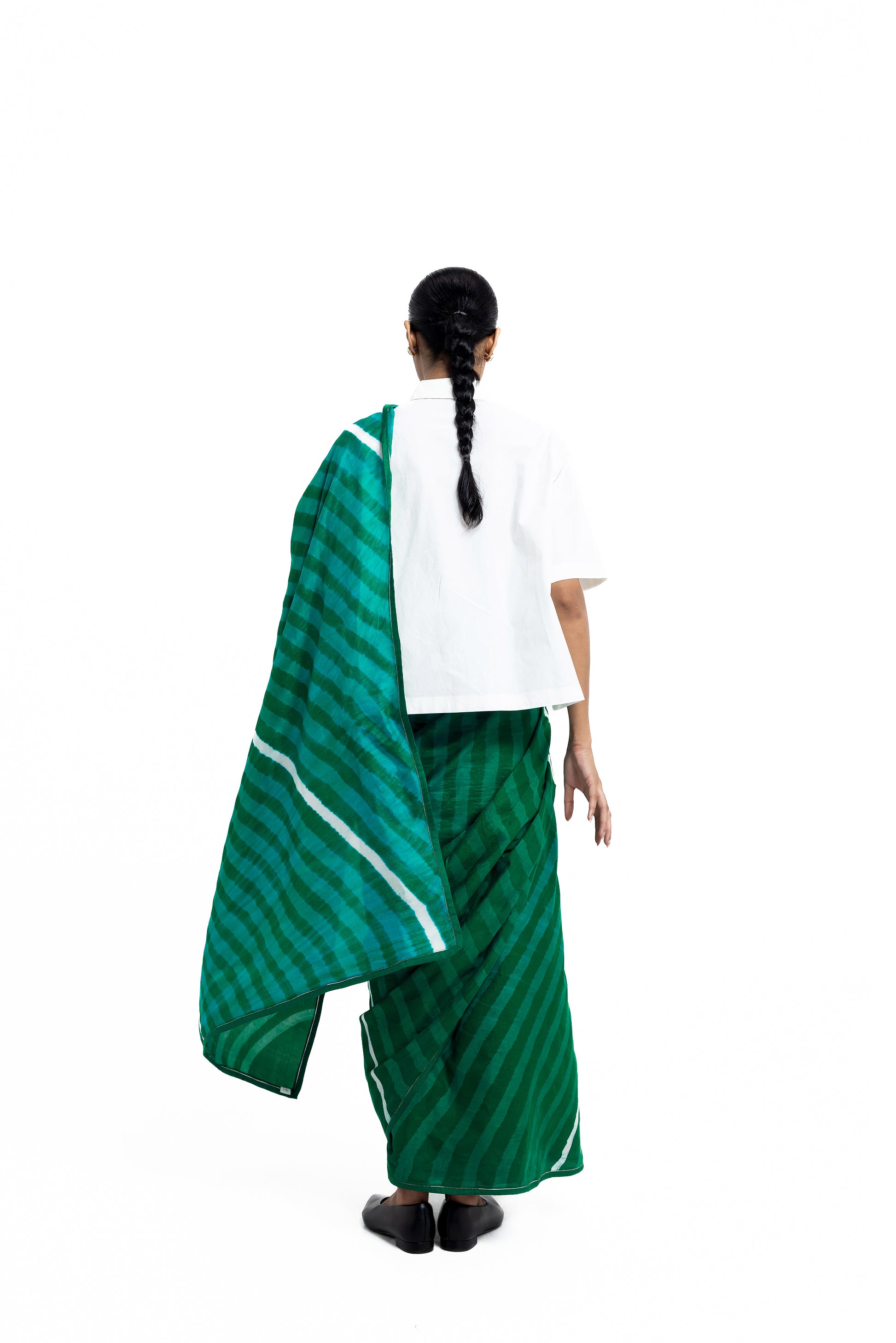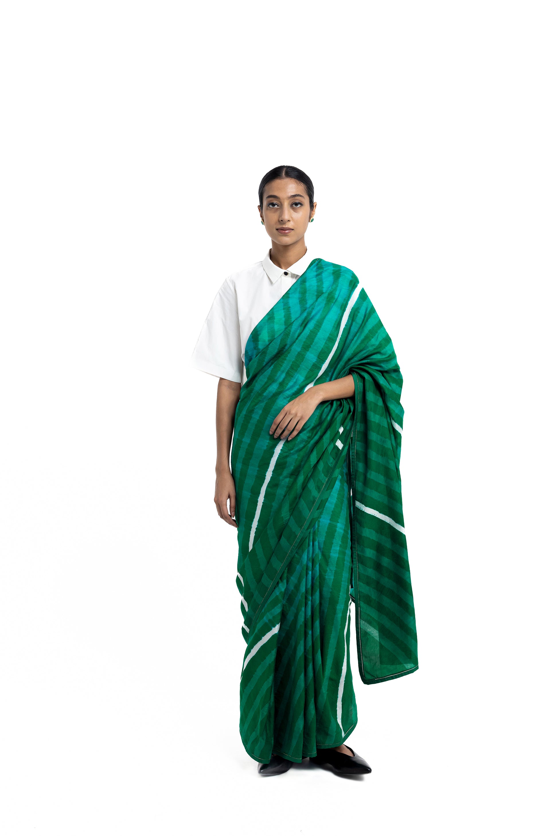 ‘Balotra’ silk sari features dyed stripes in emerald and forest green punctuated with white, drawing from 'Pachranga', which is a Laheriya striped pattern composed of five colors.