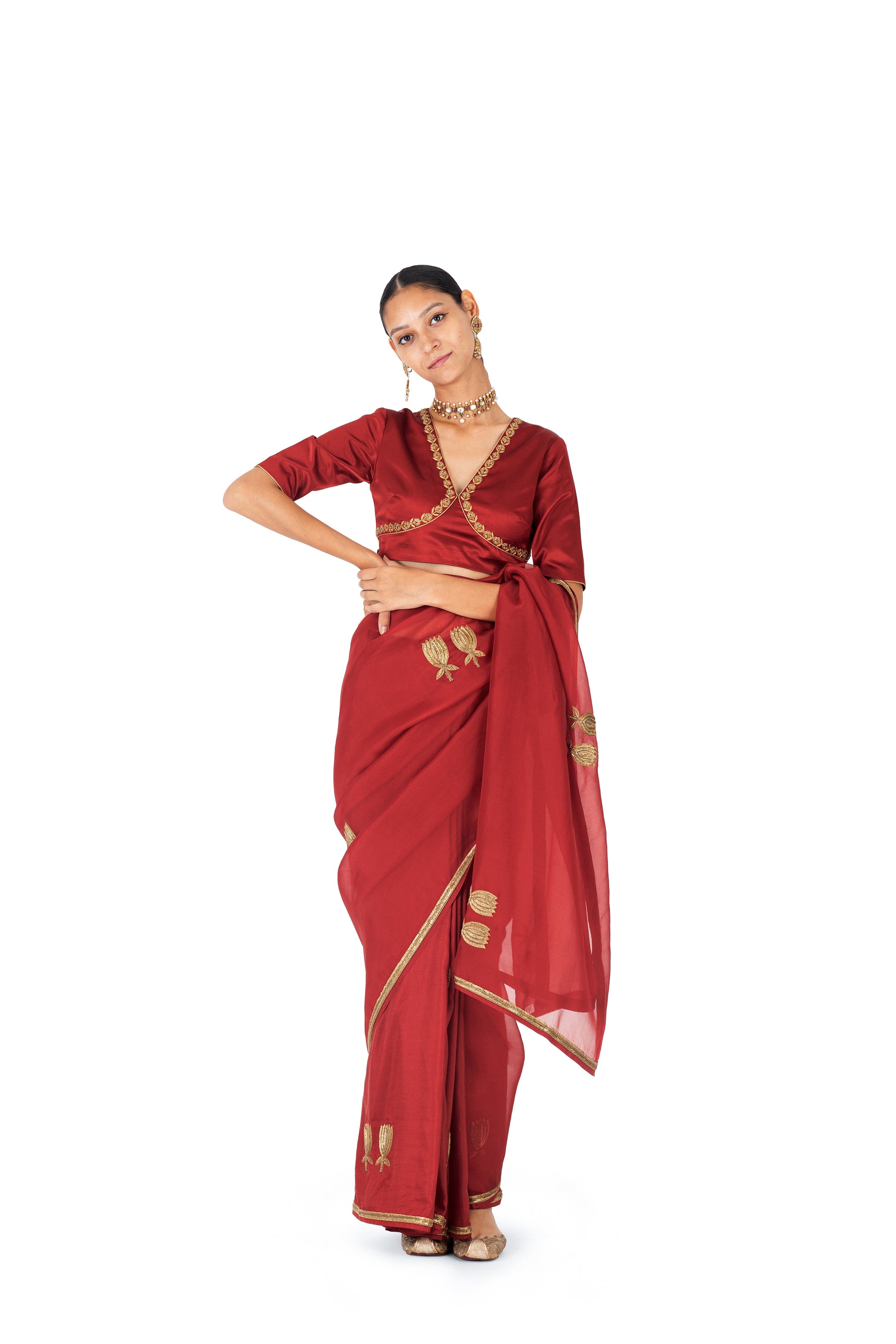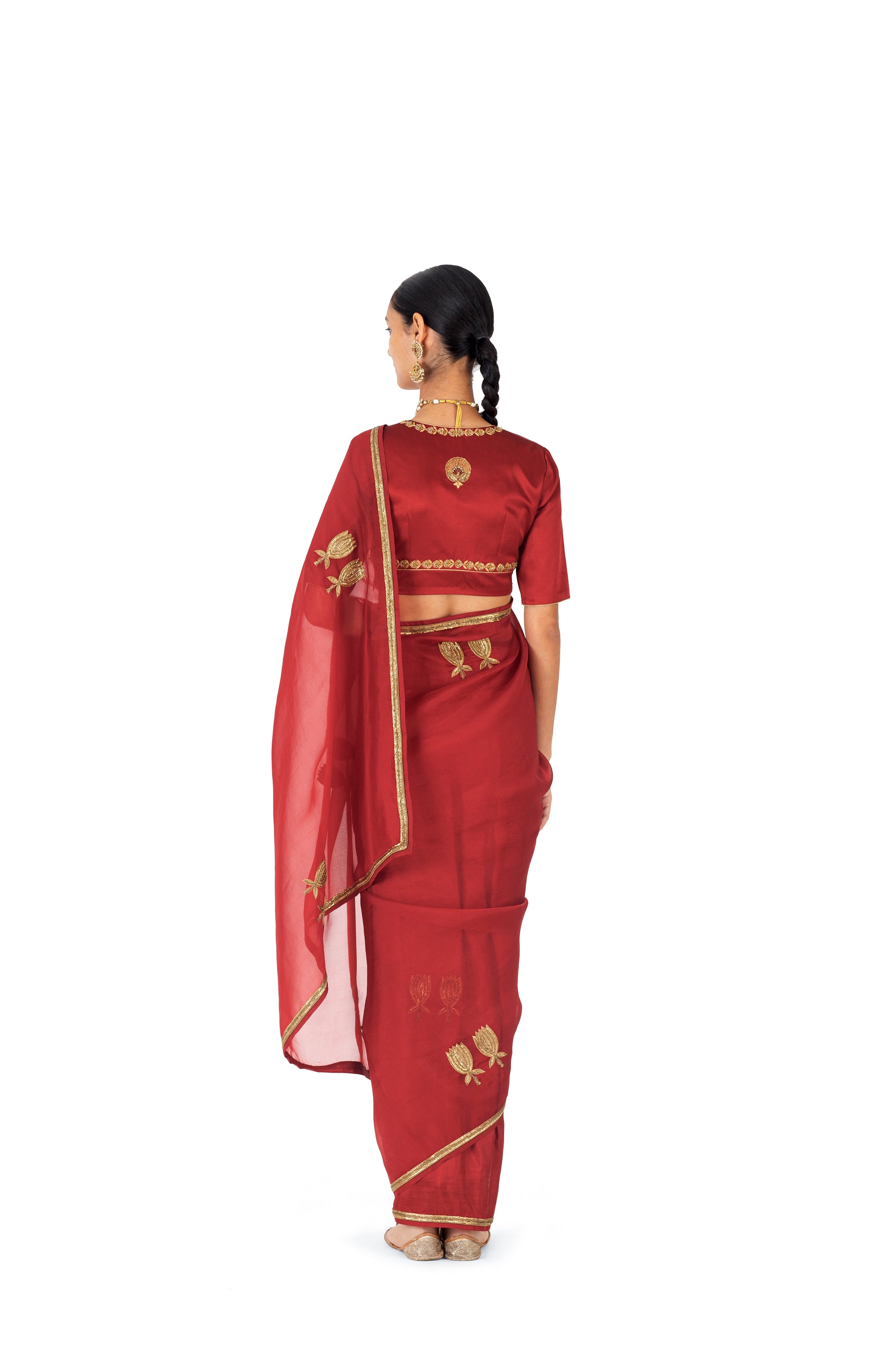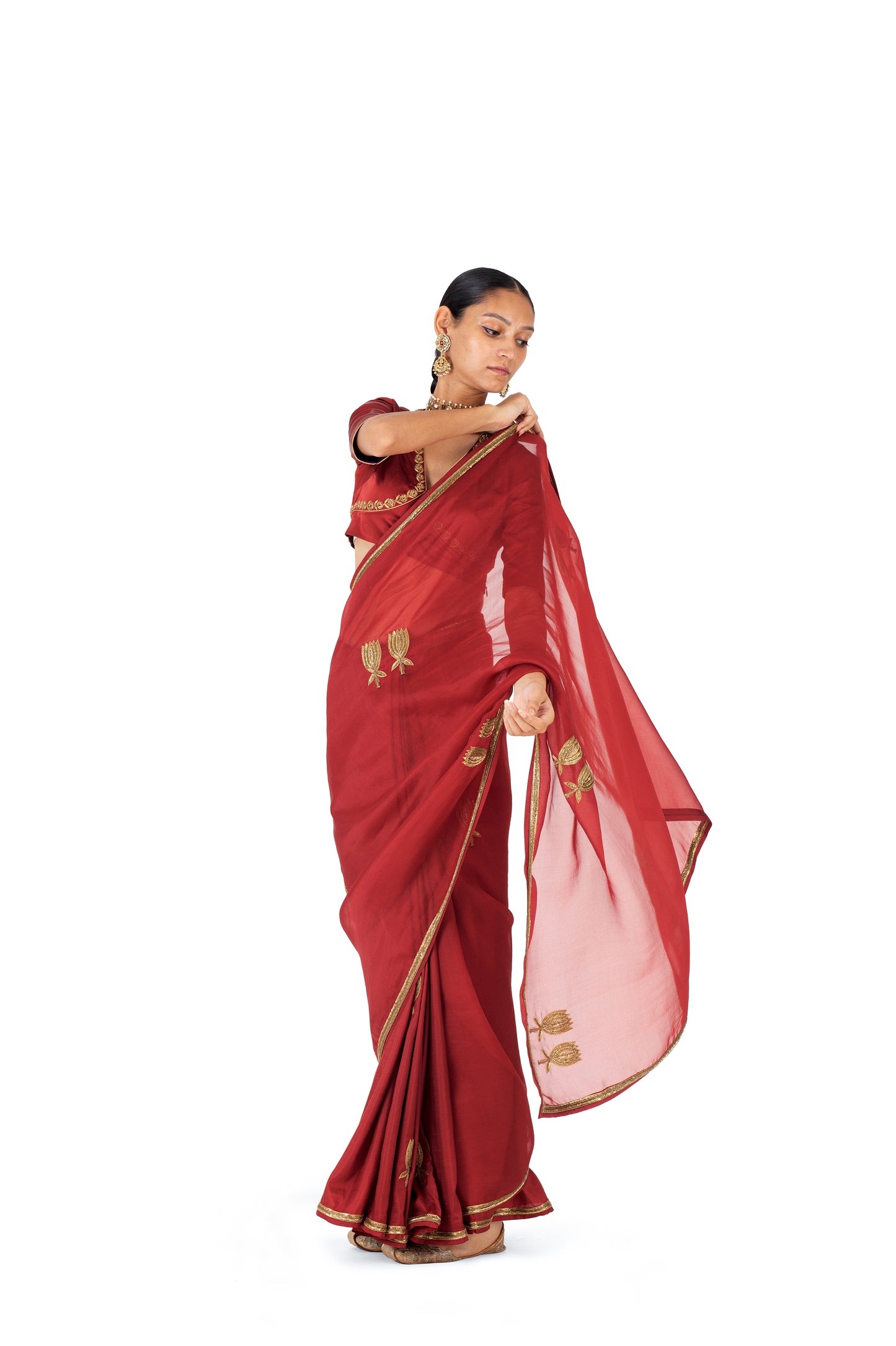 ‘Bondir’ red sari is made through the joinery of textiles: sheer organza silk and plain silk, which allows for a better suited drape and fall. It features lotus motifs and border in sequins and zari.