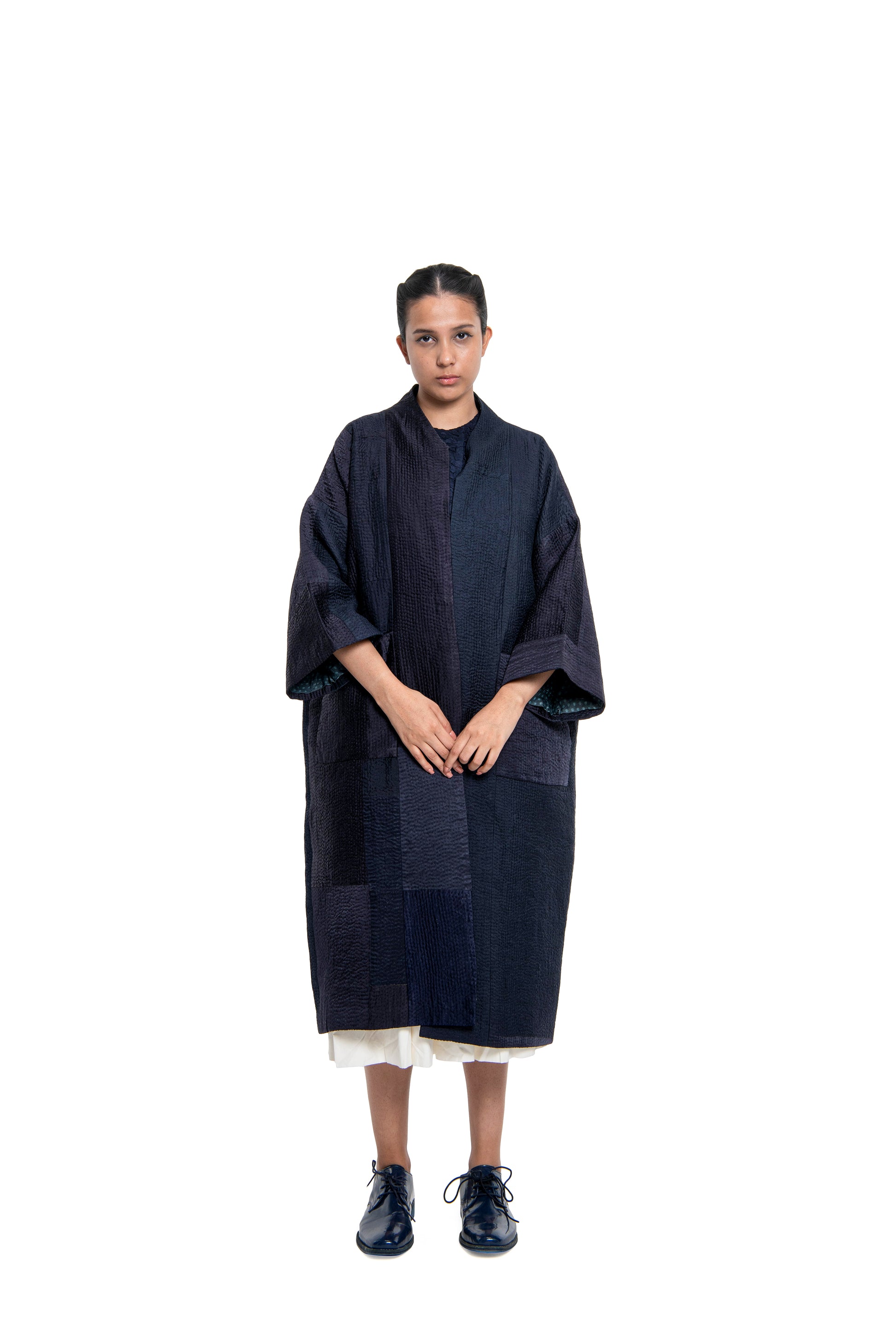 'Chaitanya' Jacket from Raw Mango AGAMA is crafted from silk katran - small strips of textile that are placed together. A silhouette that draws from those seen by nomadic tribes in Central Asia, this jacket features all over quilting. The silk inner lining gives the garment an element of quiet surprise.
