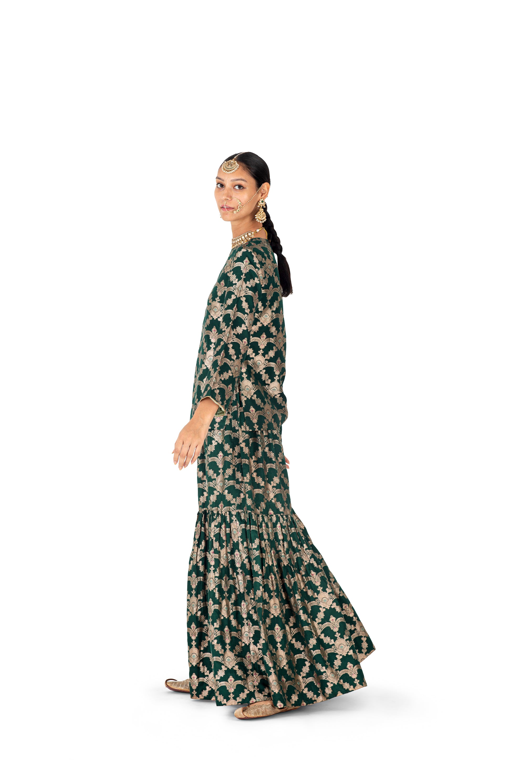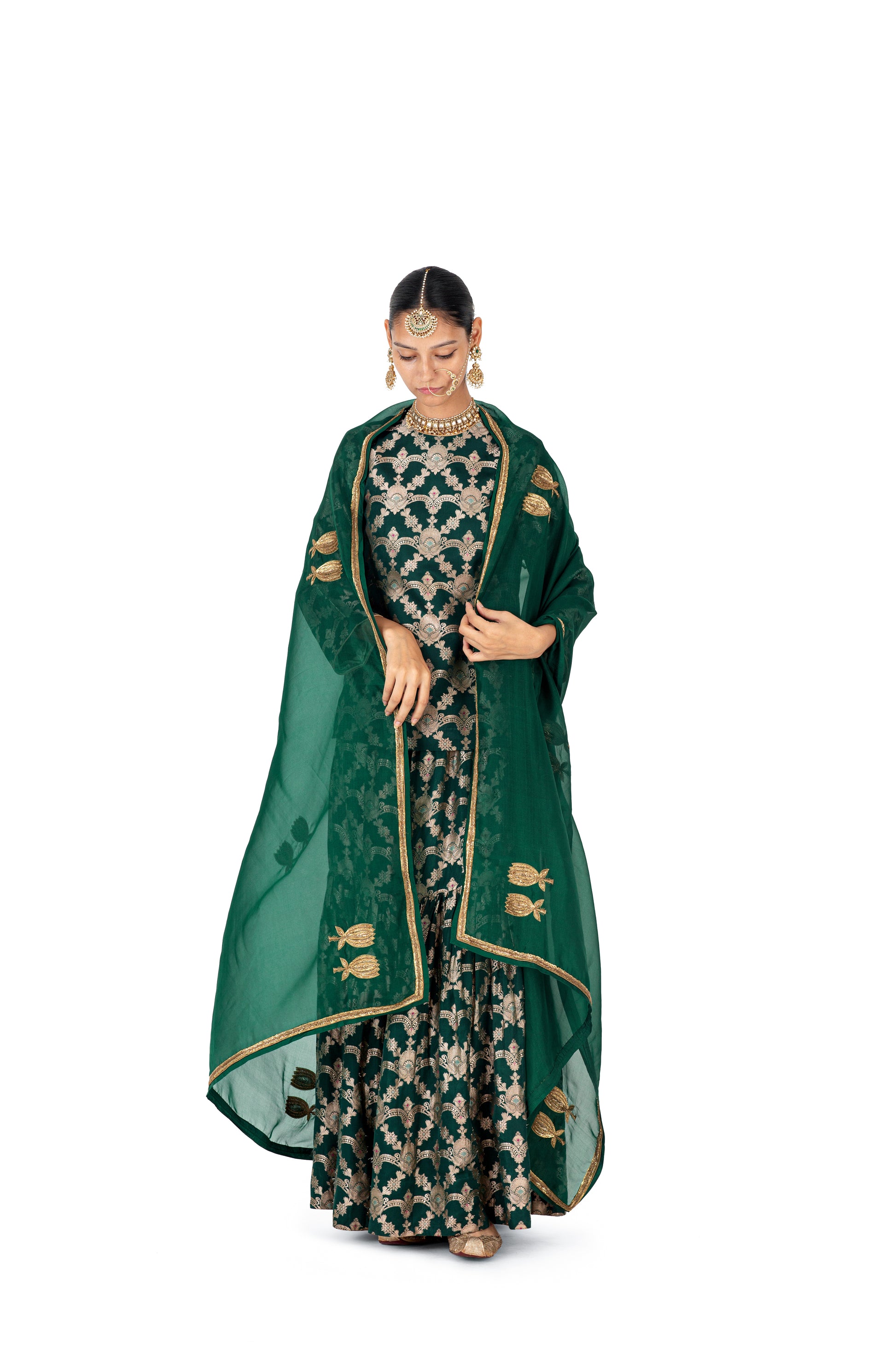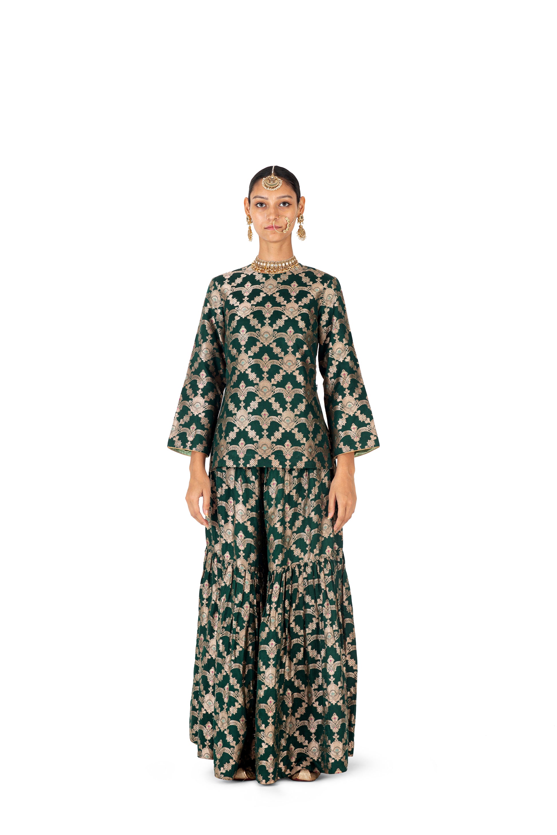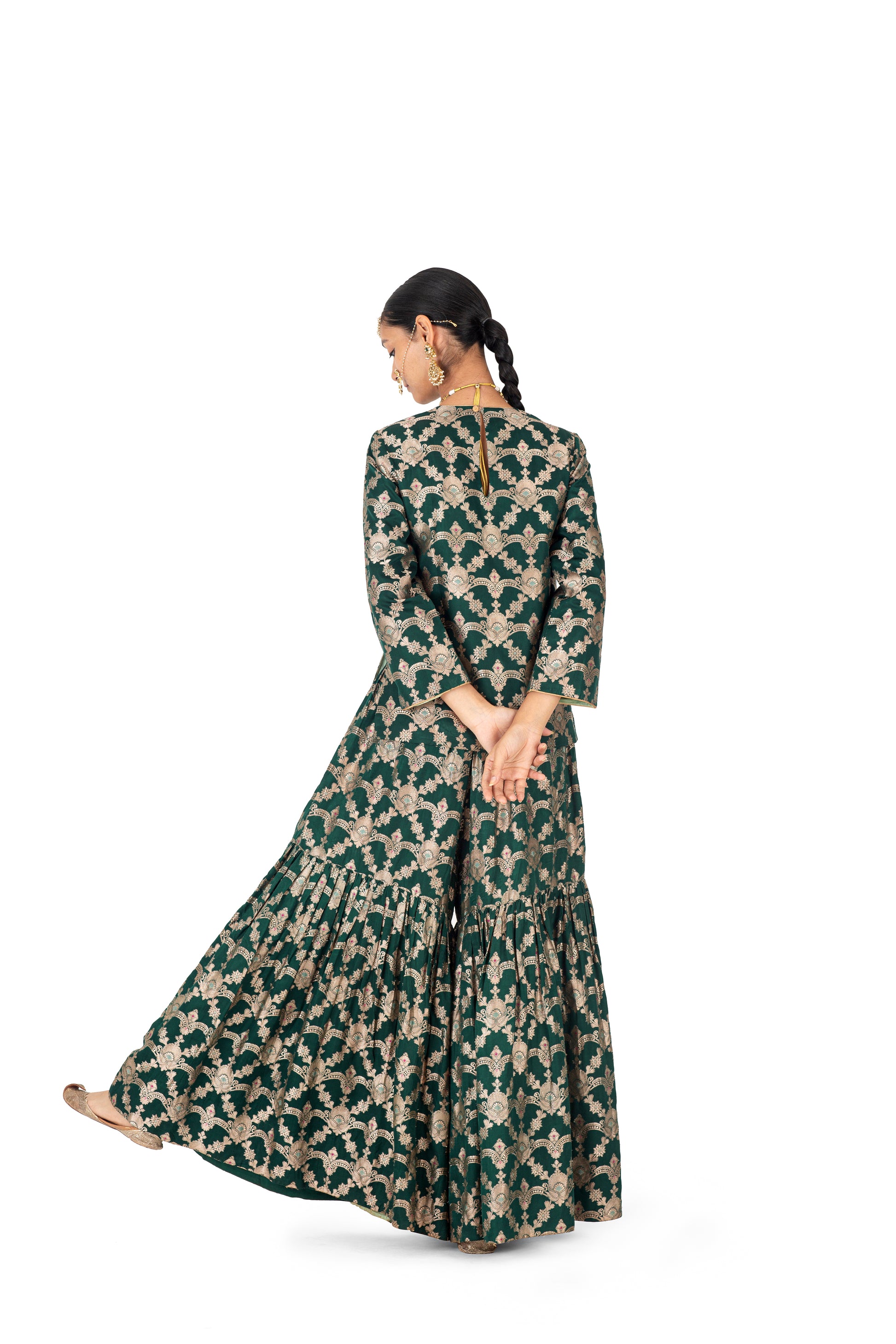 Varanasi silk brocade green 'Corla' short kurta and 'Talpona' garara with a ghera feature all over floral grid jaal.