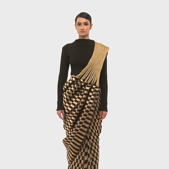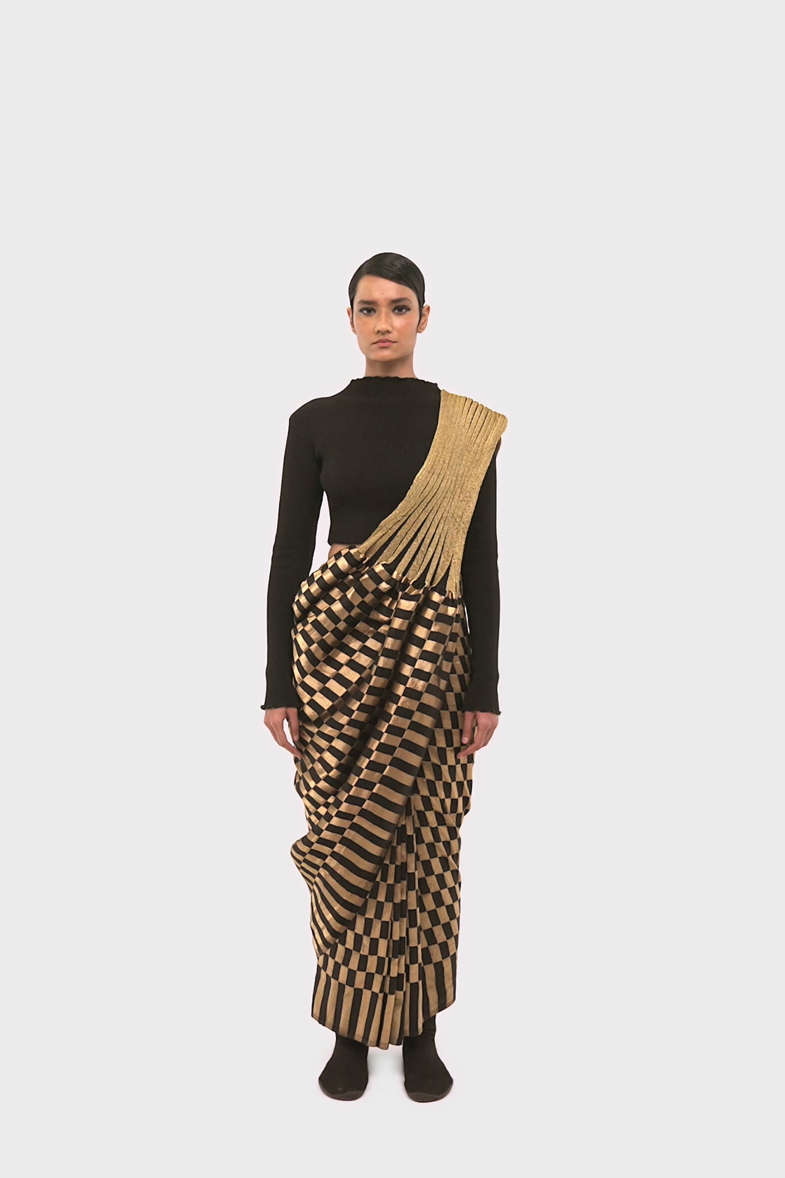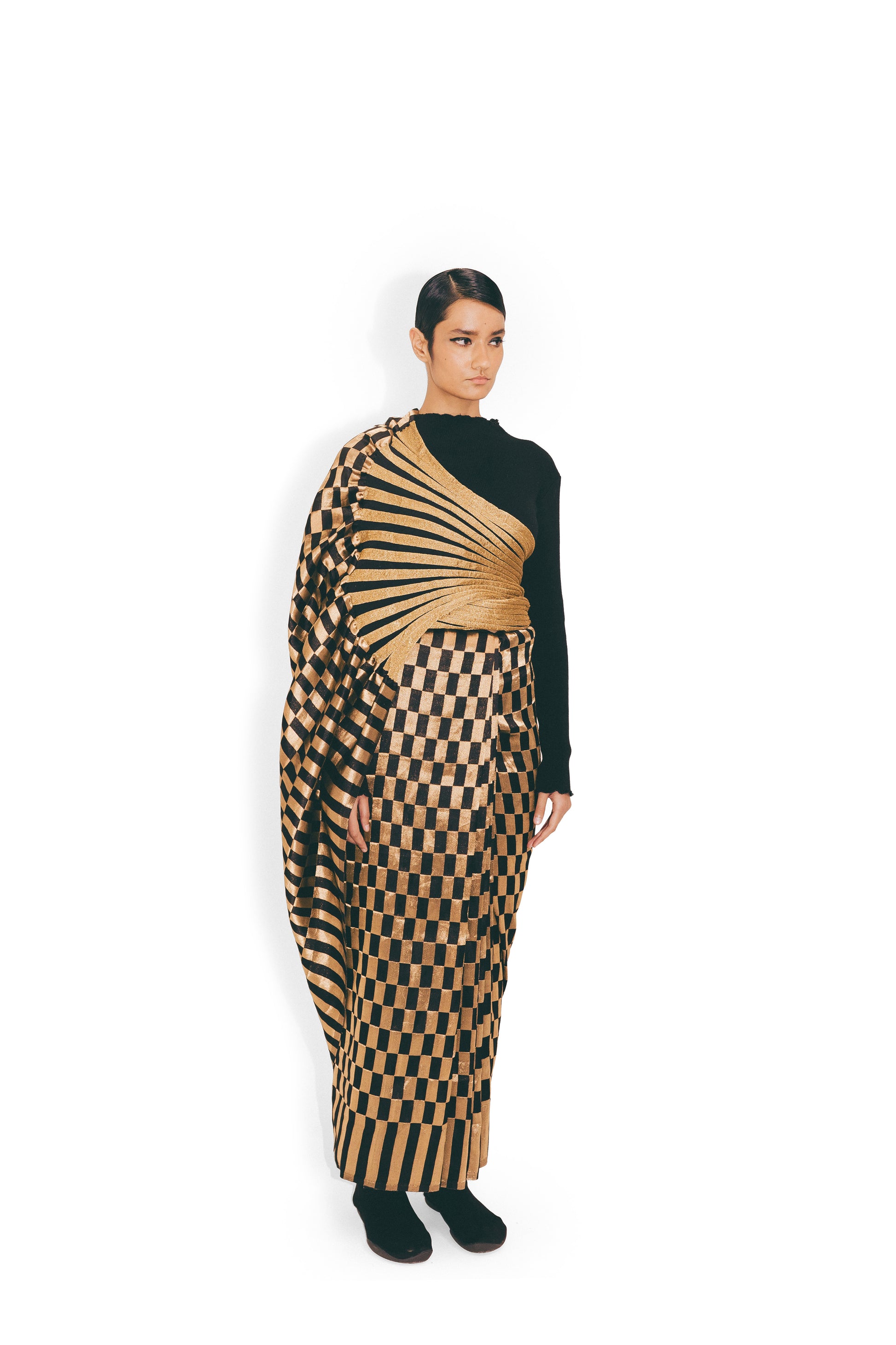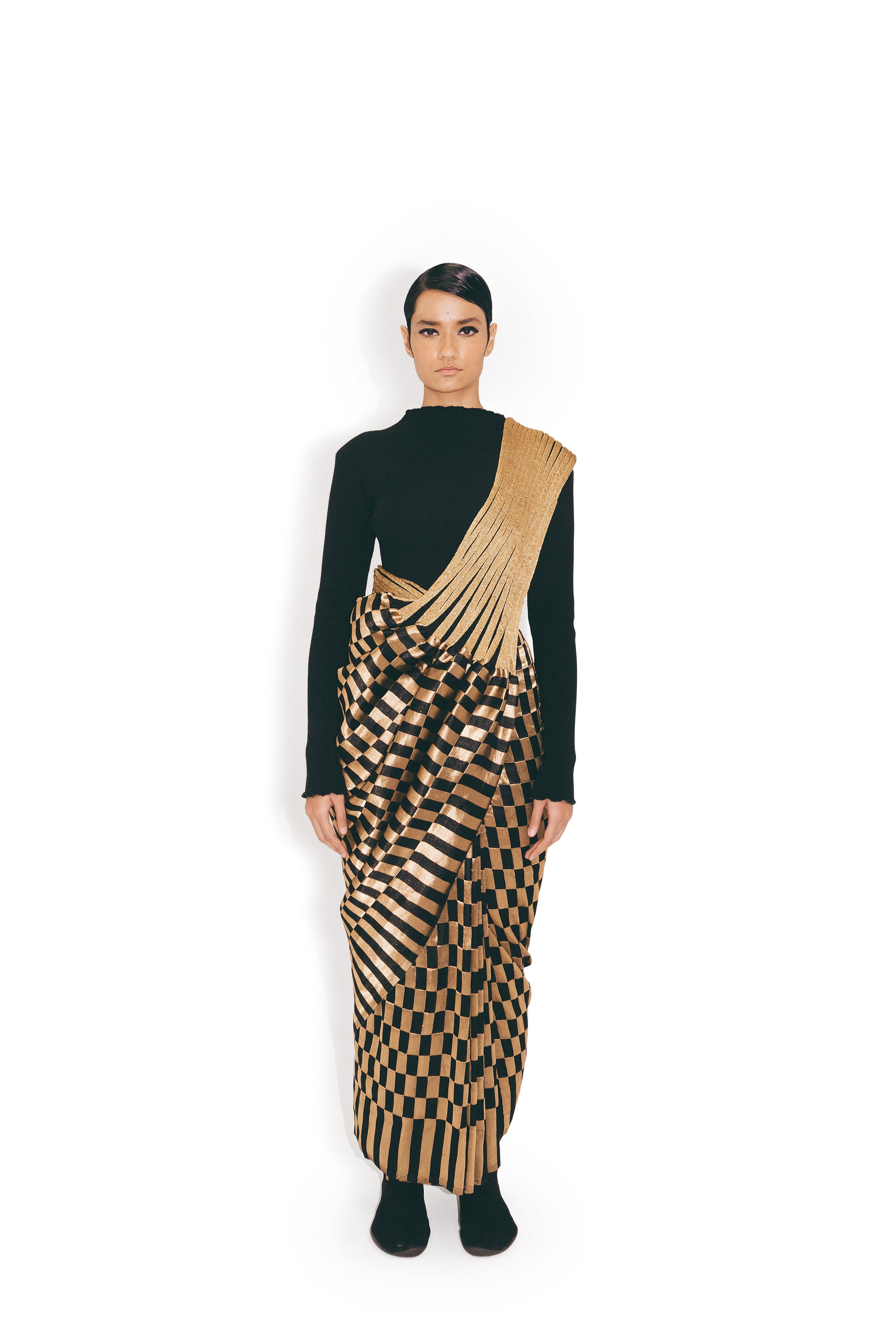 The Dee sari is developed as a contemporary take on the conventional checked sari. The body features a checked weave that transitions into stripes along the border and palla. The palla further incorporates lycra in the weft, allowing the textile to gather and stretch, giving it a flexible, adaptive quality.