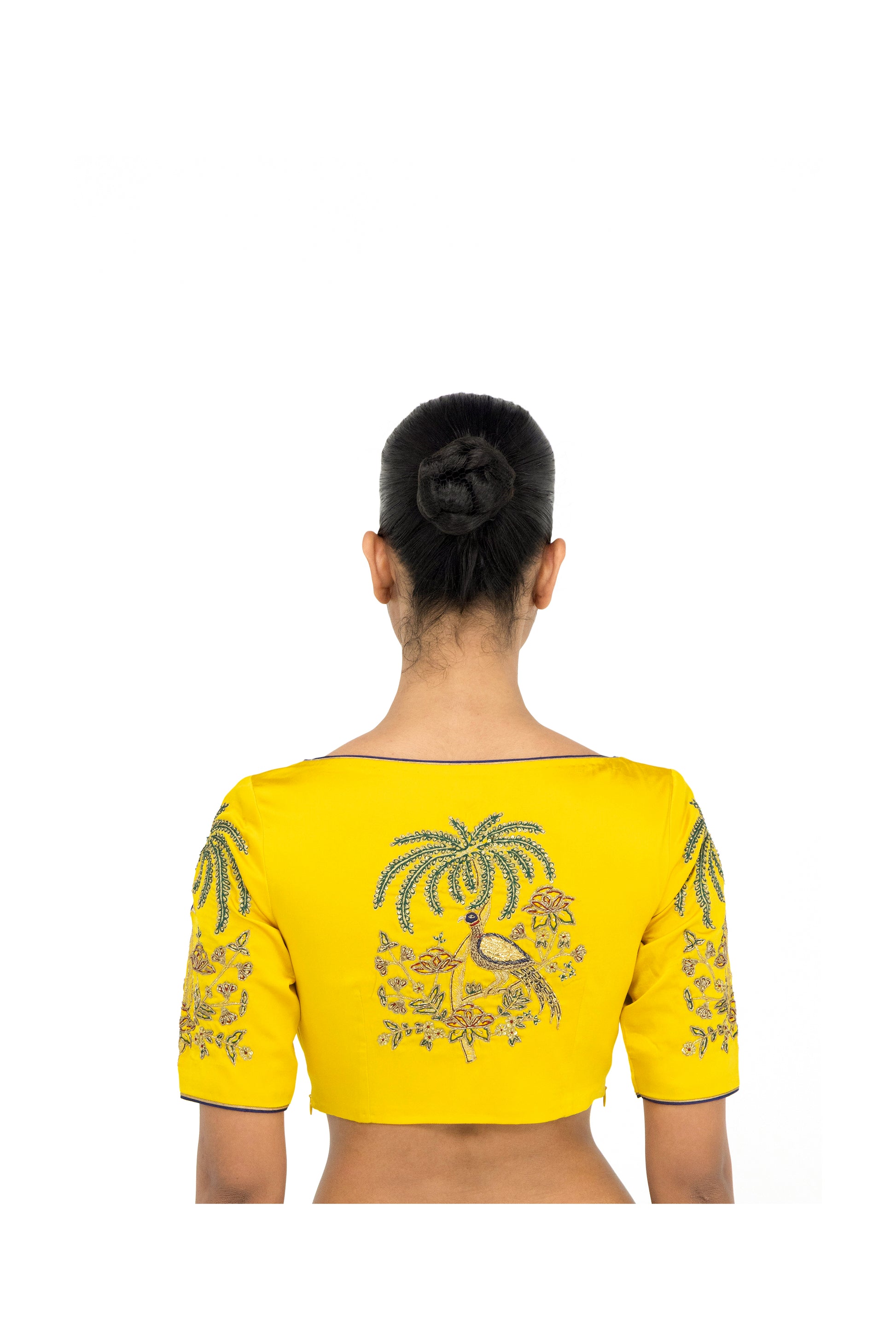 'Degana' yellow blouse in silk satin features palm trees surrounded by foliage and peacocks - realised in zardozi embroidery and aari work with red, green and blue meena - placed at the sleeves.