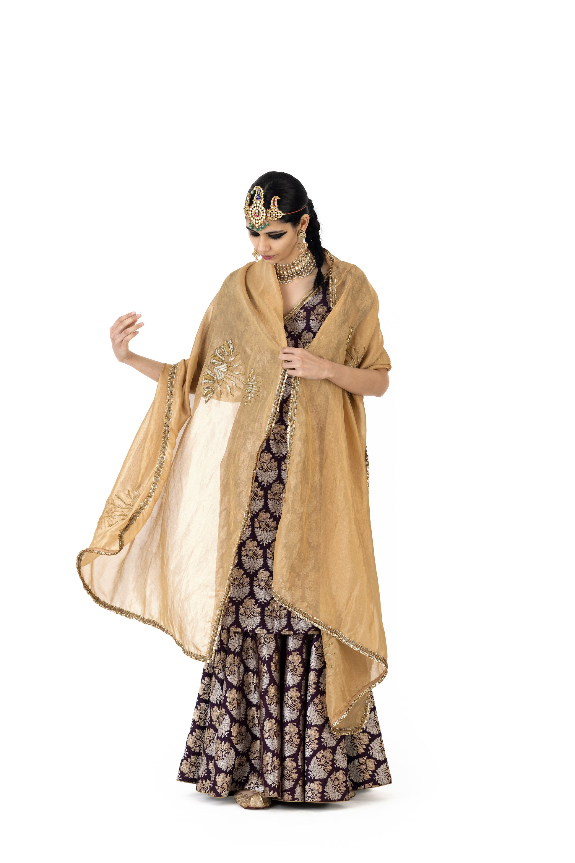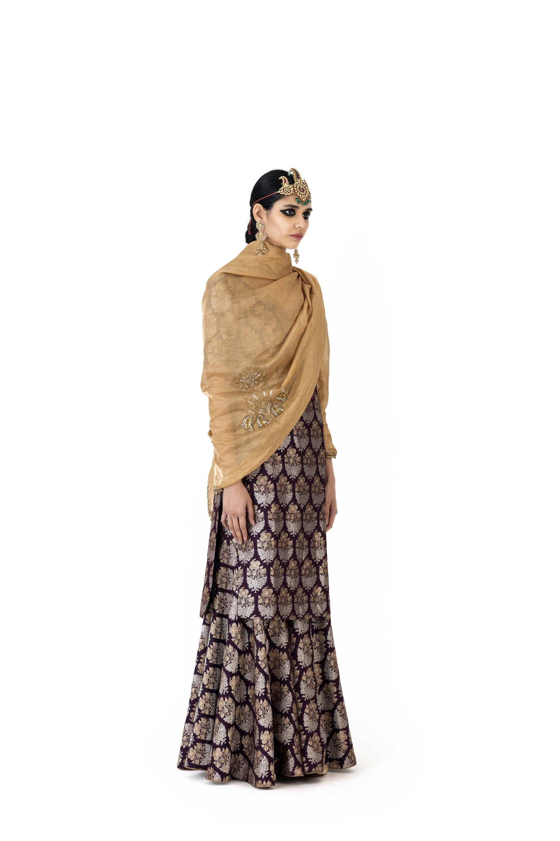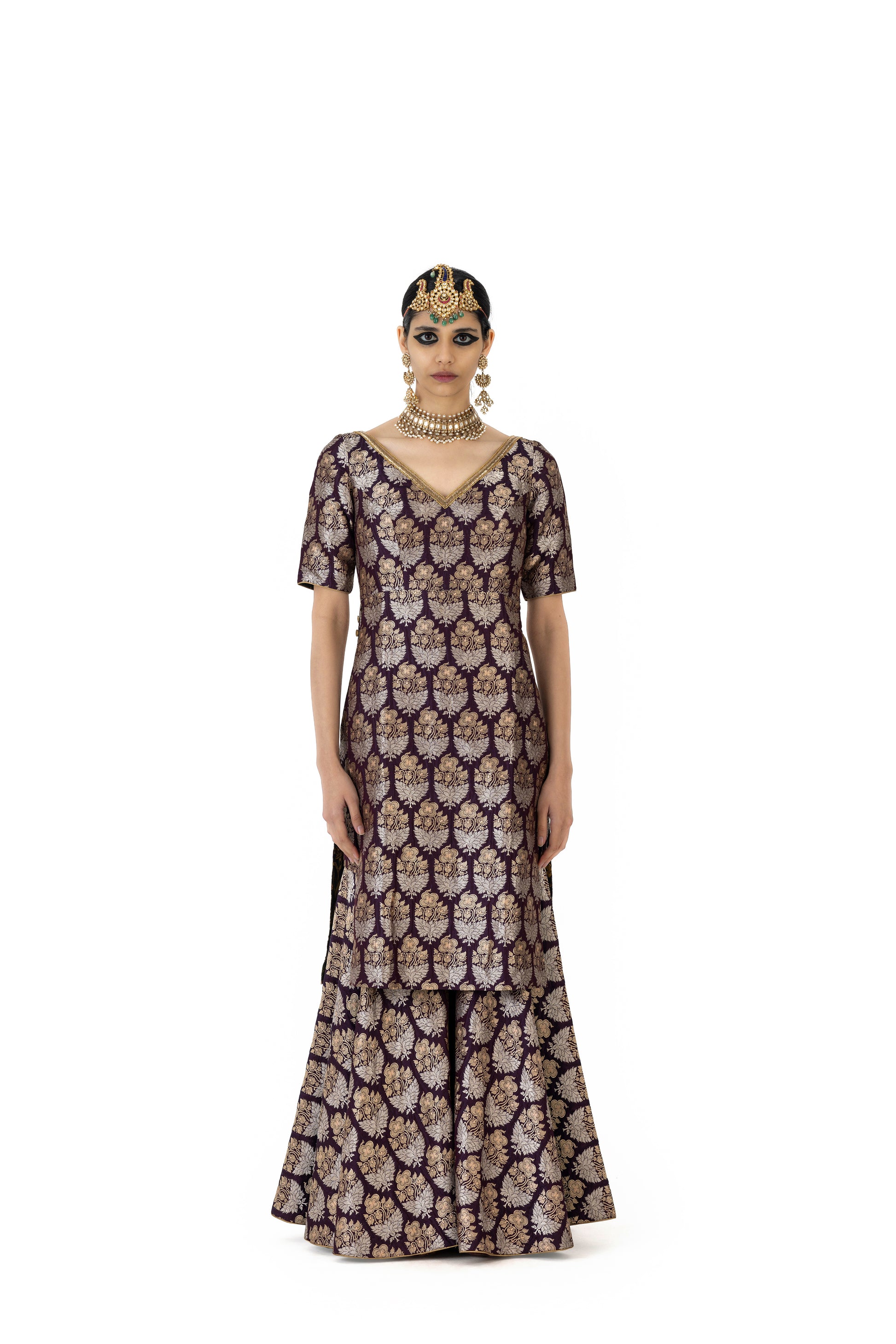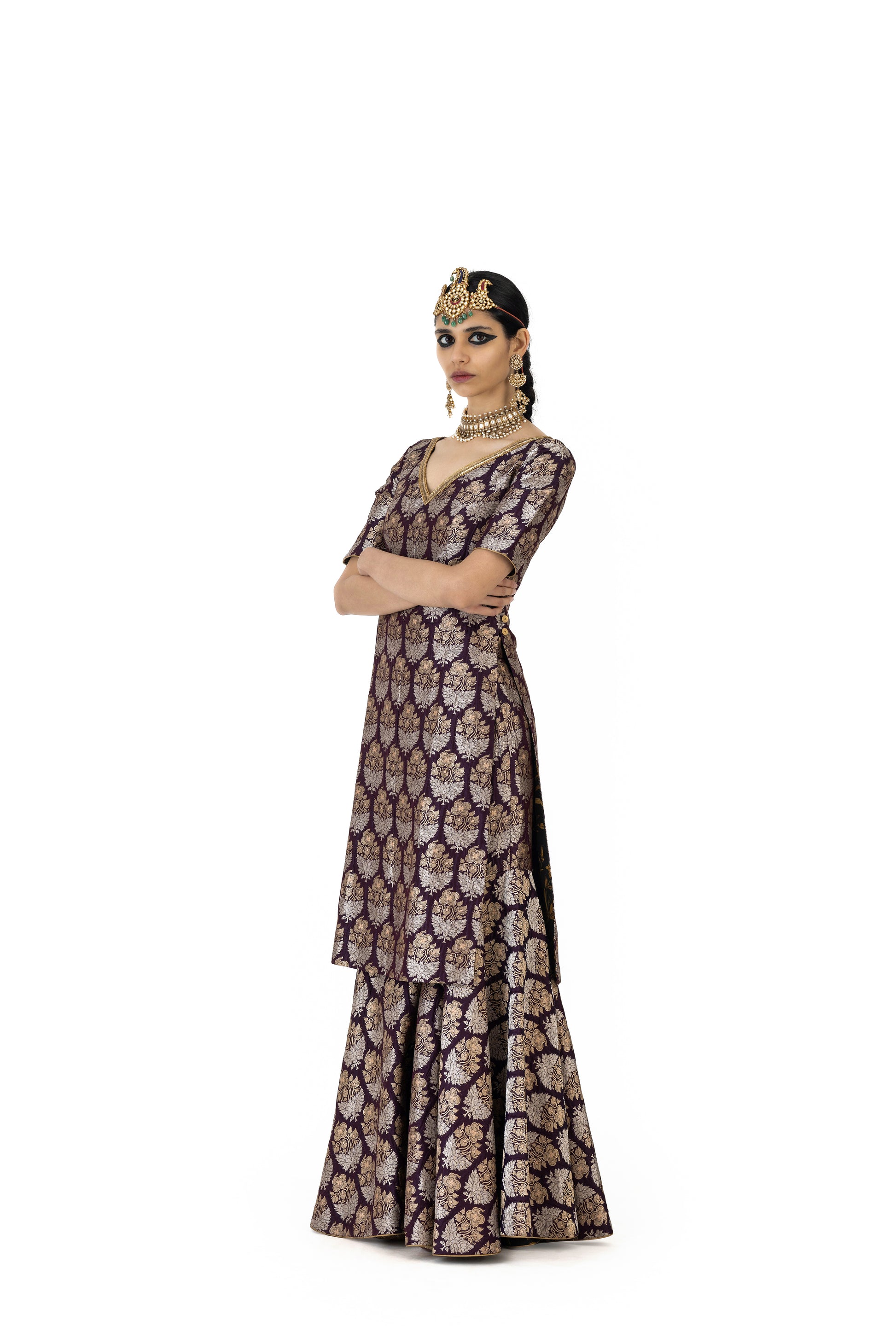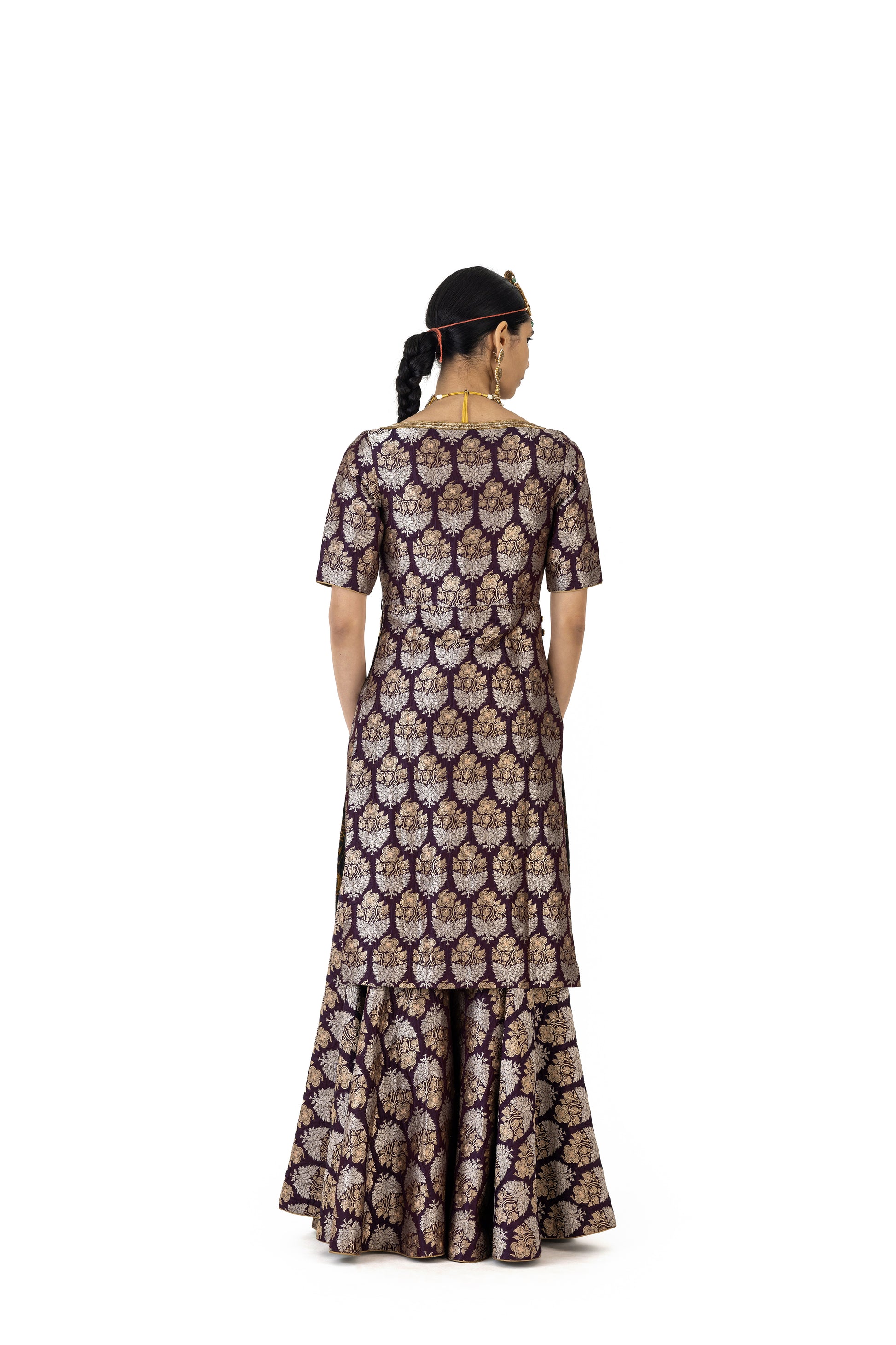 ‘Devdatta’ kurta and ‘Santati’ sharara are crafted in Varanasi silk brocade that is drawn from our archives using the Kadwa technique, where each motif is woven separately. The textile features the play of Meenakari on floral butas.