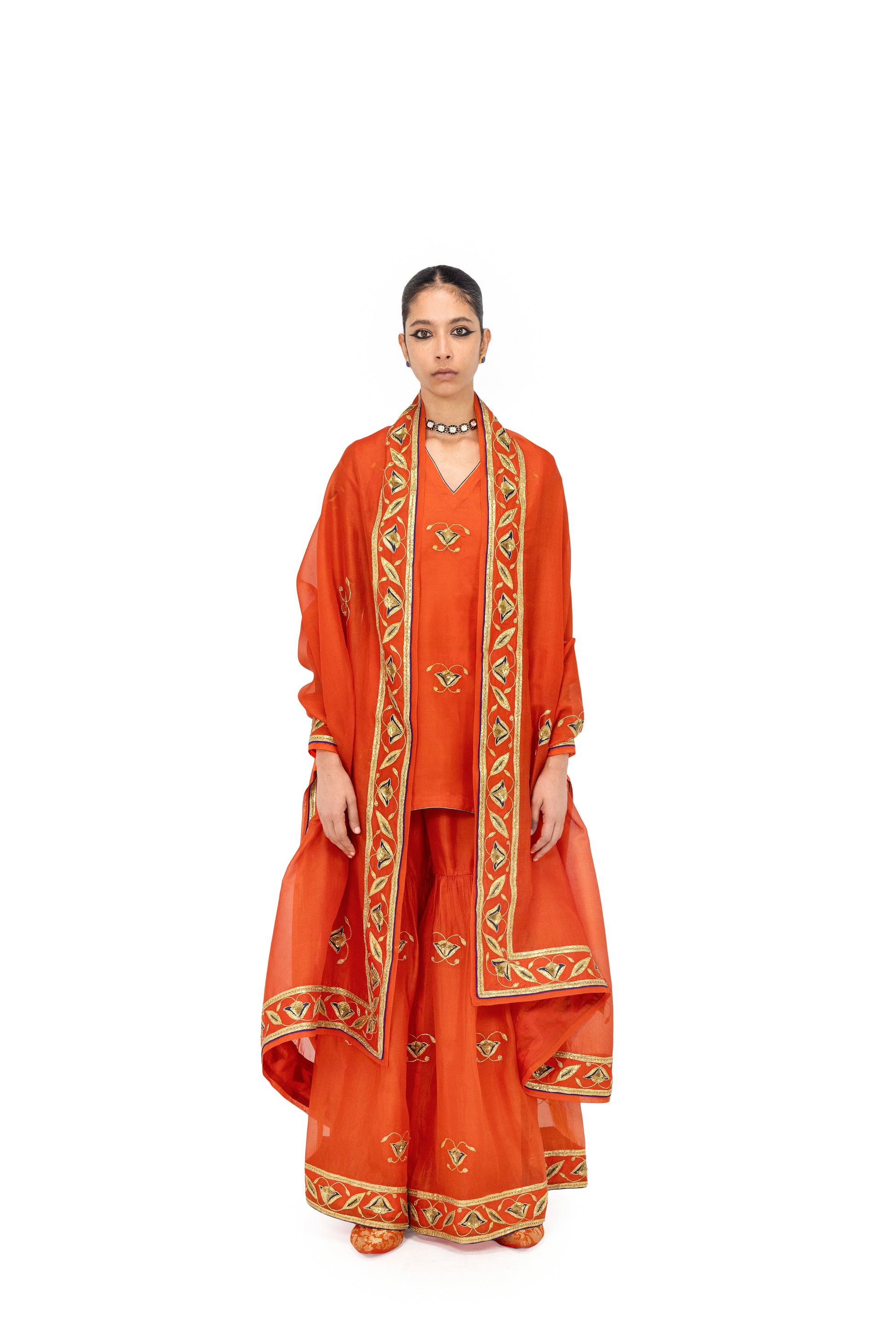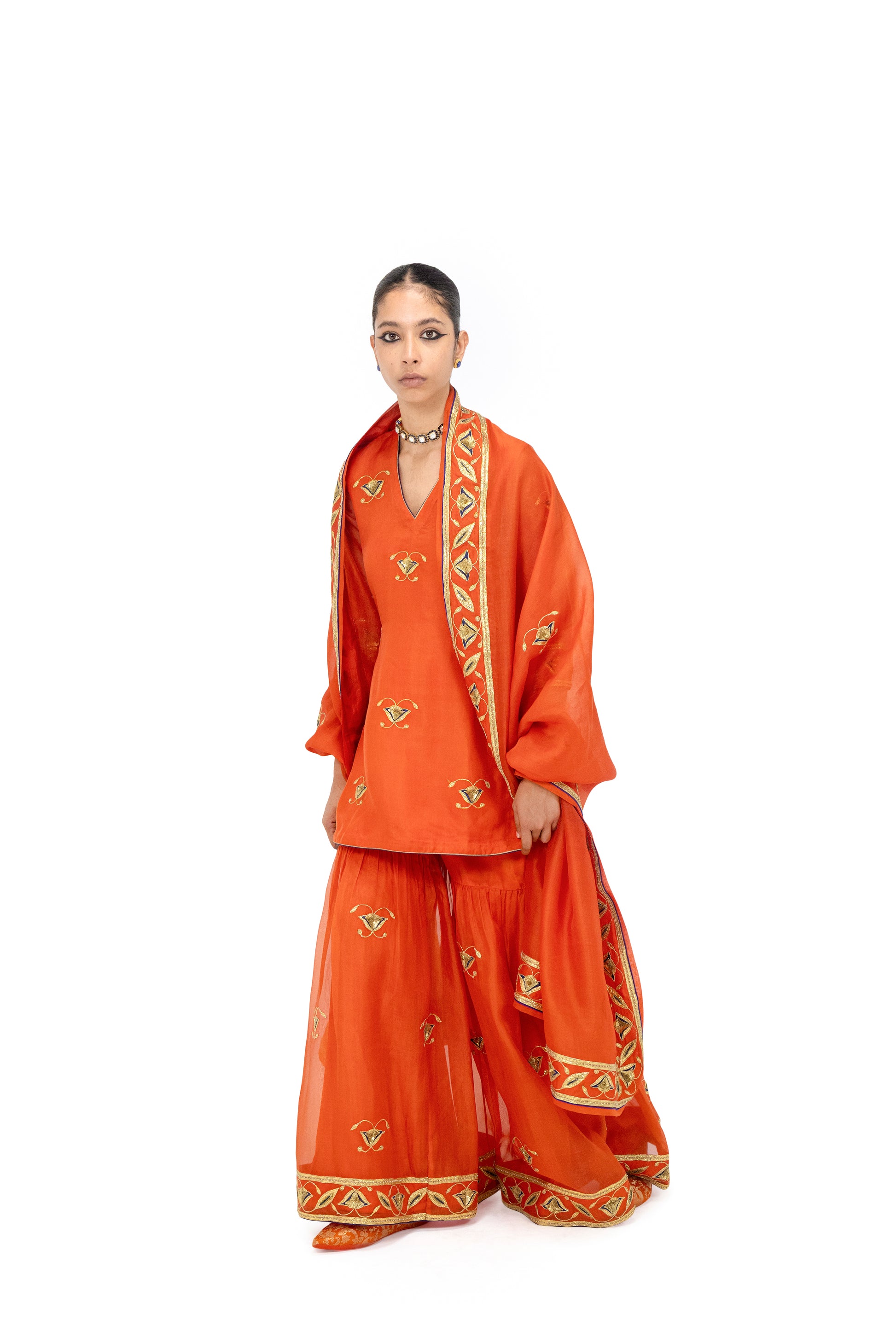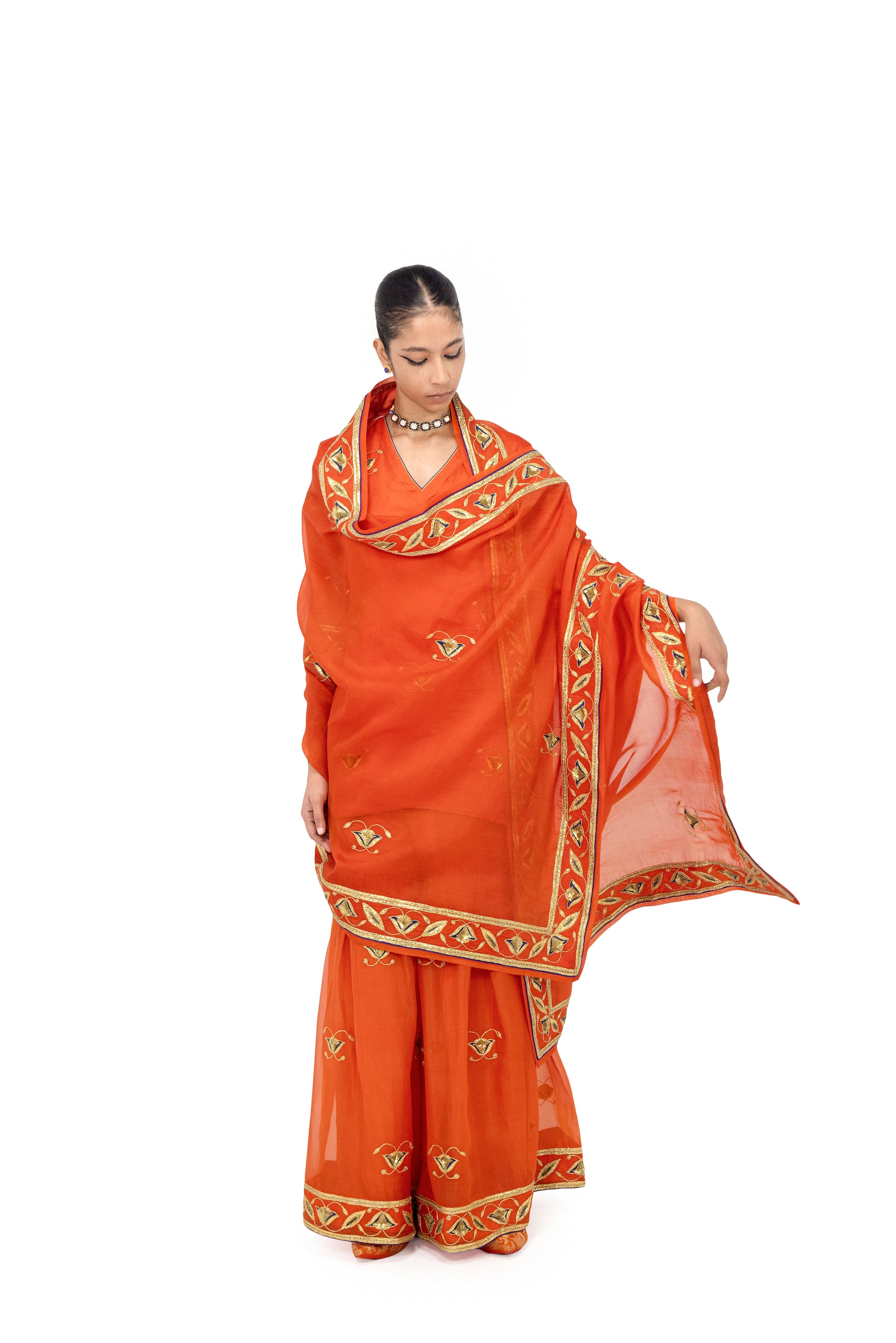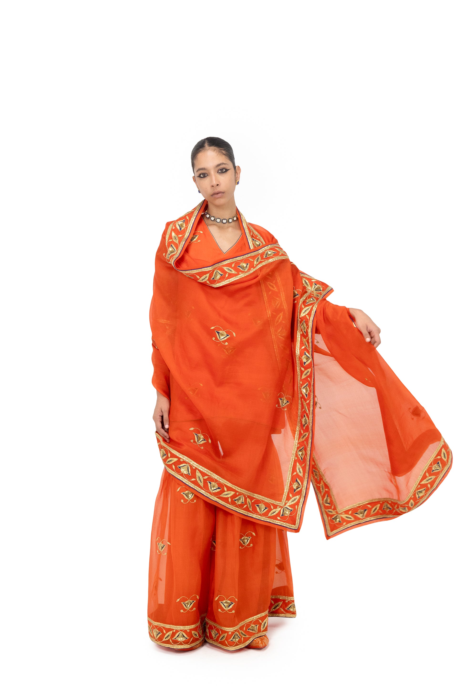 'Dharnok' gerua orange odhani in silk organza features floral butis and borders that echo those seen in Rajasthani bandhini textile archives - with gold zardozi embroidery and deep indigo meenakari.