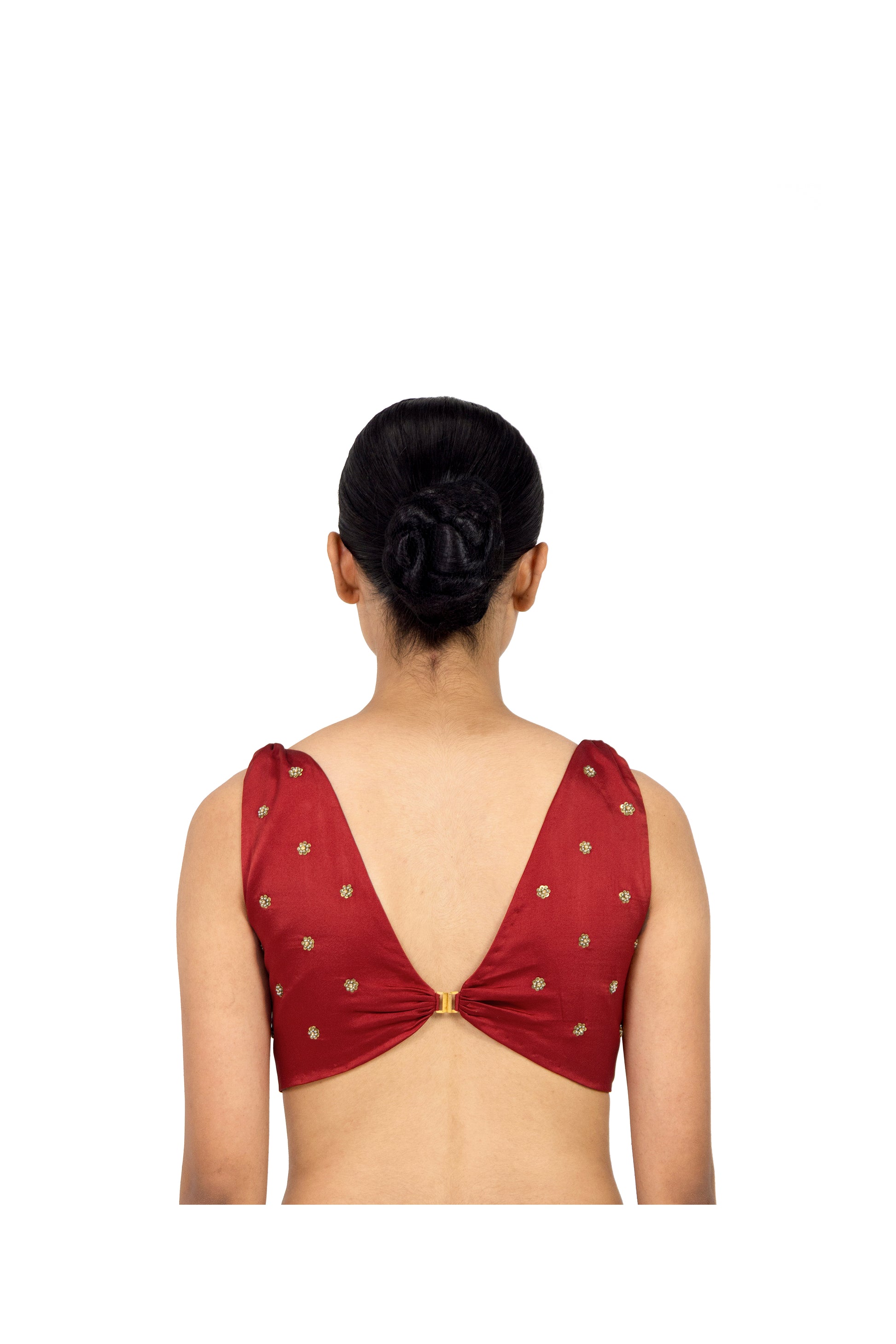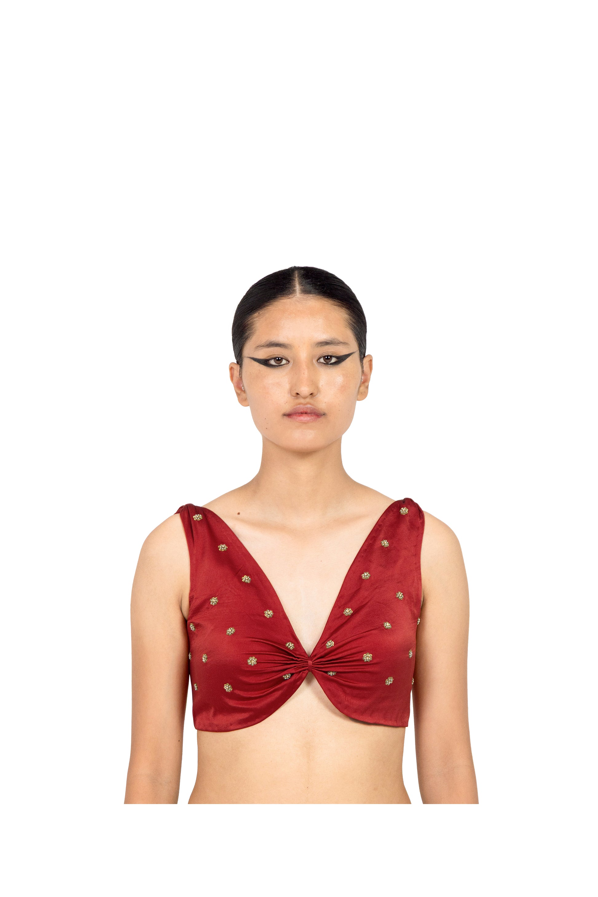 'Ewad' red blouse in silk satin is gathered at the shoulders and the center of the bust, and features an all-over placement of small zardozi flowers.