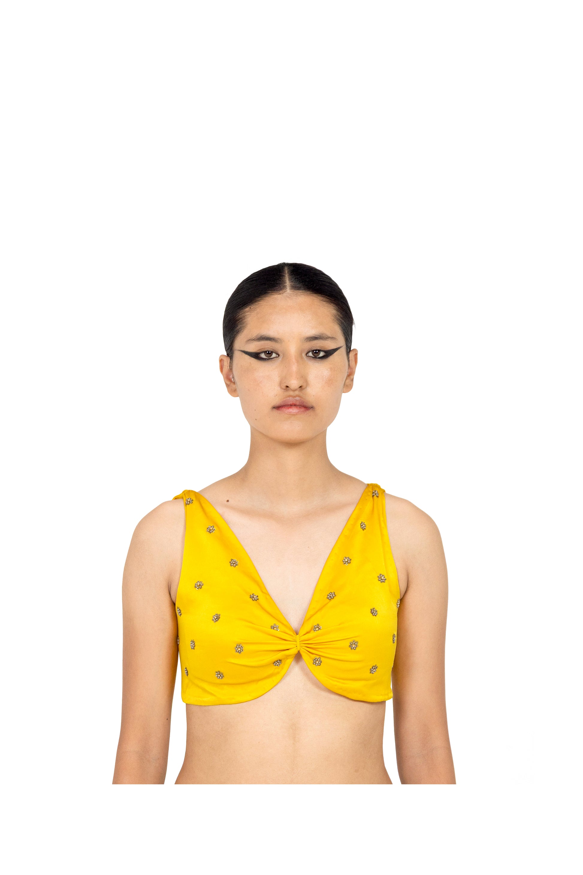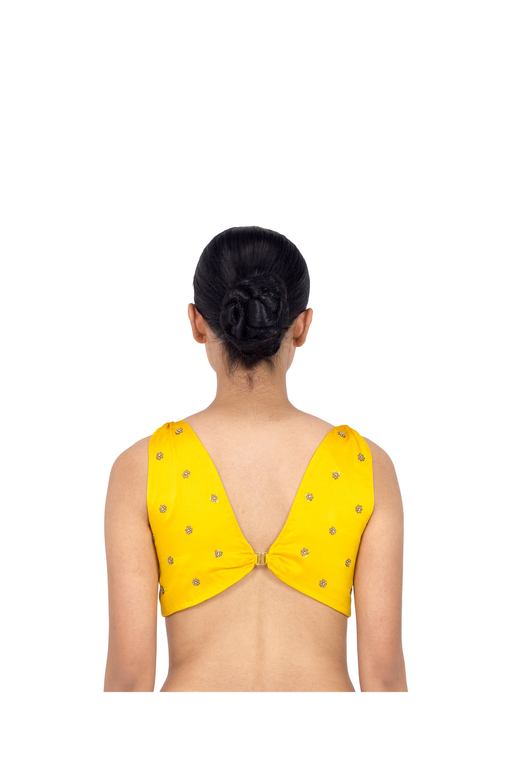 'Ewad' yellow blouse in silk satin is gathered at the shoulders and the center of the bust, and features an all-over placement of small zardozi flowers.