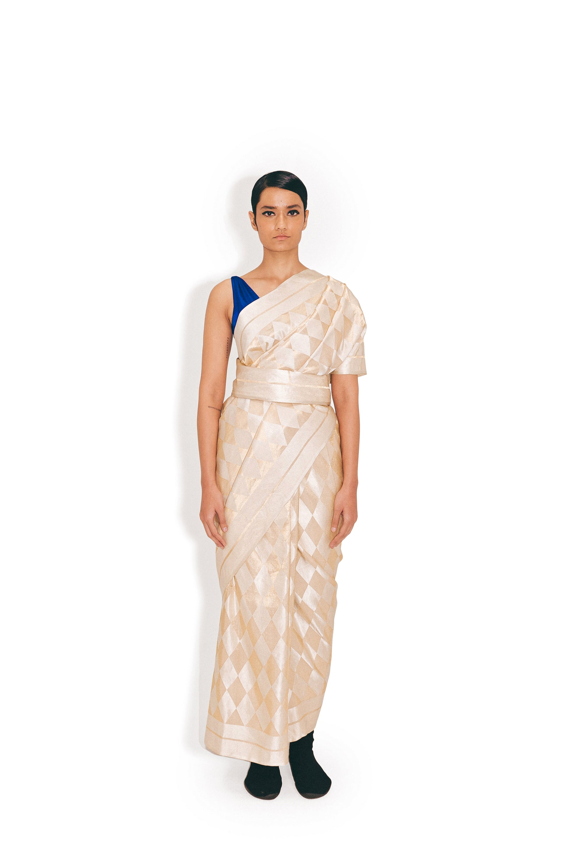 The Fern sari features a diamond pattern woven in silk and zari. Crafted as a brocade with gold zari on a white satin base, the sari balances structure and sheen through its graphic weave.