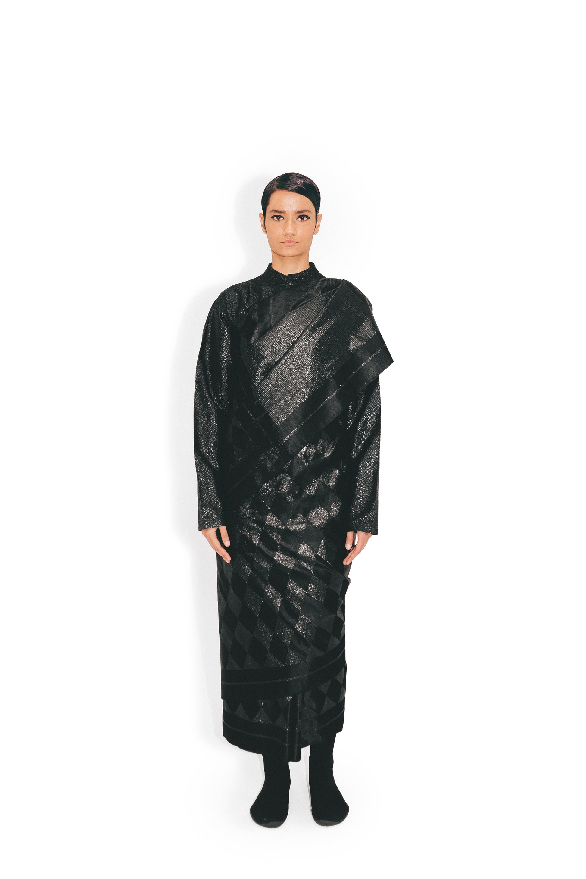 The Gia sari is crafted with black zari on an black satin base and features a diamond pattern woven through the textile.