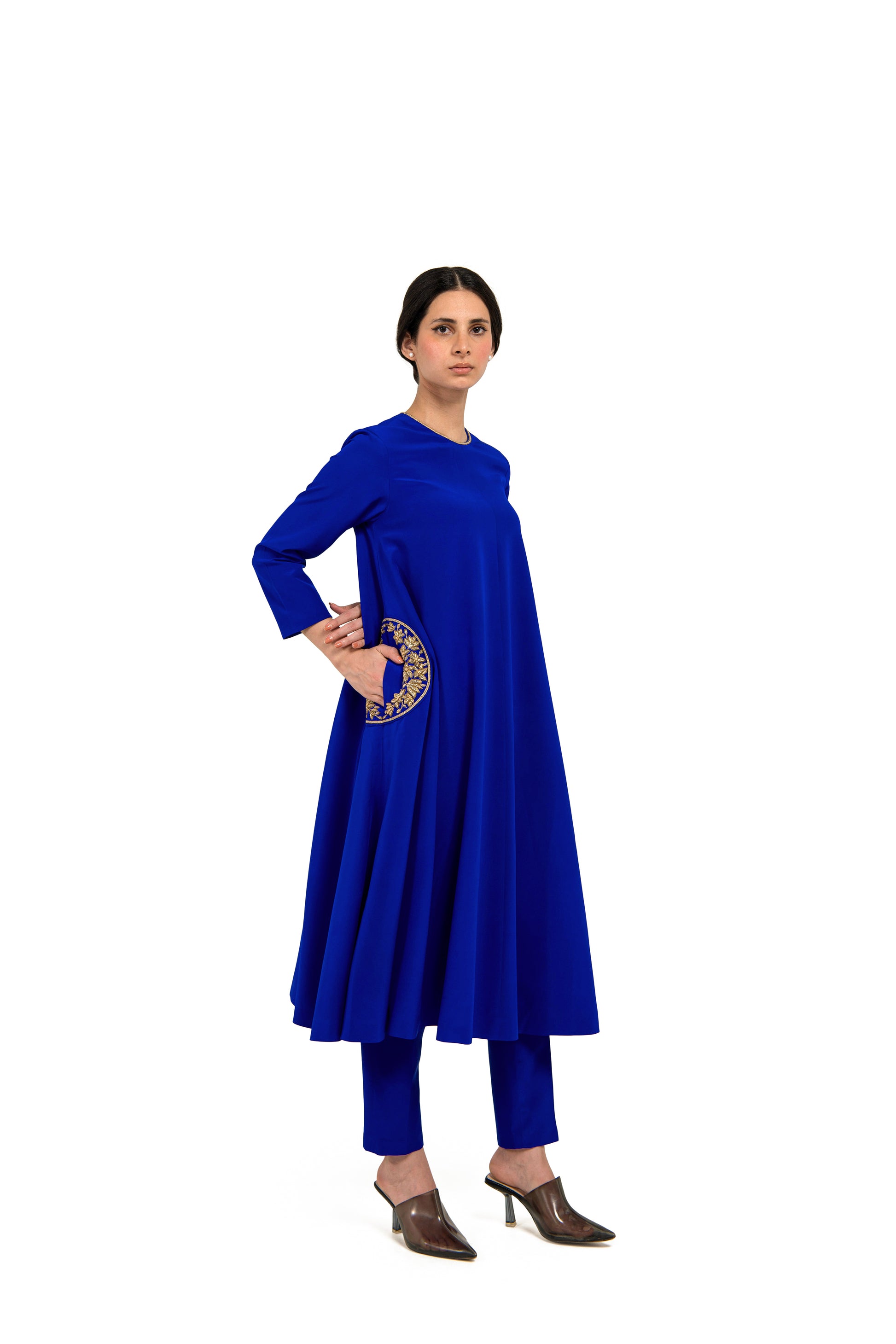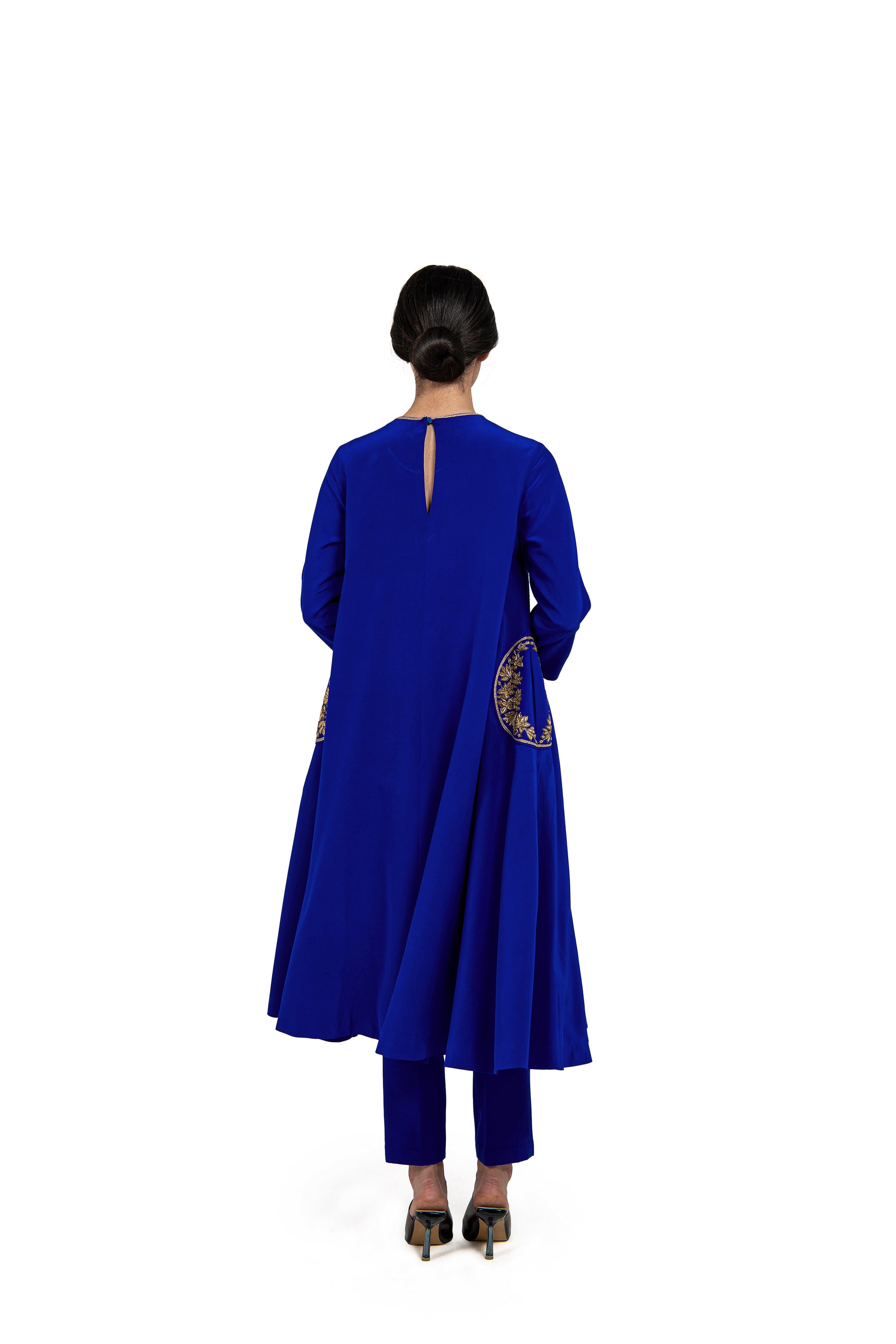 'Hana' blue sik crepe kurta with magnolias in a crescent form embroidered in zardozi on the pockets is paired with 'Suzume' blue silk crepe pants.