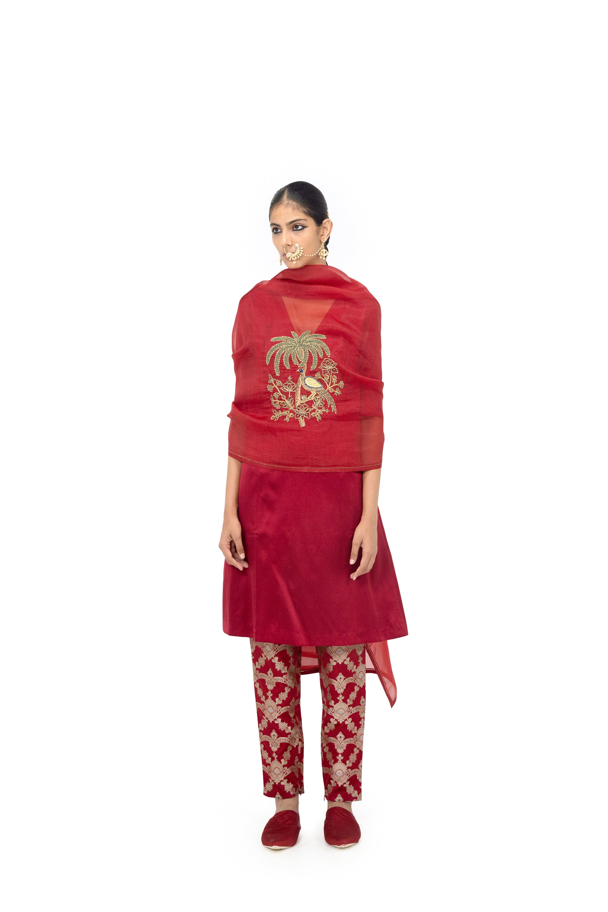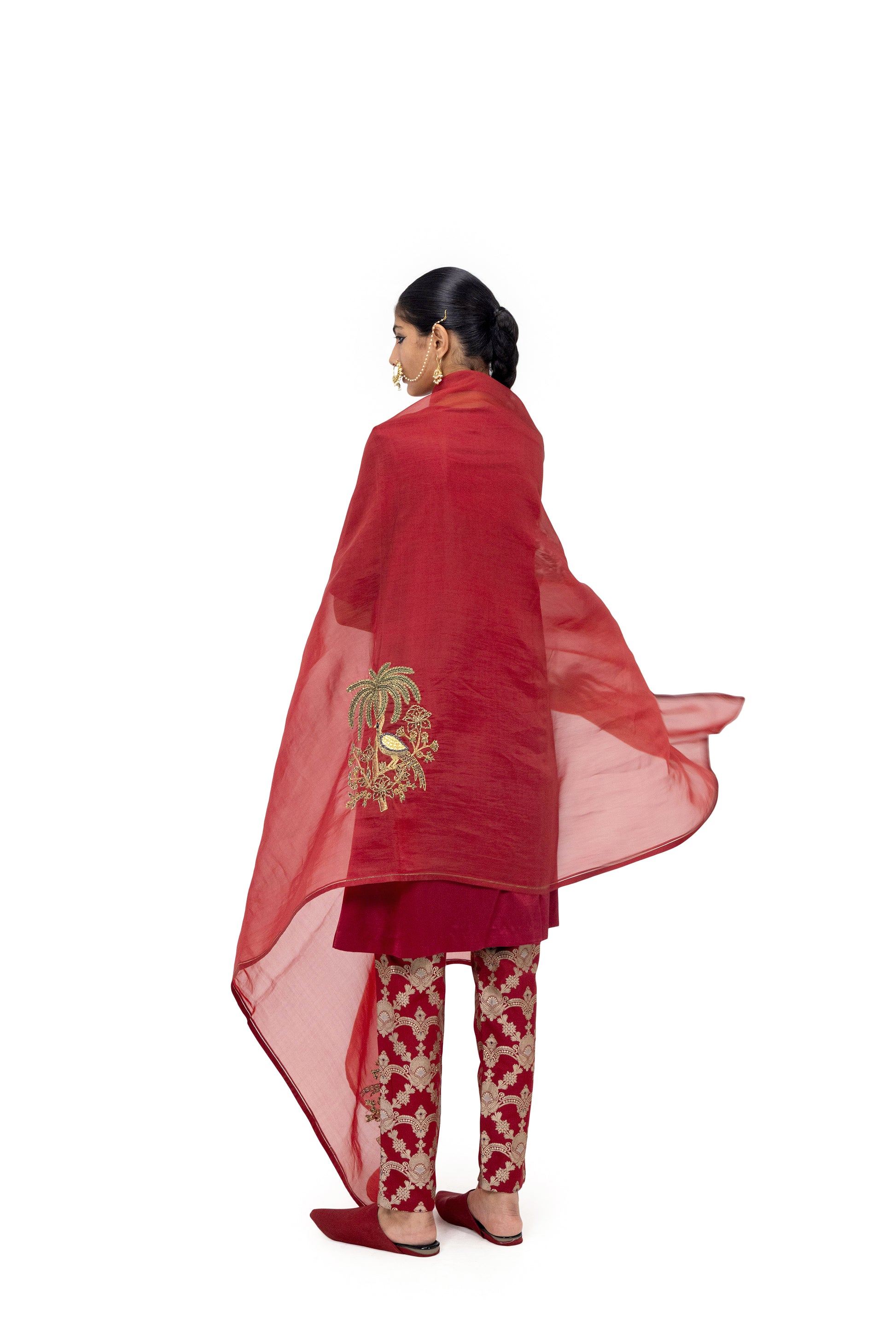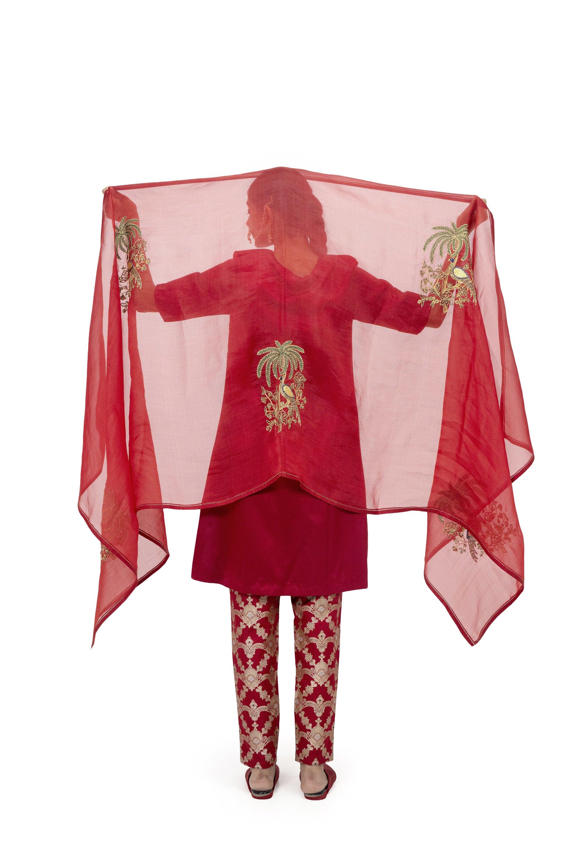 'Hansasar' red odhani in silk organza features a placement of palm trees surrounded by foliage and peacocks, realised in zardozi embroidery and aari work with red, green and blue meena.