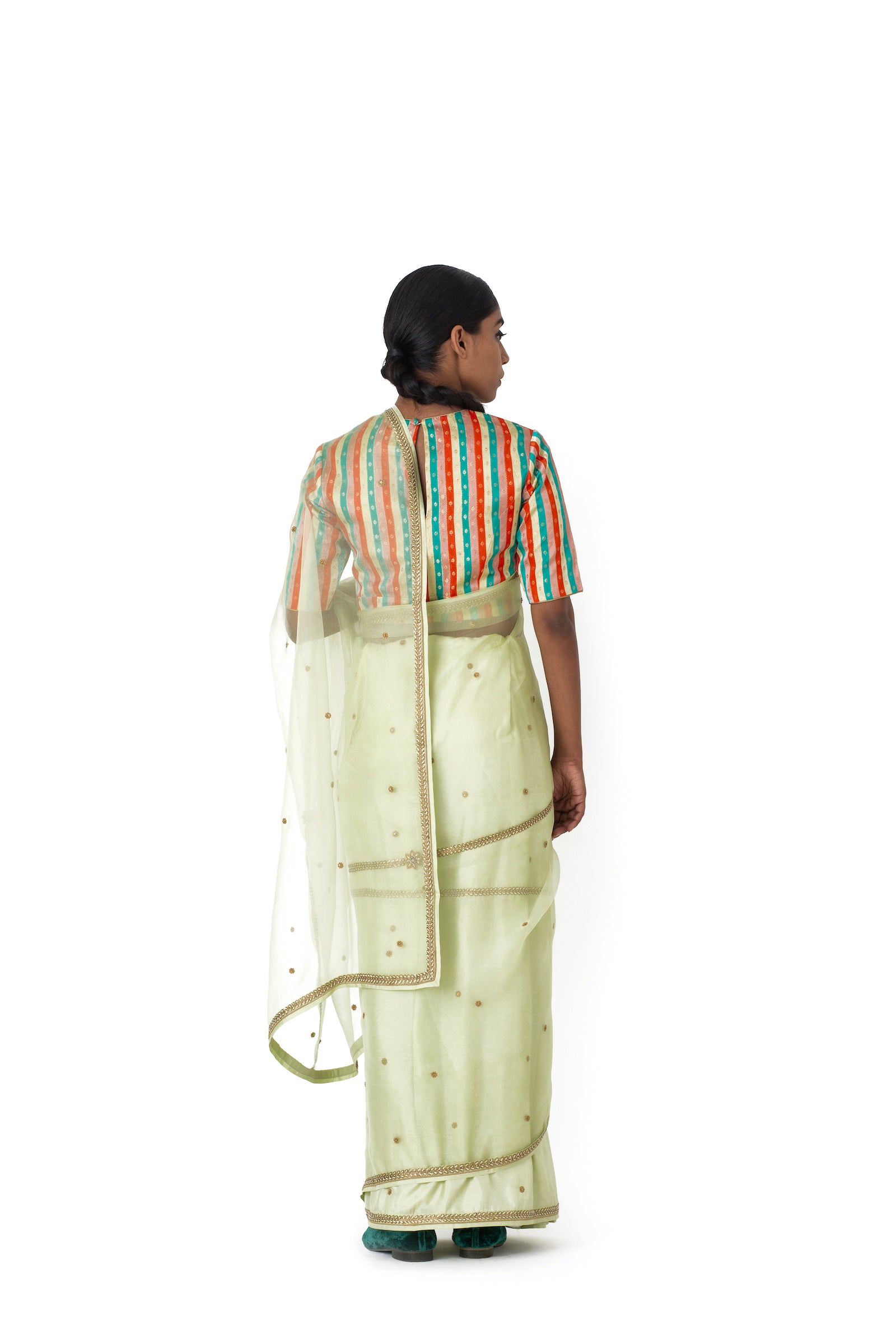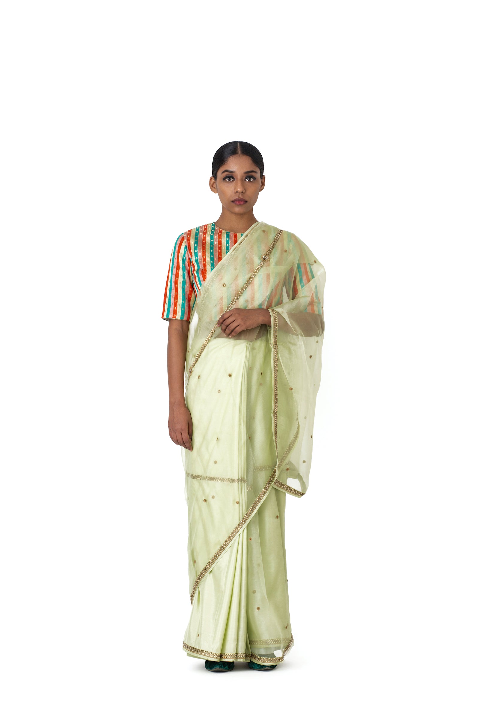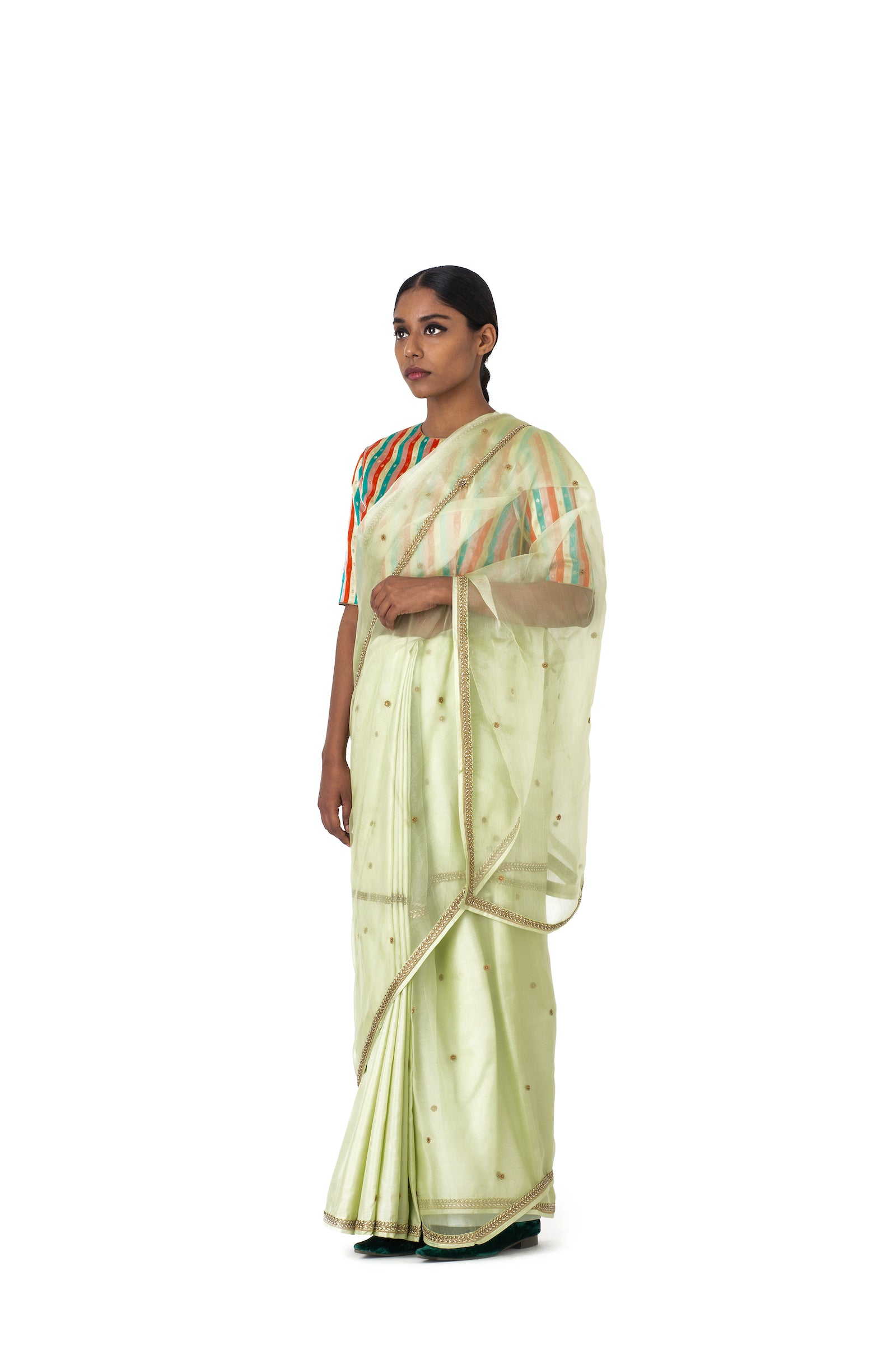 'Hazari' angoori sari is made through the joinery of textiles: sheer organza silk and plain silk, which allows for a better suited drape and fall. It features a border and small floral butis embroidered through the intricate form of 'Aari' and 'Zardozi'.