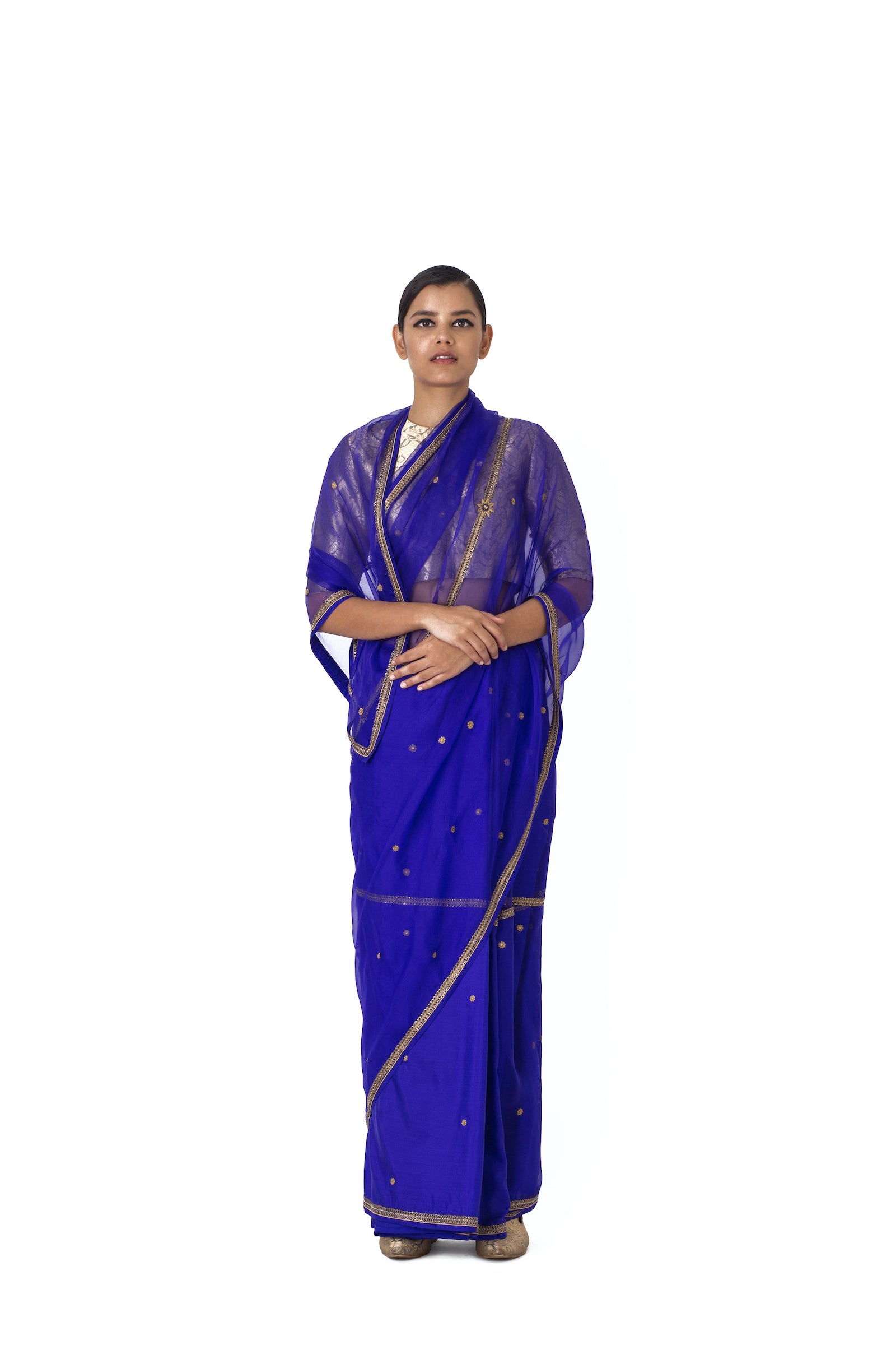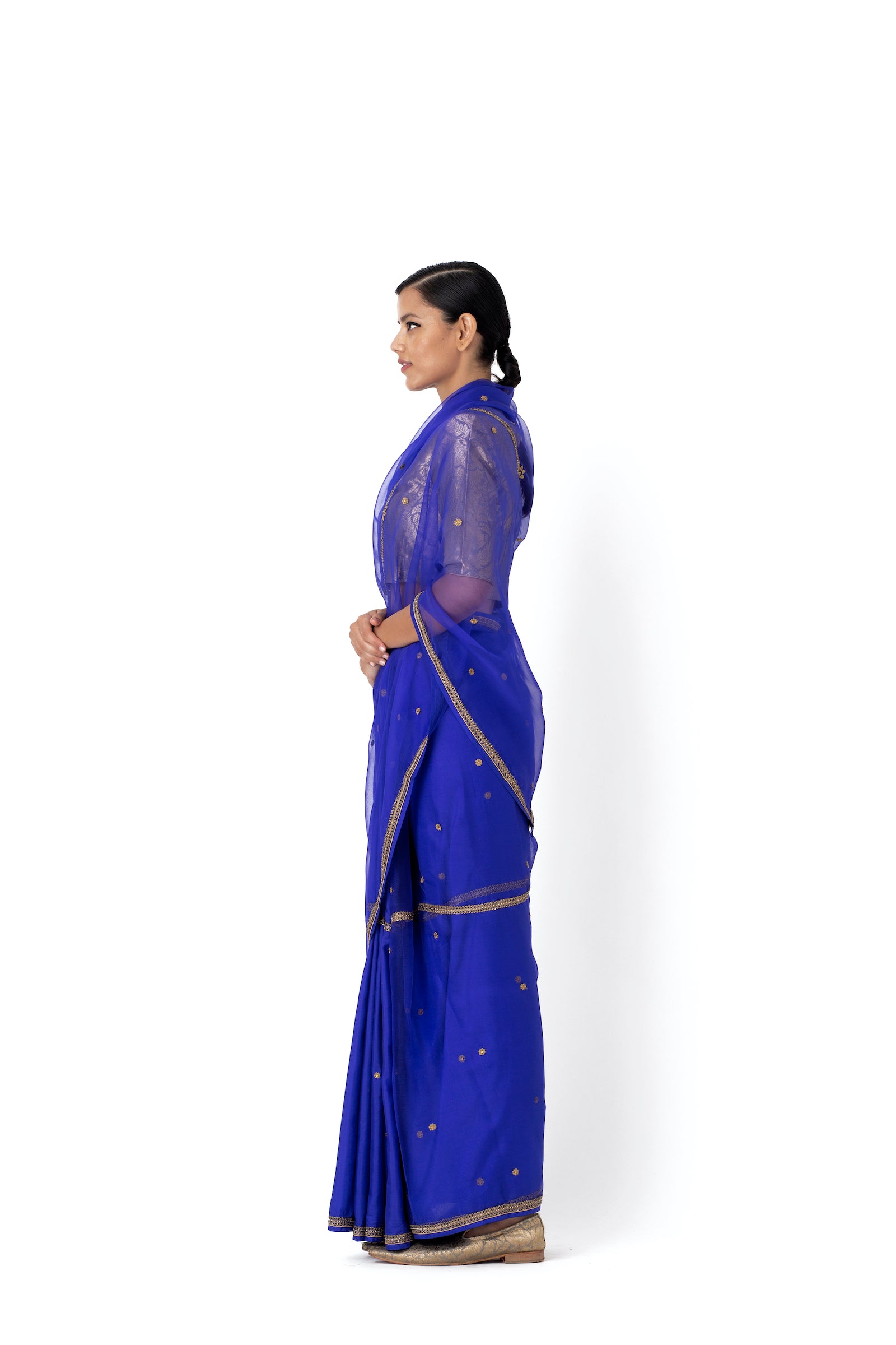 'Hazari' blue sari is made through the joinery of textiles: sheer organza silk and plain silk, which allows for a better suited drape and fall. It features a border and small floral butis embroidered through the intricate form of 'Aari' and 'Zardozi'.