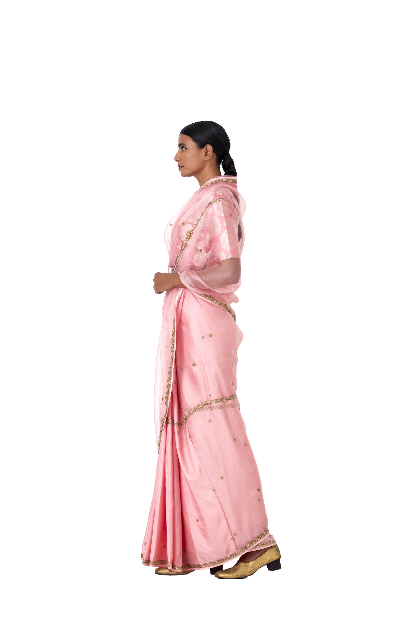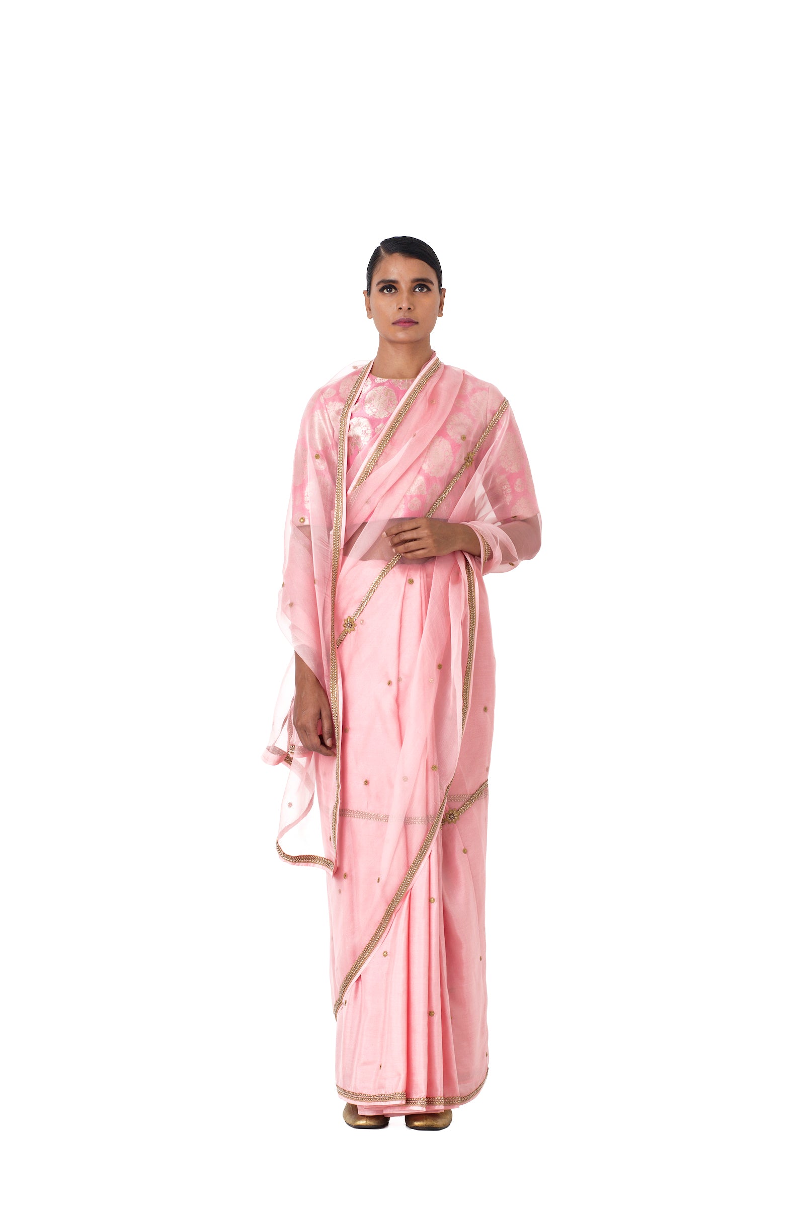 'Hazari' pink sari is made through the joinery of textiles: sheer organza silk and plain silk, which allows for a better suited drape and fall. It features a border and small floral butis embroidered through the intricate form of 'Aari' and 'Zardozi'.