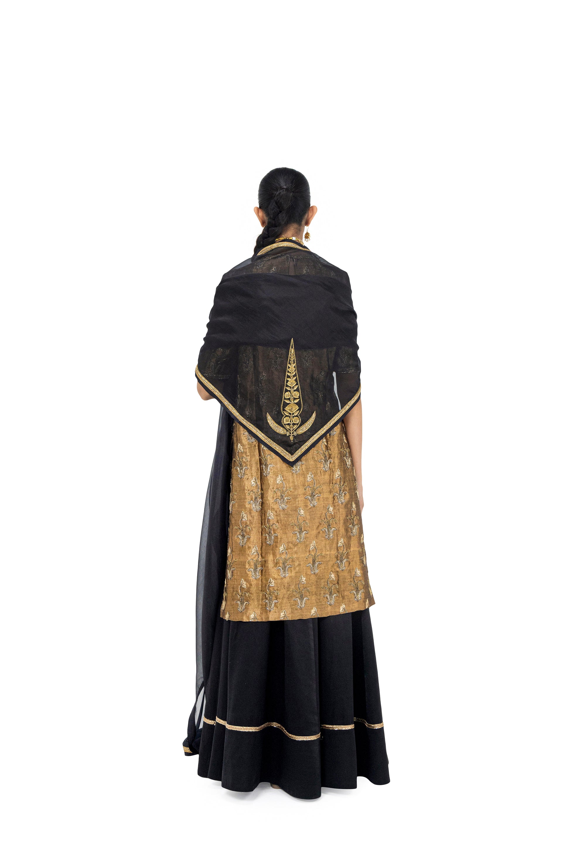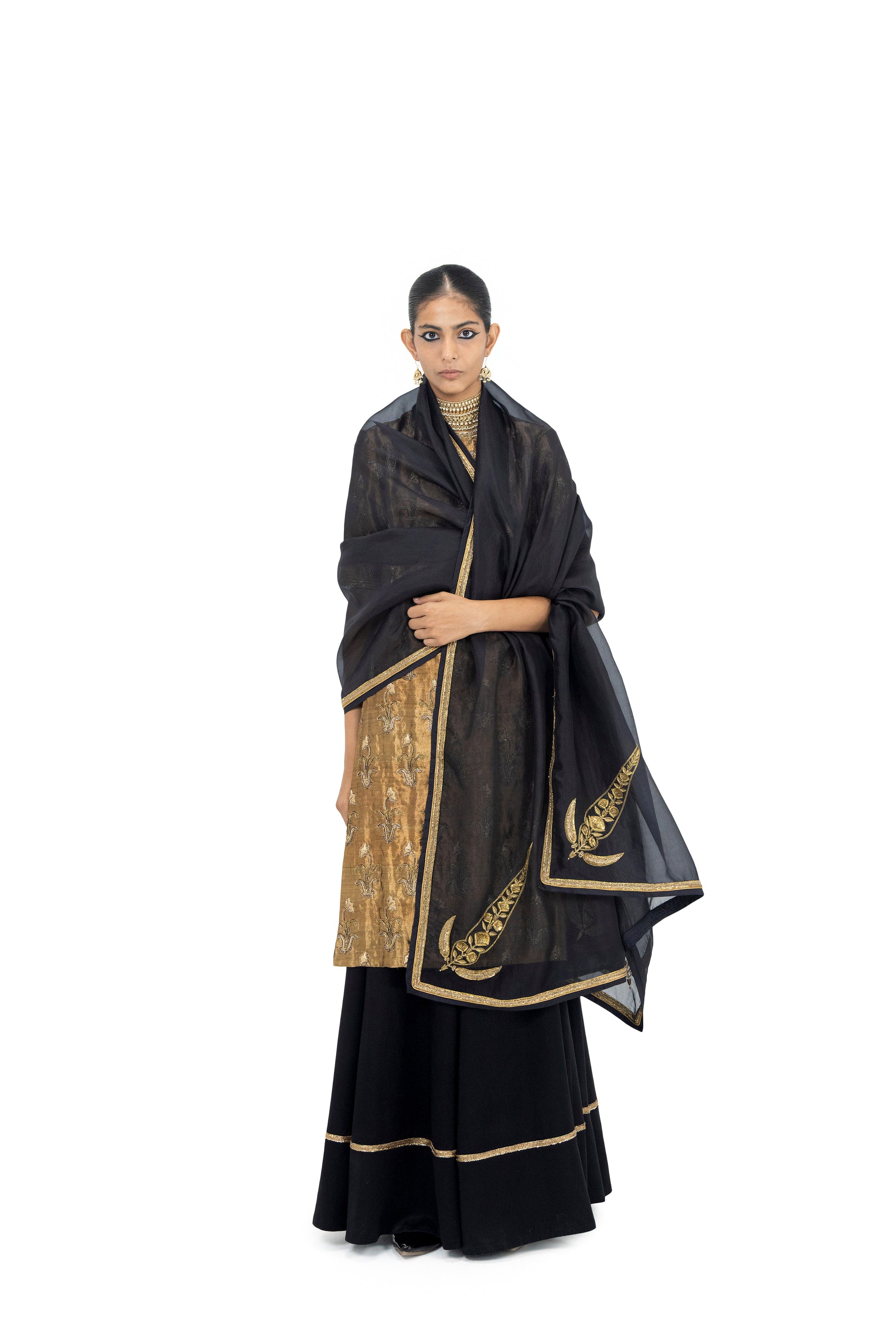 ‘Kedli' black silk organza odhani features a gold border with archival kuniya butas (motif placed at a corner) in zardozi embroidery.