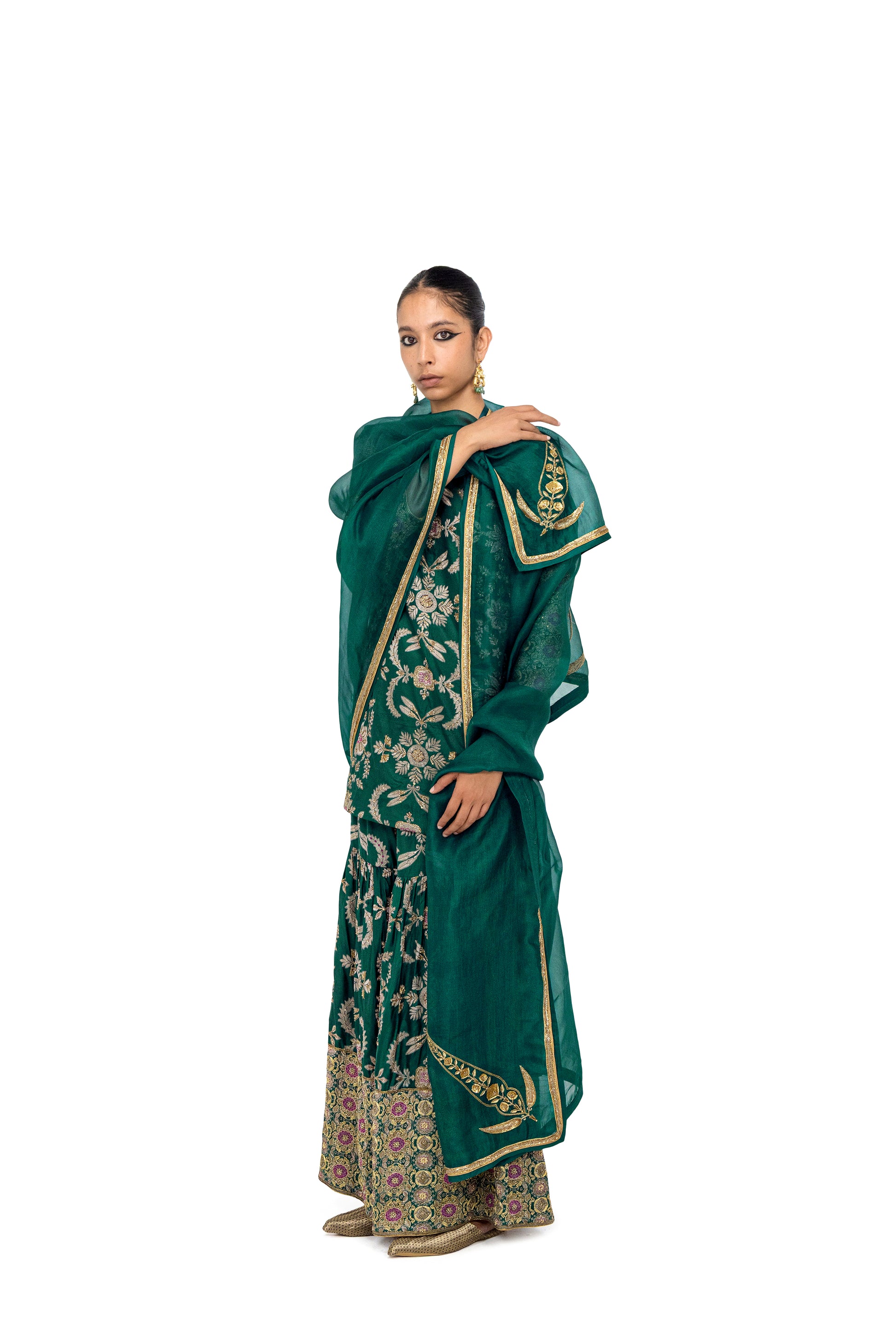 ‘Kedli' deep green silk organza odhani features a gold border with archival kuniya butas (motif placed at a corner) in zardozi embroidery.