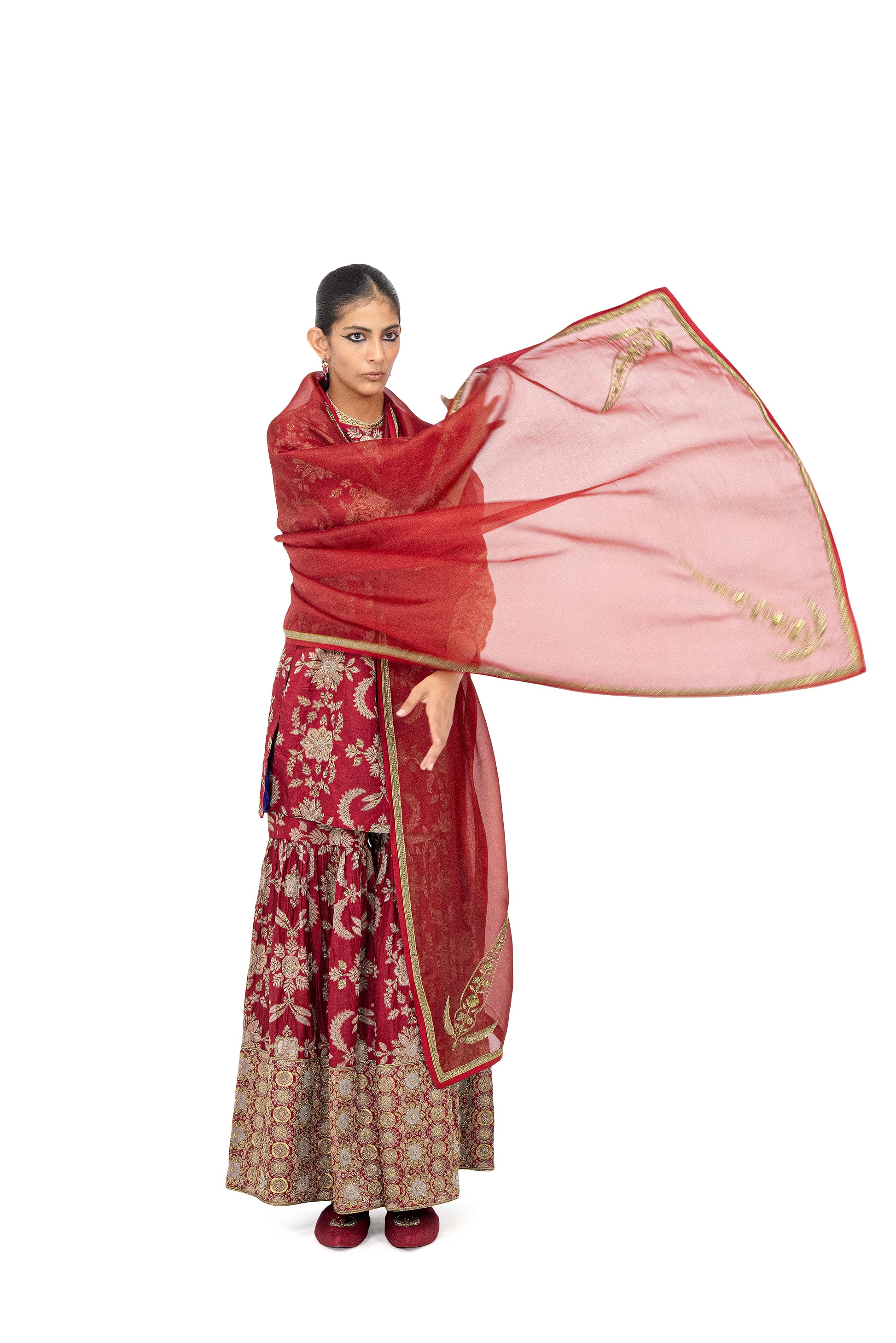 ‘Kedli' red silk organza odhani features a gold border with archival kuniya butas (motif placed at a corner) in zardozi embroidery.