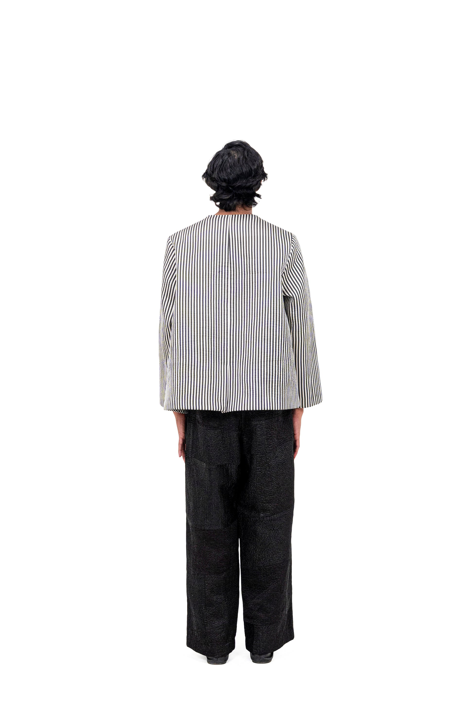 The ‘Khama’ jacket is crafted in black and white Mashru stripes. Composed of a silk warp and cotton weft, the Mashru weave results in a smooth silk satin surface that is loved and recognized for its possibilities, sumptuous tactility, and otherworldly lustre. It is designed in a straight fit for a clean, structured silhouette.