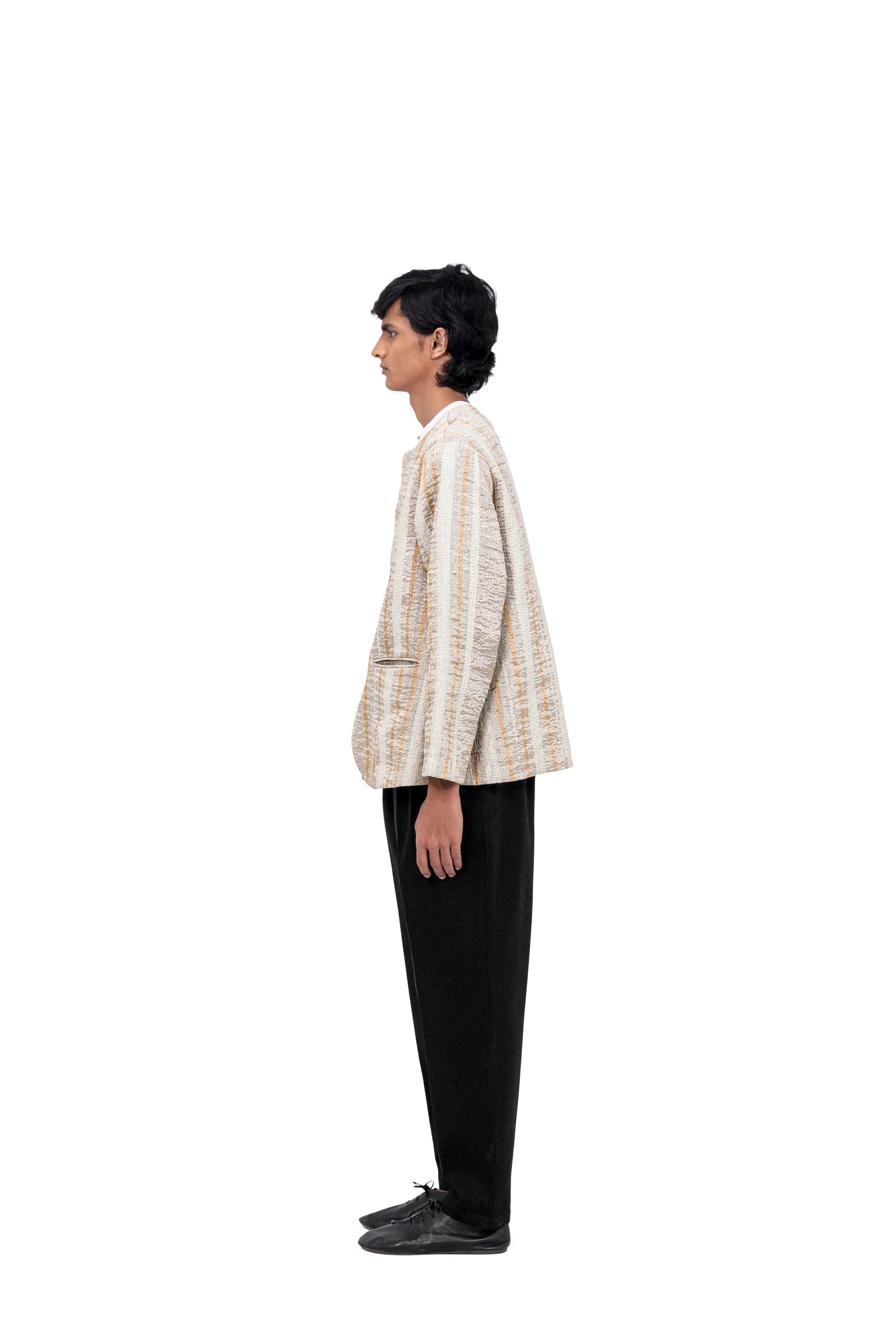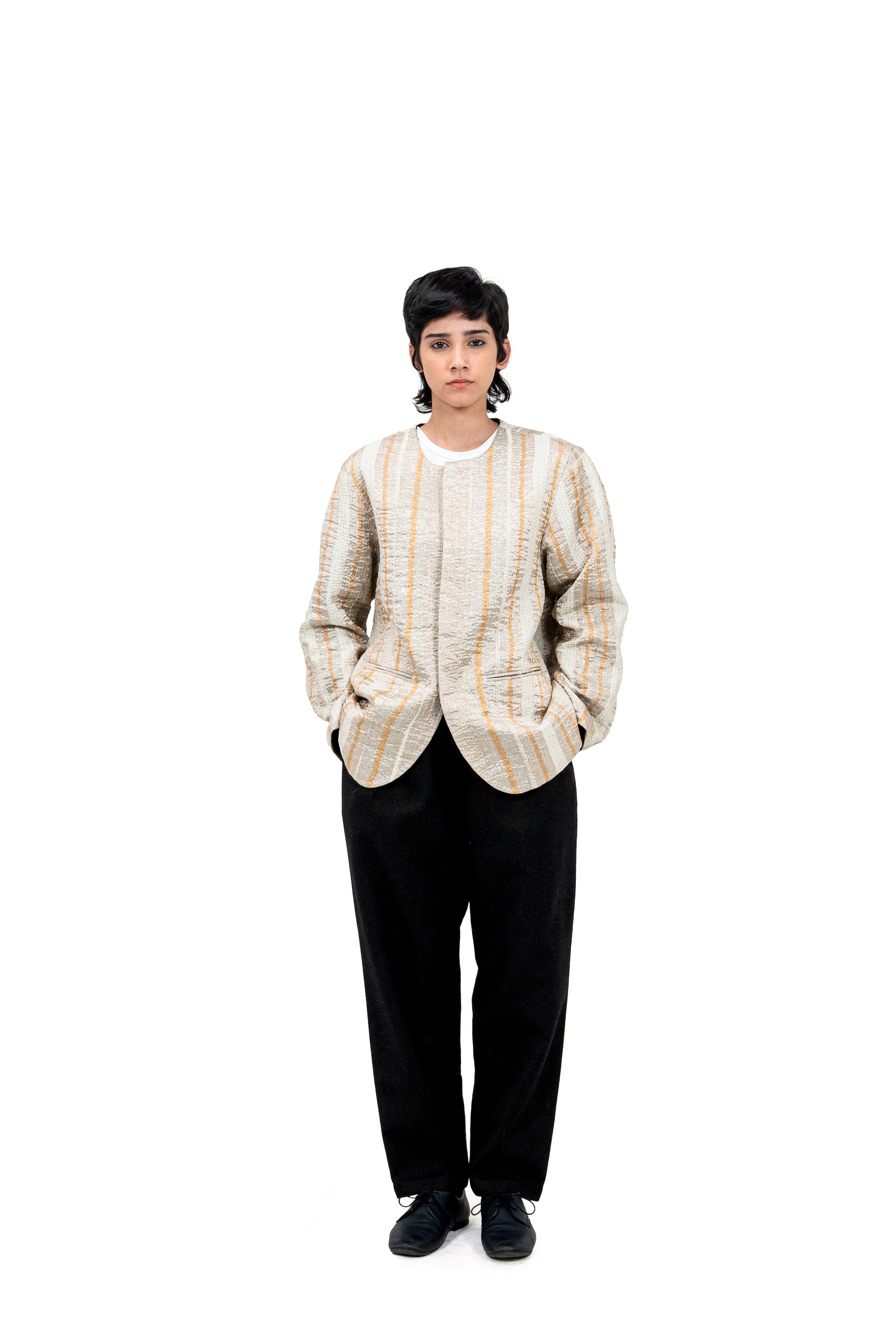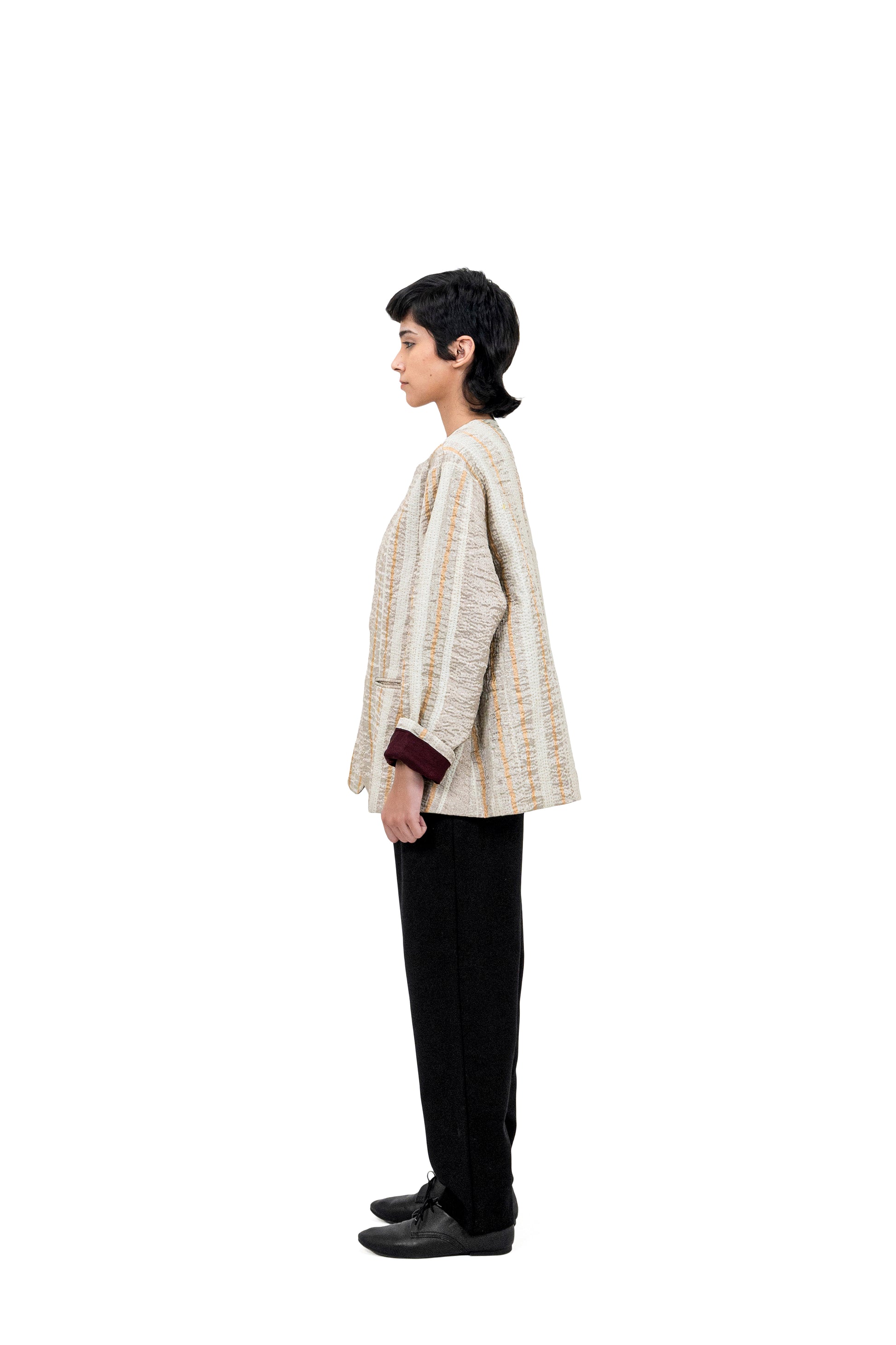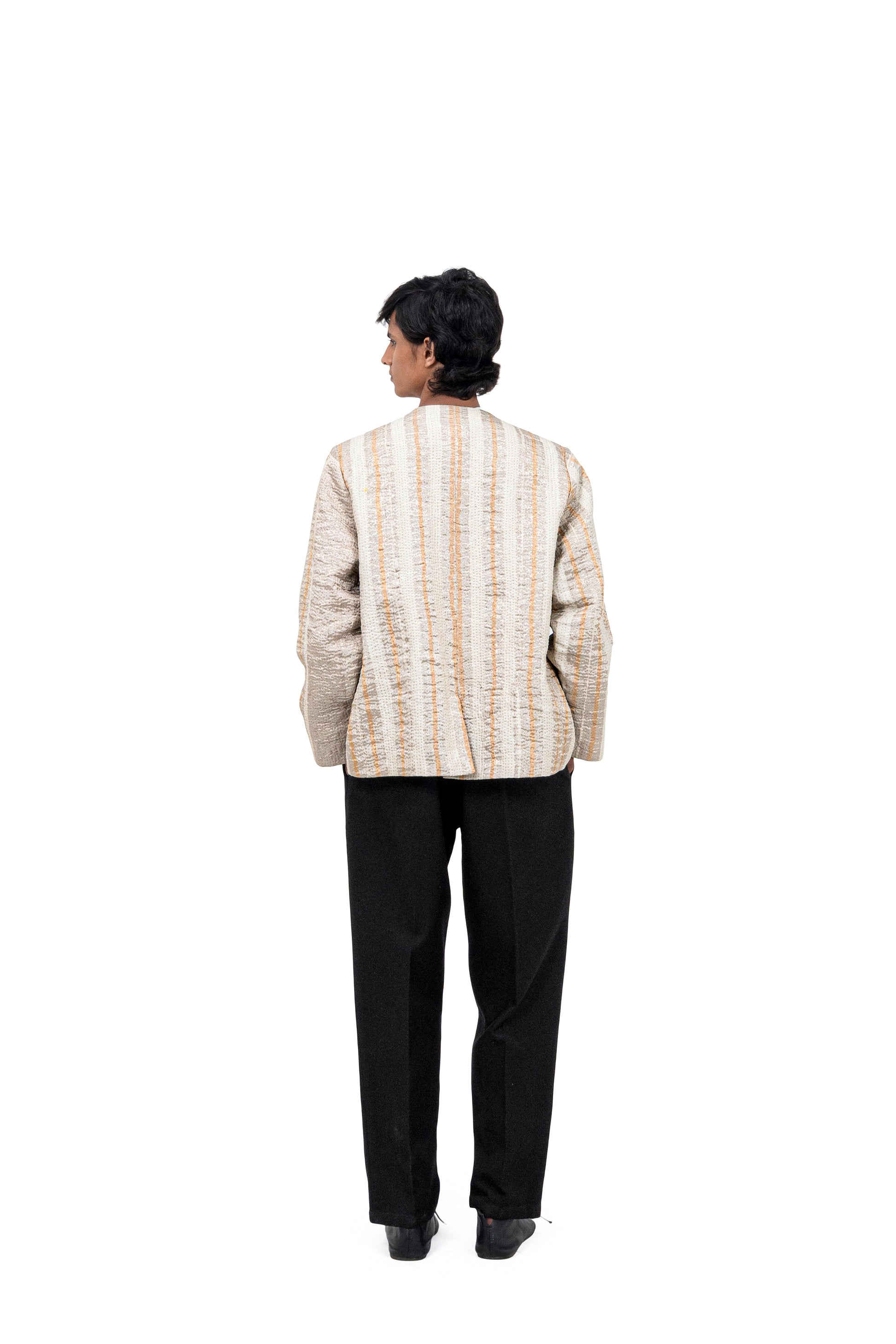 The ‘Khama’ jacket is crafted in silk and detailed with Kantha embroidery. It is made with gold tissue and designed in a straight fit.
