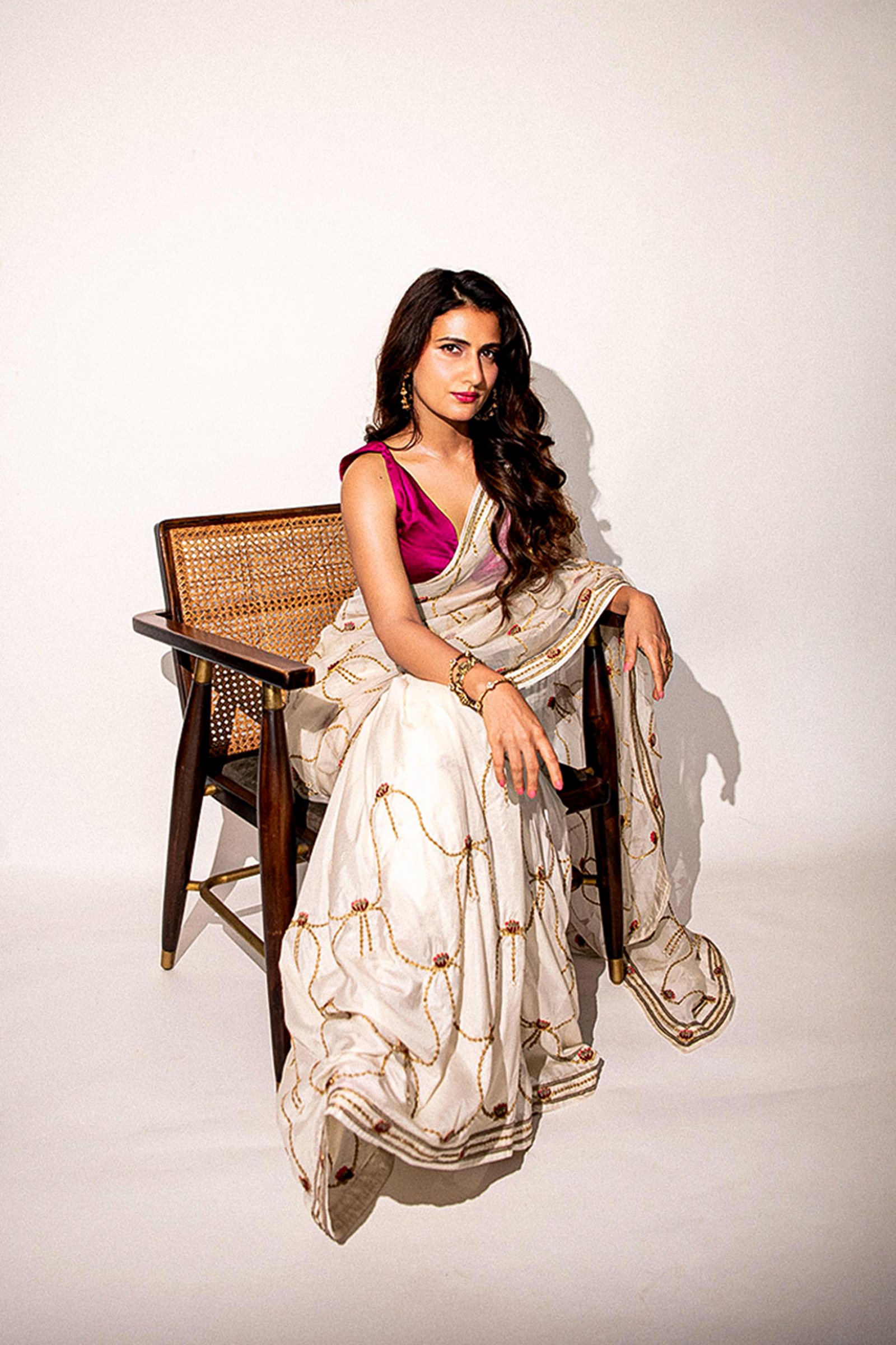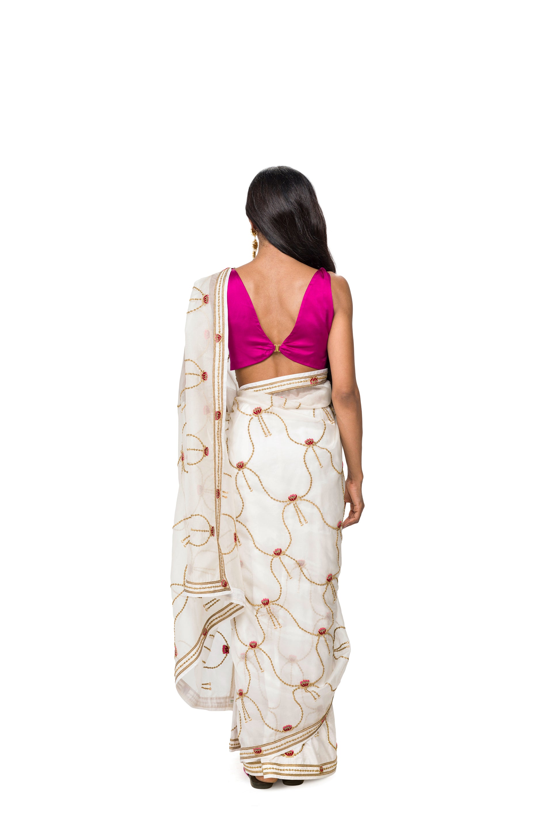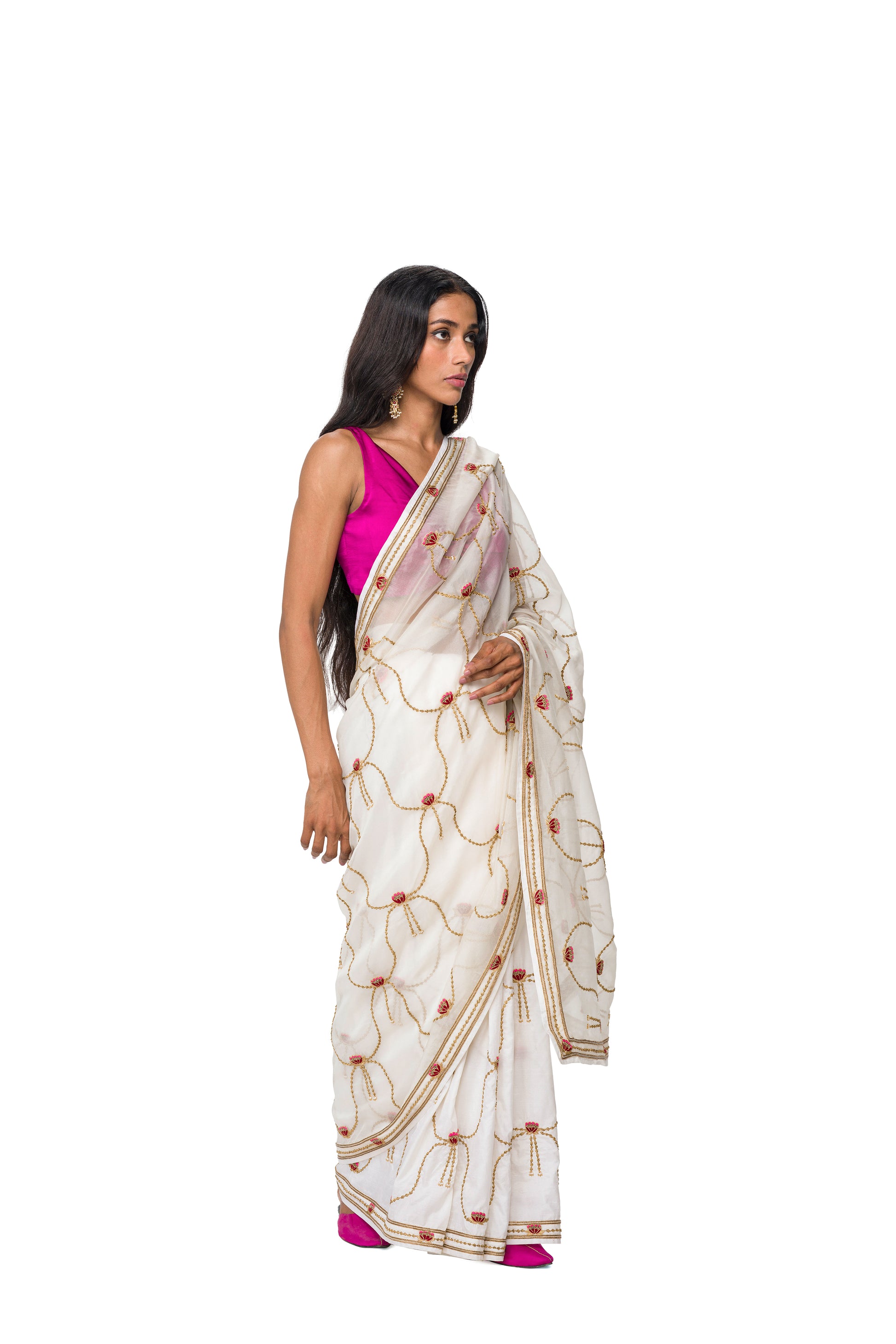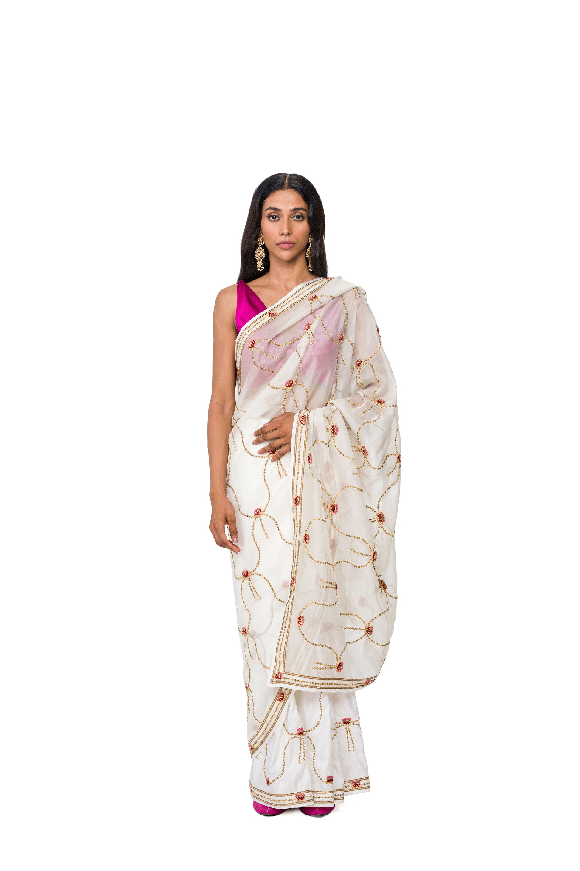 'Madhumalti' natural sari is made through the joinery of textiles: sheer organza silk and plain silk, which allows for a better suited drape and fall. Echoeing the Islamic Ogee architectural patterns punctuated by Kunjam motifs of floral tassels, it features a jaal embroidered through intricate zardozi embroidery with dabka and moti work punctuated with wool embroidery.