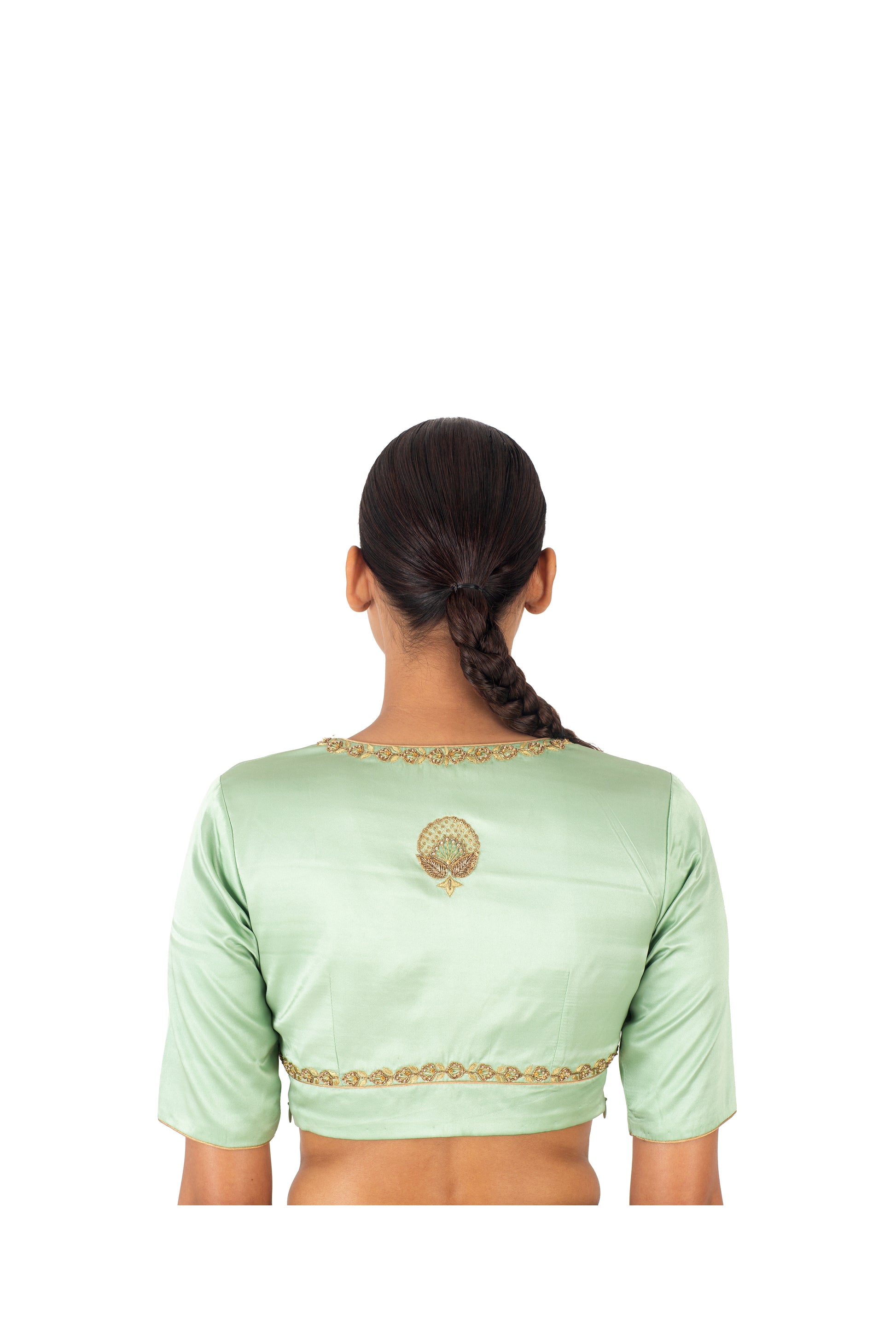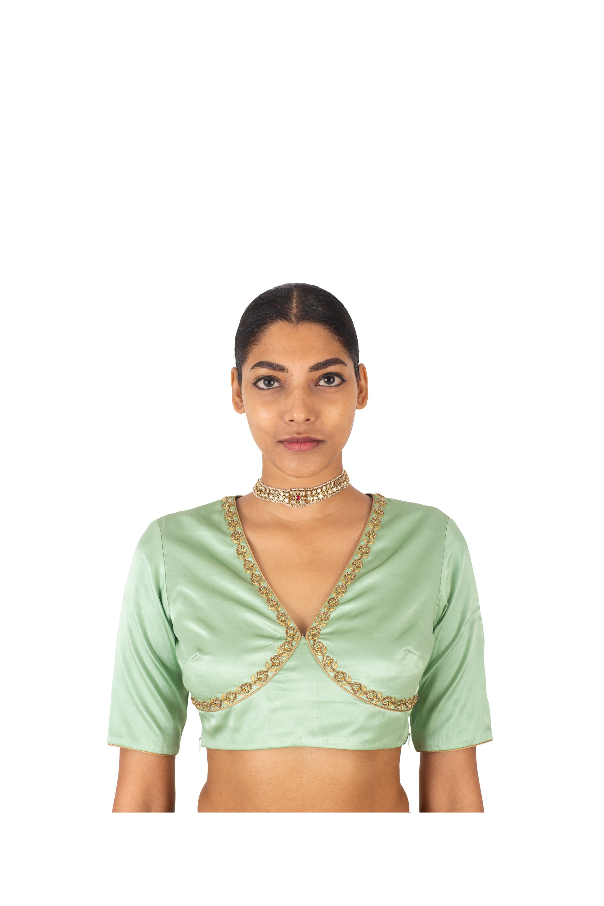 'Majorda' mint green satin silk blouse features a v-neck and hand-embroidery in dori kaam and sequins highlighting the form.