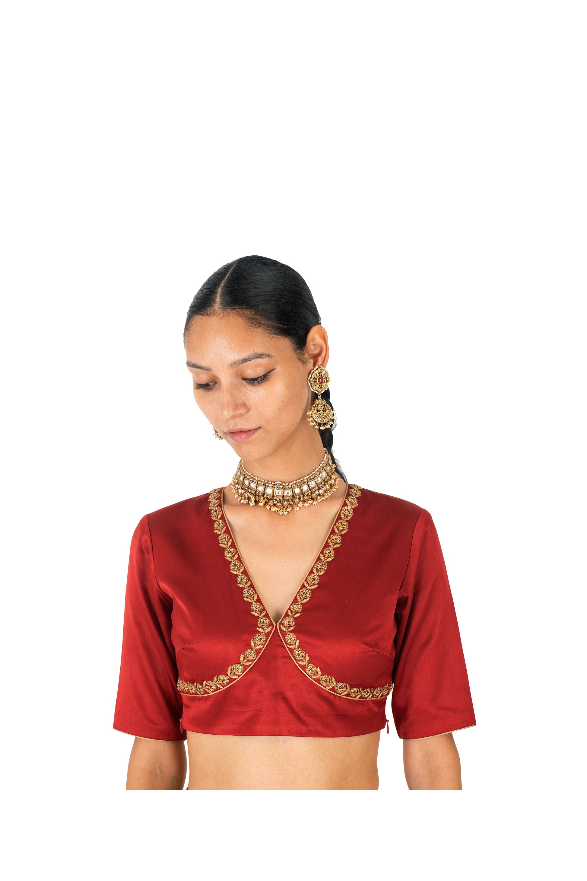 'Majorda' red satin silk blouse features a v-neck and hand-embroidery in dori kaam and sequins highlighting the form.
