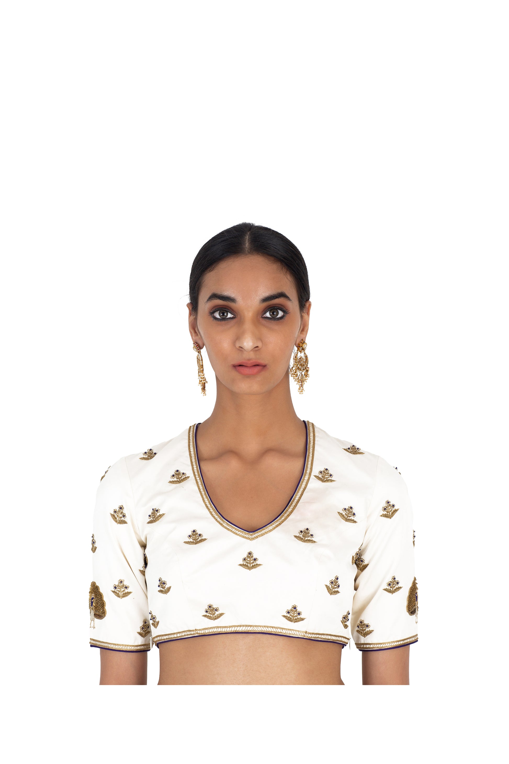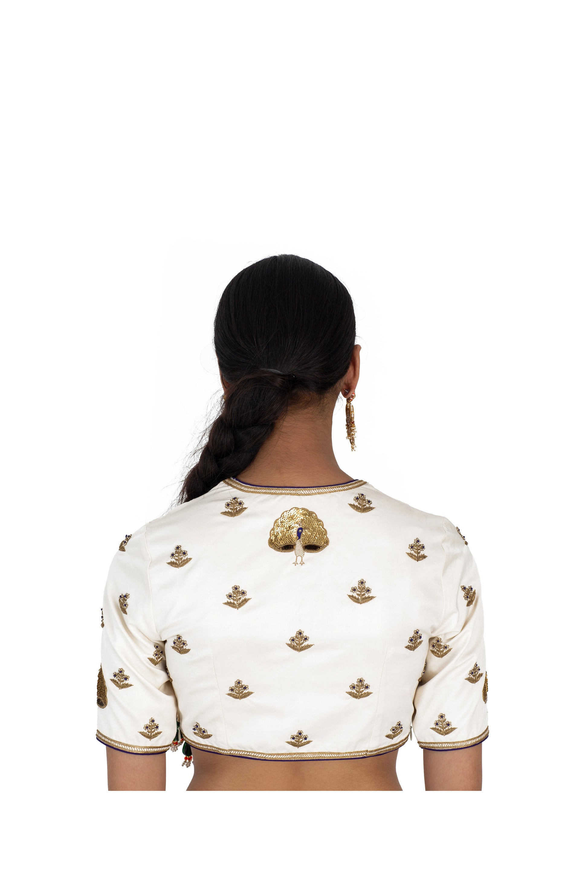 Natural ‘Mandawa’ blouse in silk features ‘aari’ embroidered floral ‘butis’ and peacock ‘butas’.