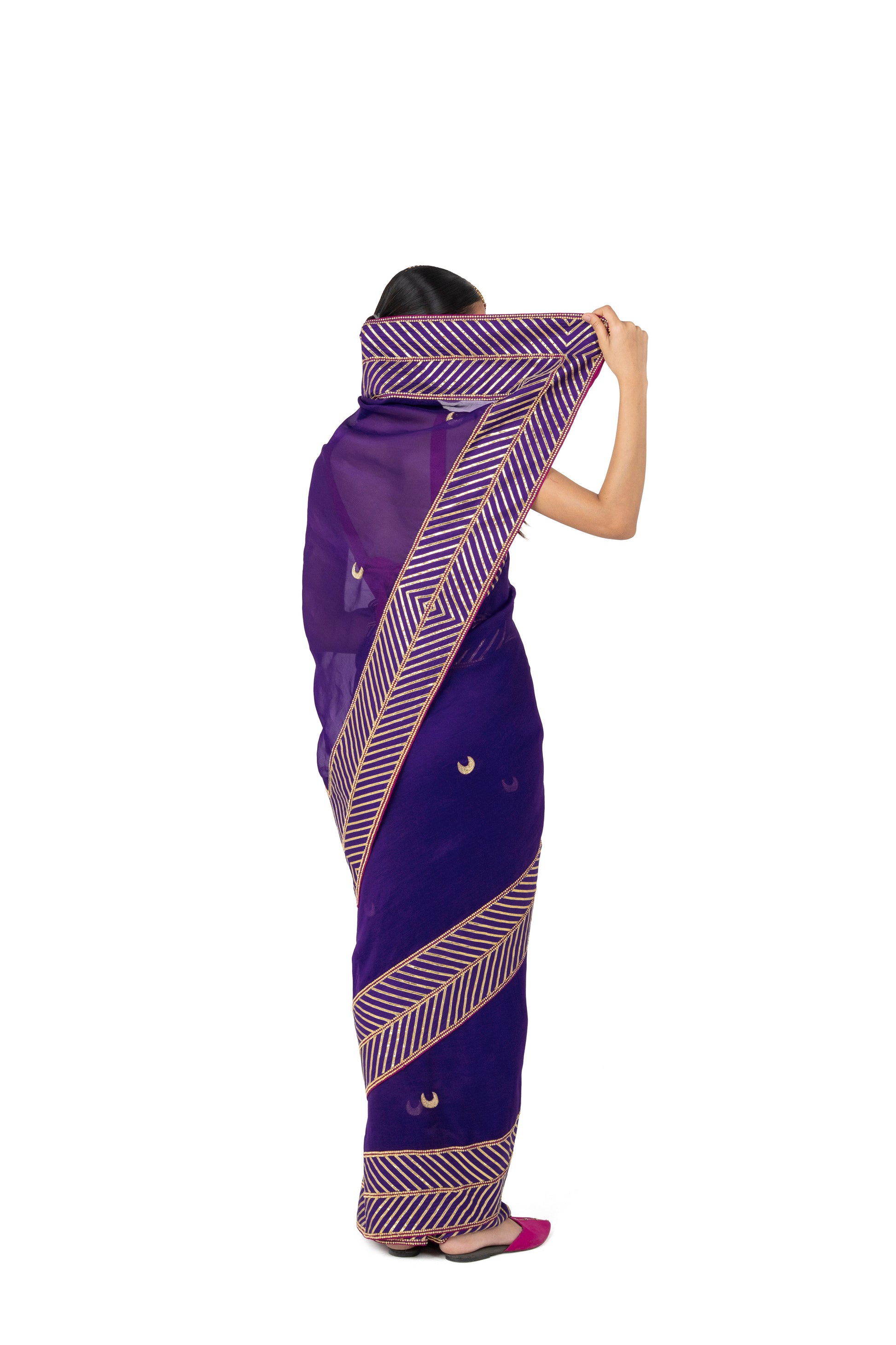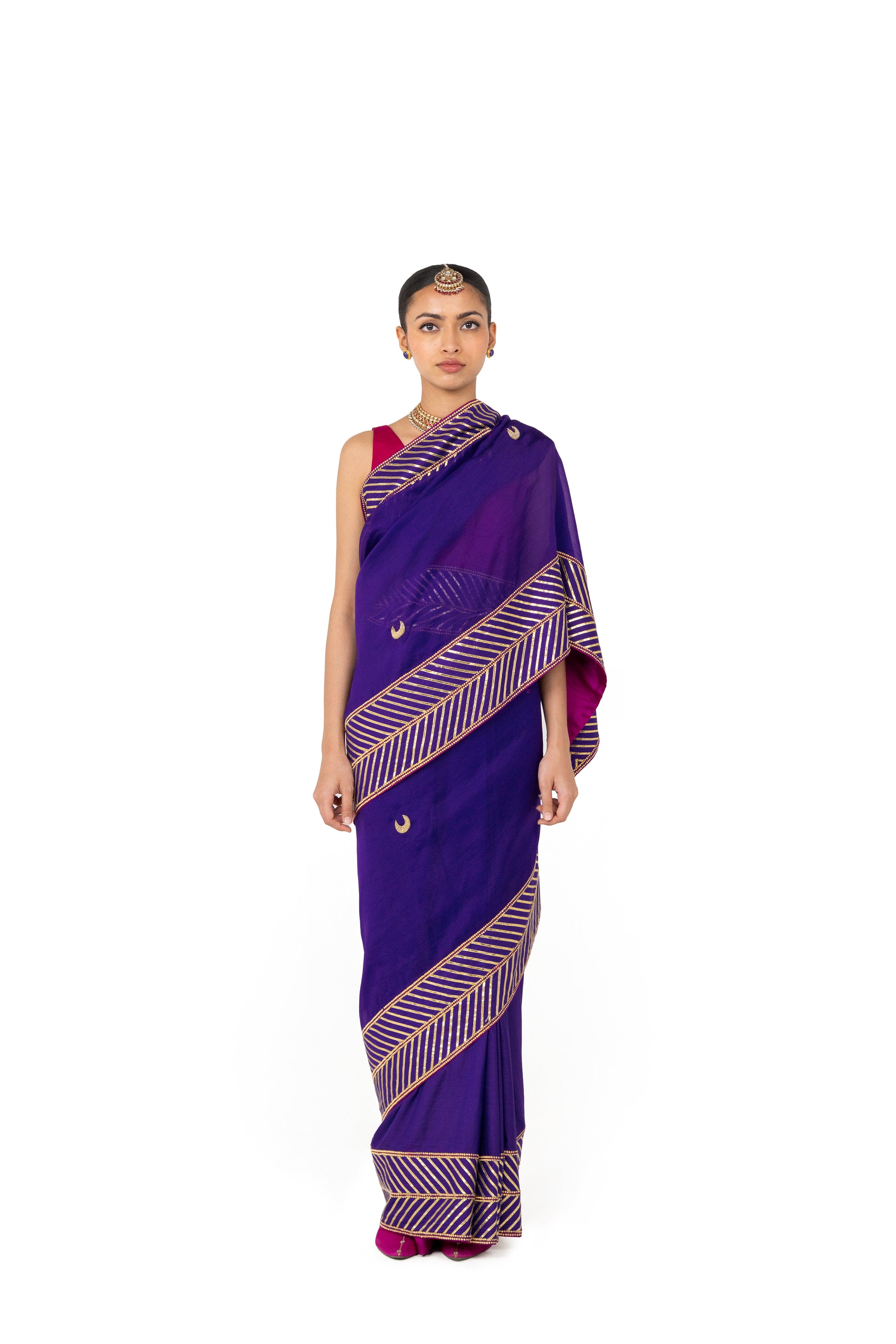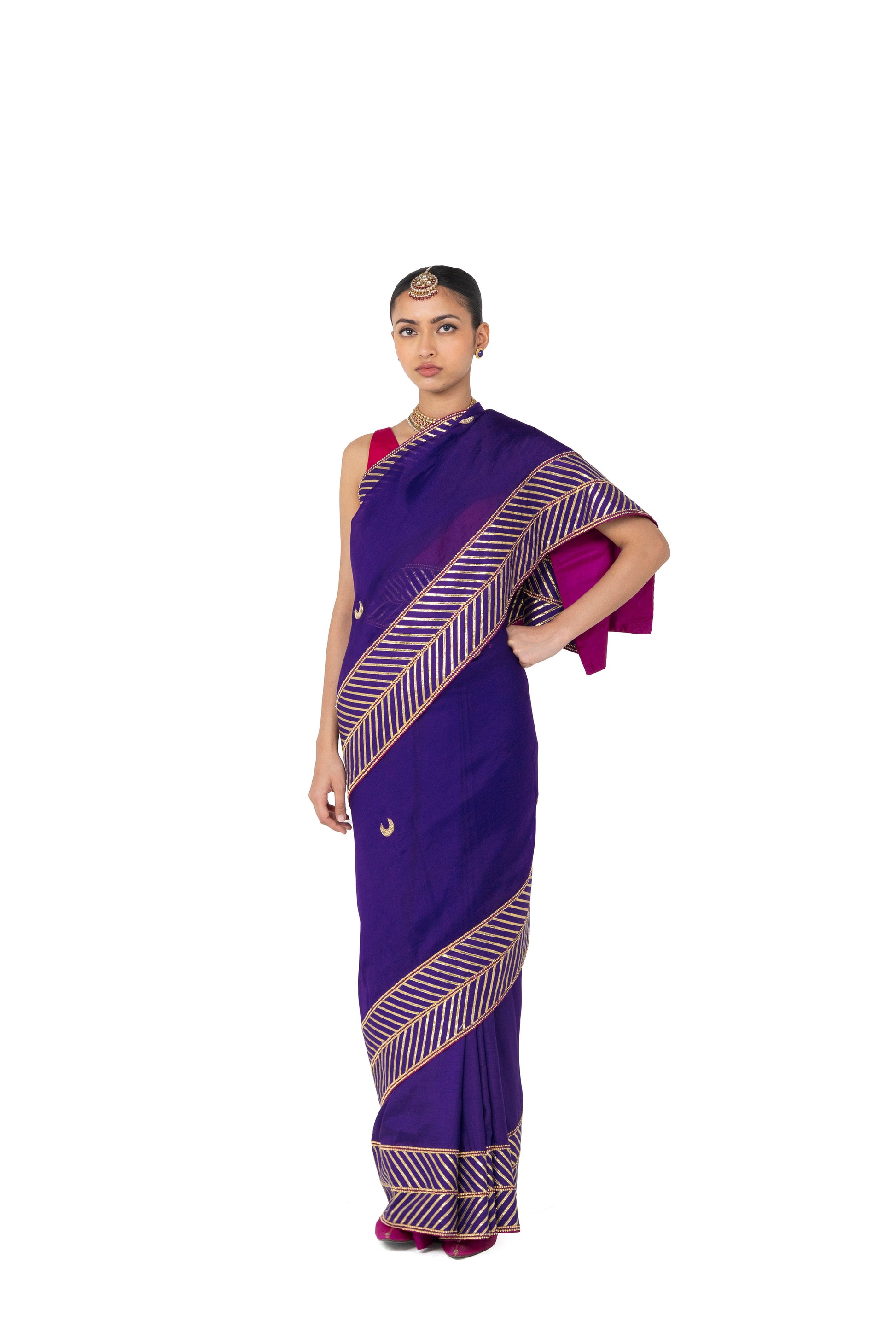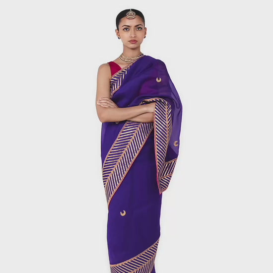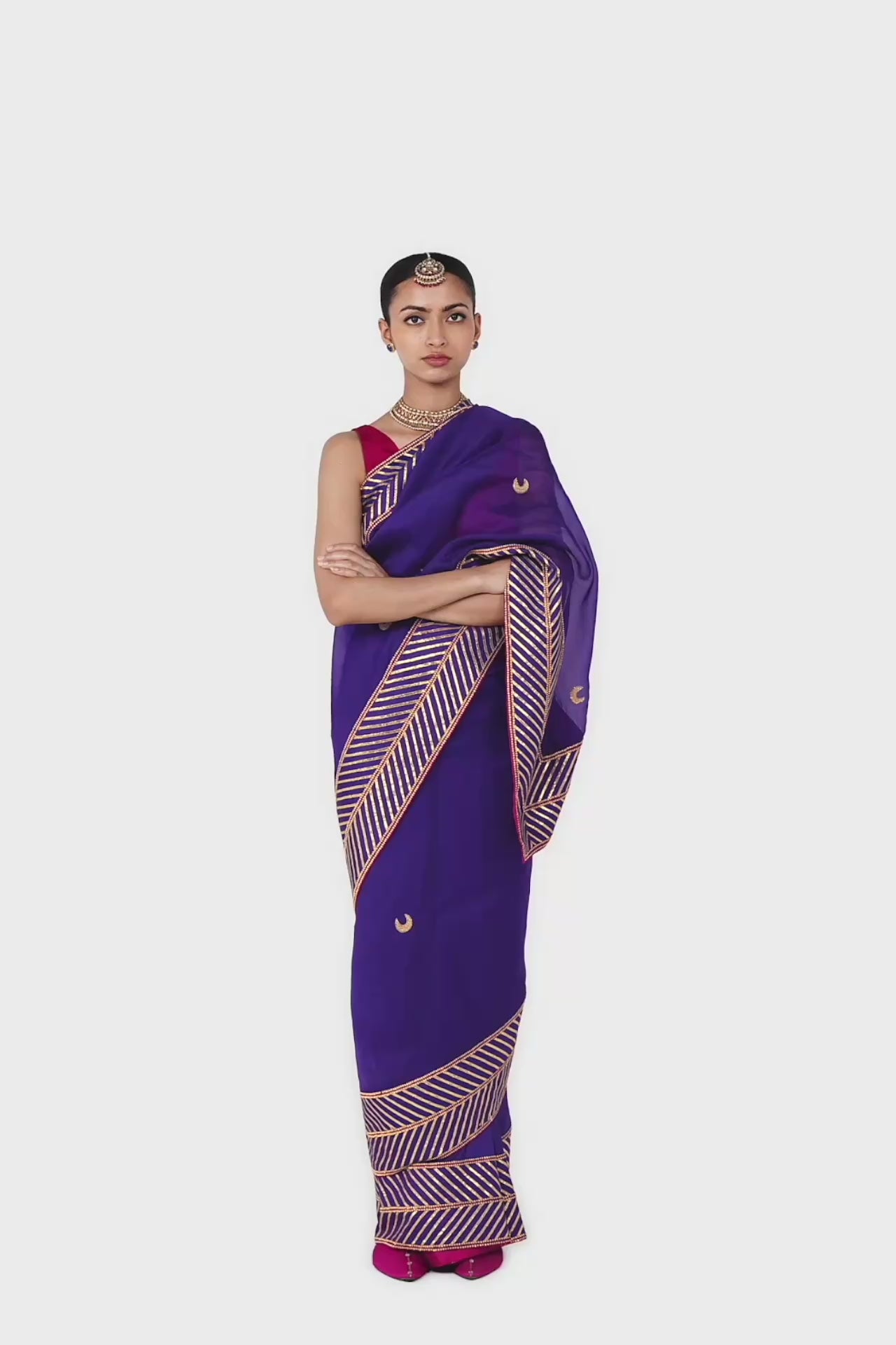 The ‘Mayni’ sari is crafted in royal indigo organza silk and features gota embroidery in chevron patterns inspired by leheriya style and Rajasthani wall frescoes.