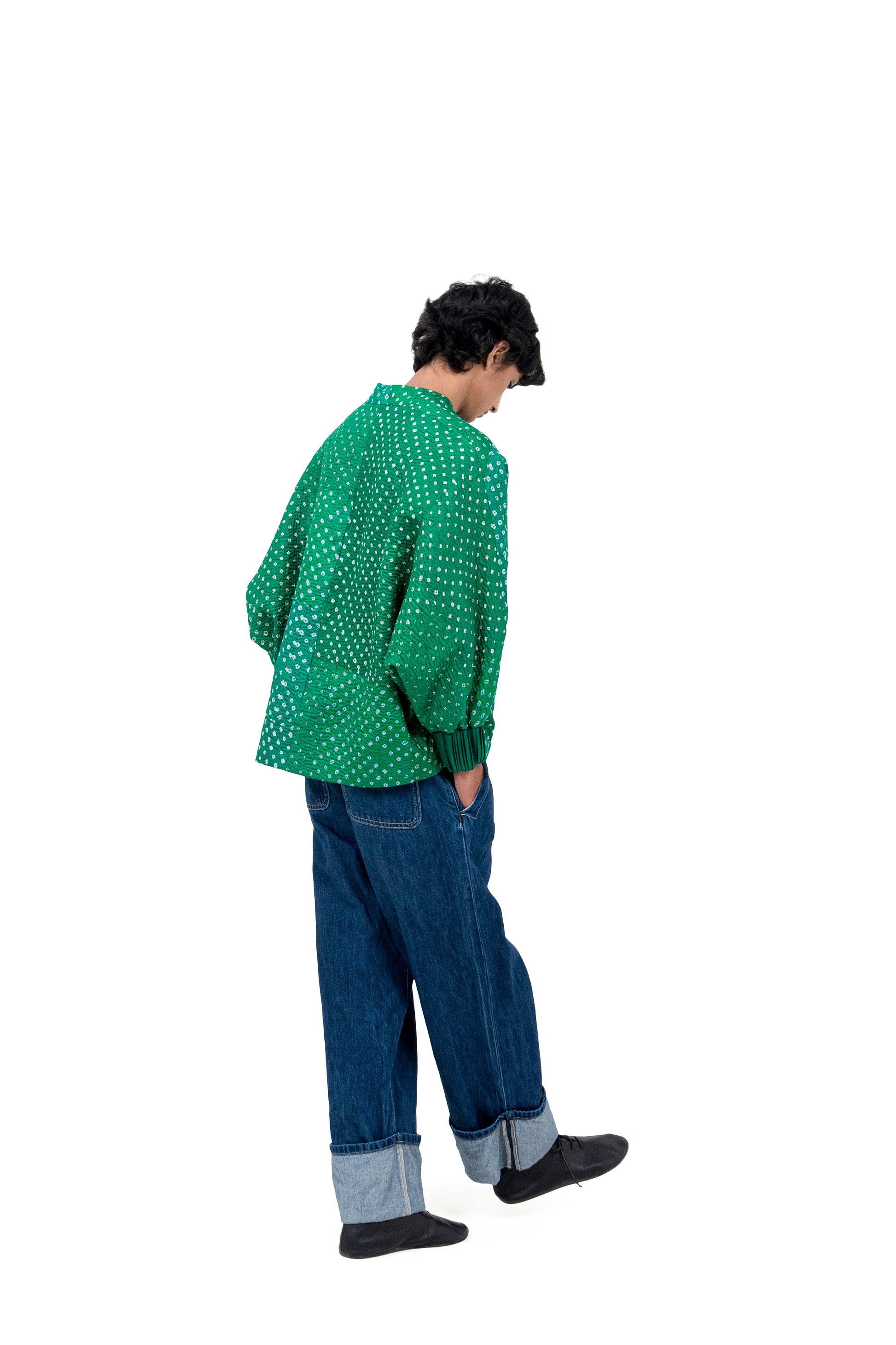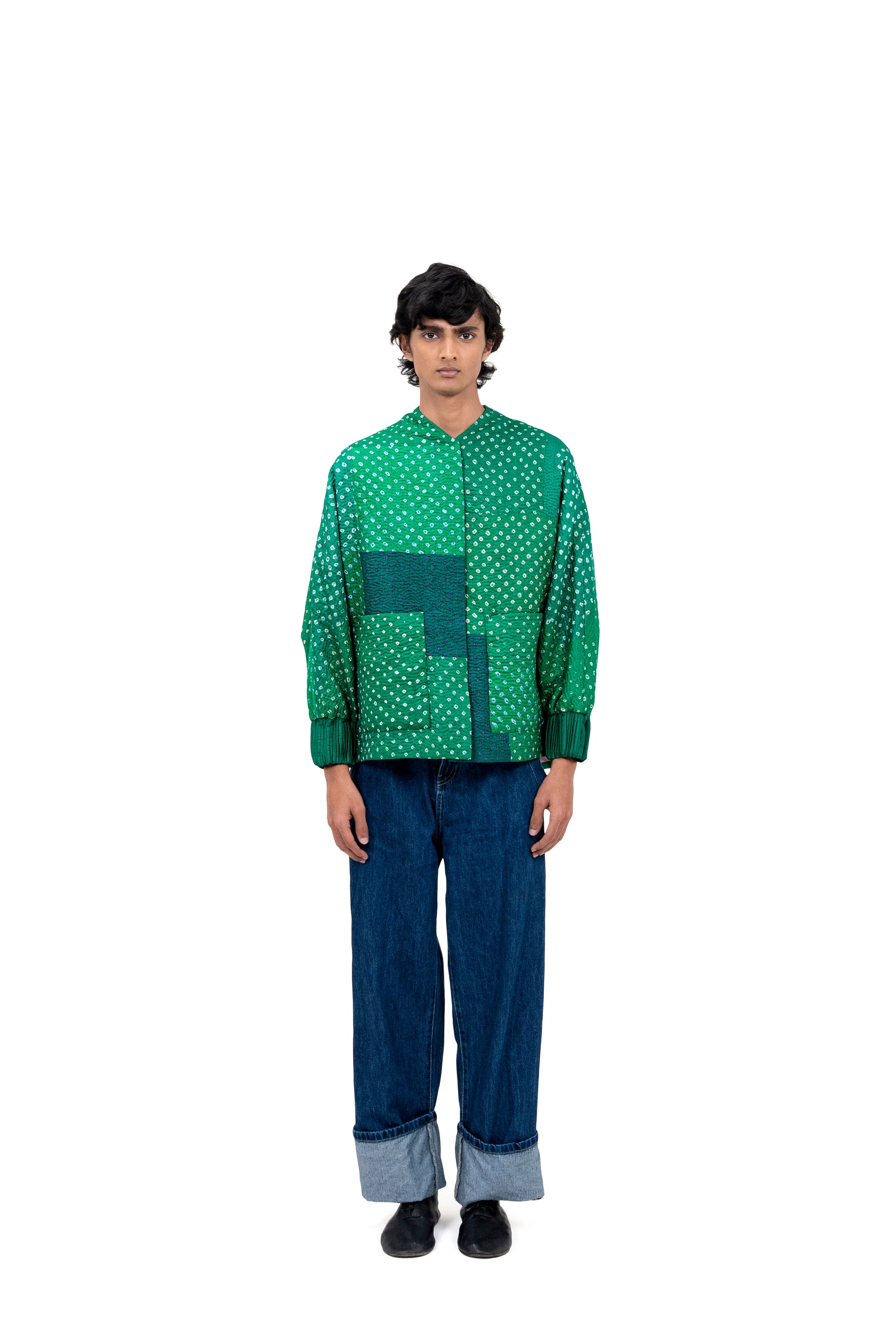 The ‘Miura’ jacket crafted in purple silk and detailed with Bandhini, further adorned with Kantha quilting. Kantha is a running-stitch embroidery technique from the Bengali region of the subcontinent, traditionally used to stitch together layers of fabric. The jacket is finished with a silk inner lining.