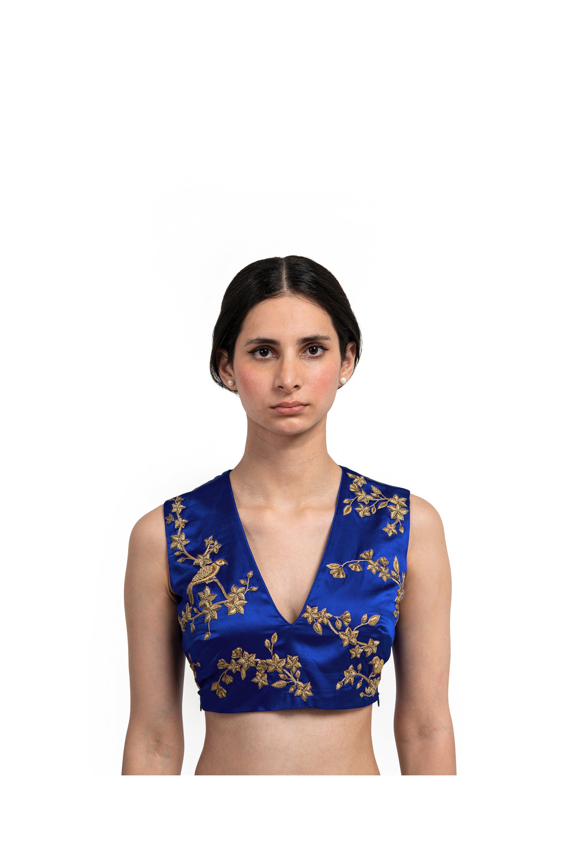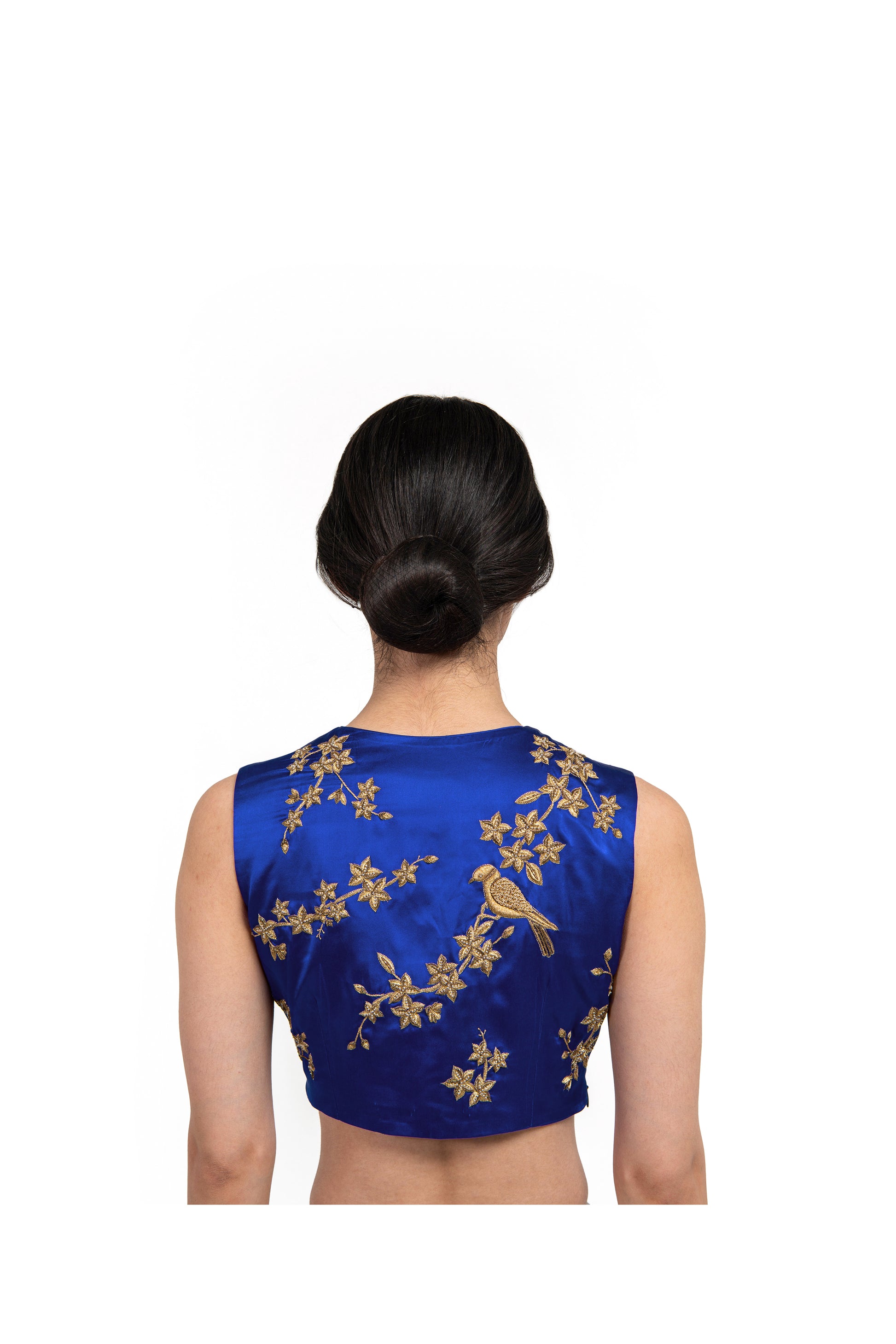'Morina' sleeveless blue blouse in satin silk with zardozi embroidered flora with highlights in glass beads, sequins and dabka kaam.