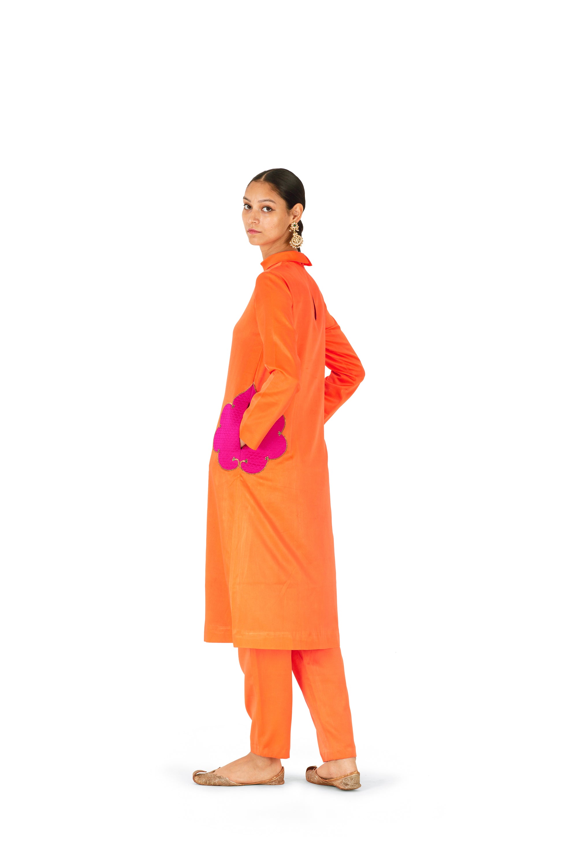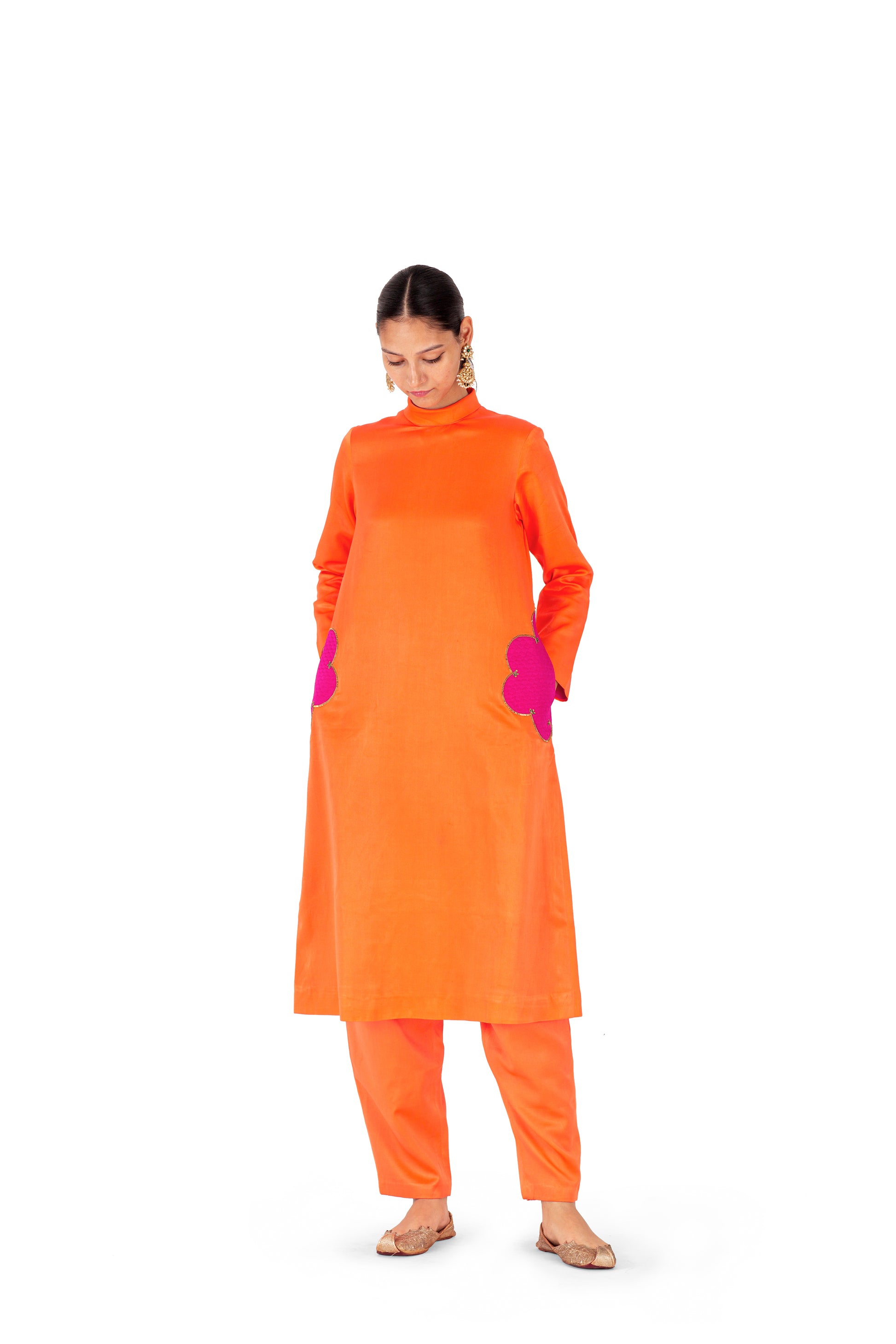 'Orgao’ orange satin silk kurta with quilted rani pink patchwork detailing highlighted in dori kaam and sequins. It is paired with 'Sigao' orange pant in satin silk.