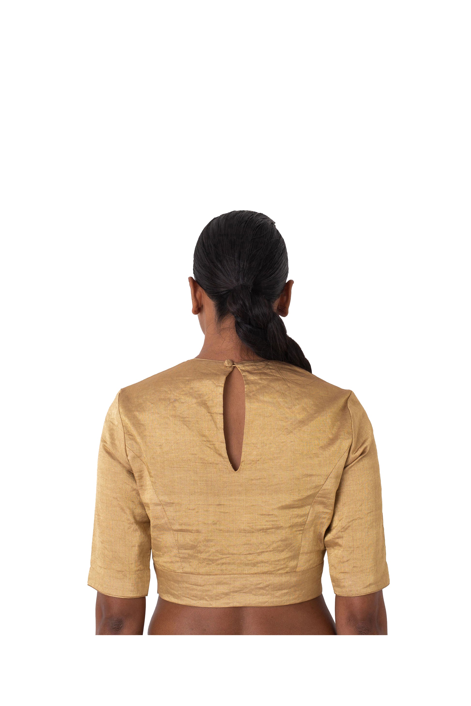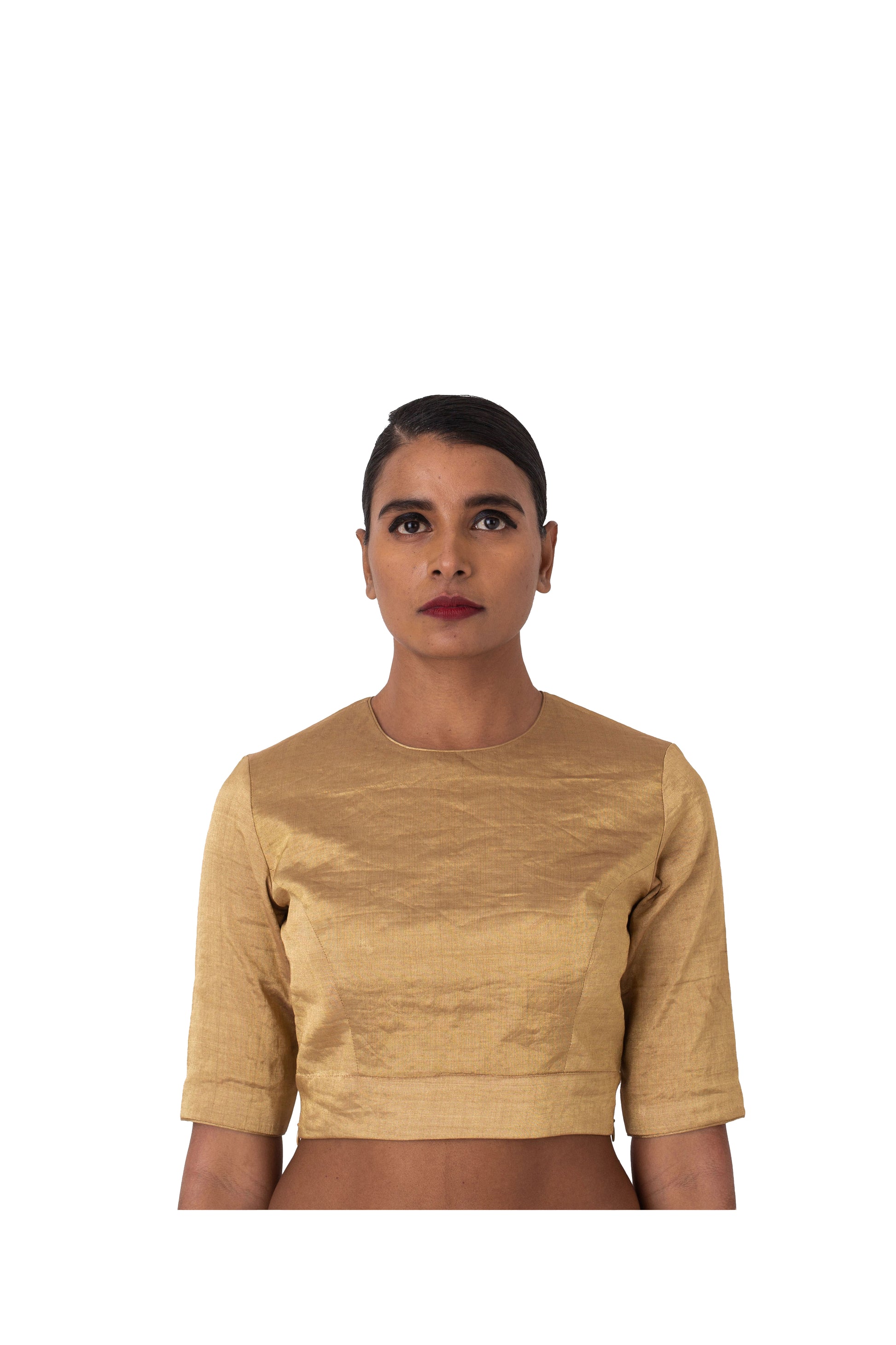 'Sona' gold tissue silk round neck blouse is a favourite: loved for its versatility and subtle sheen.