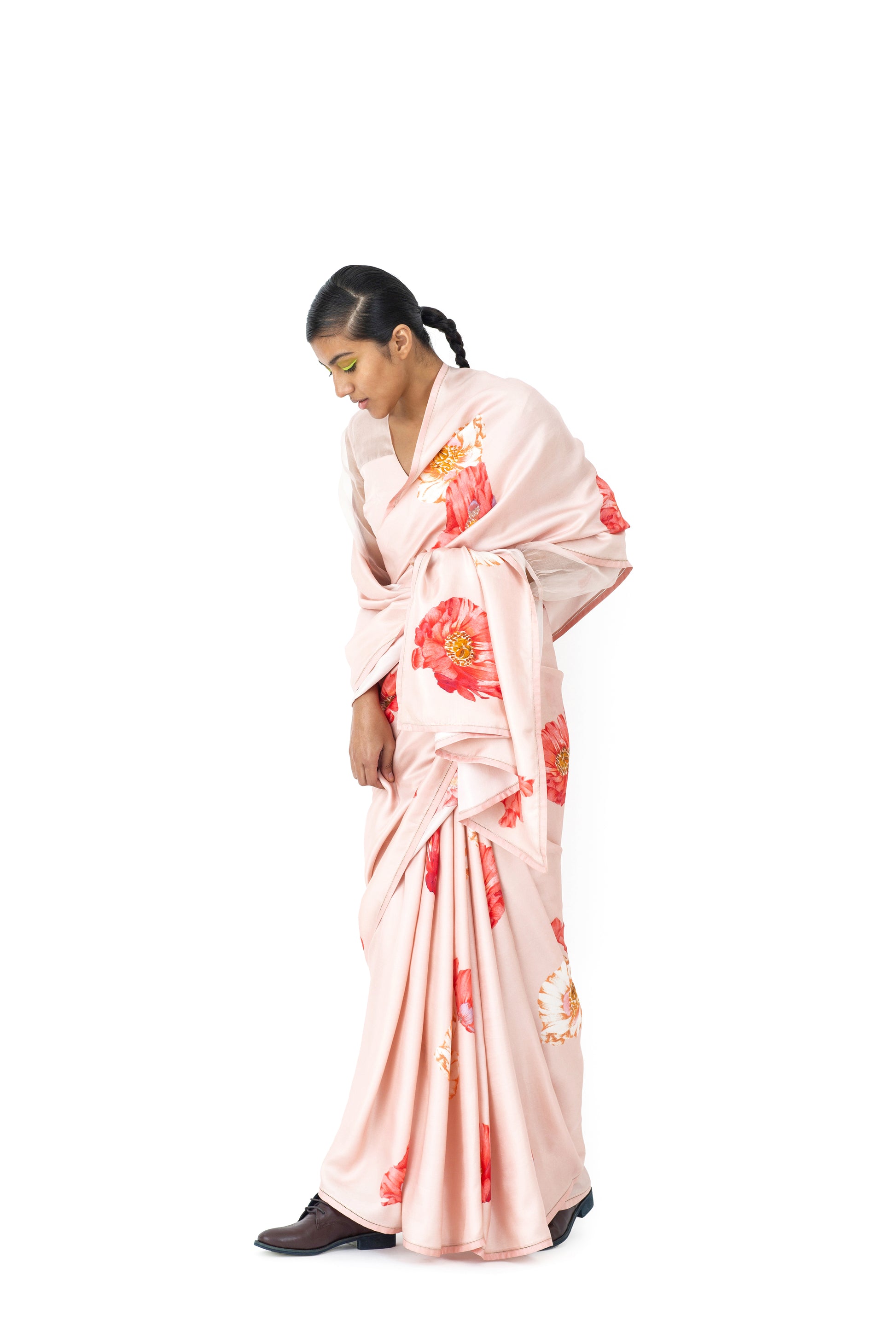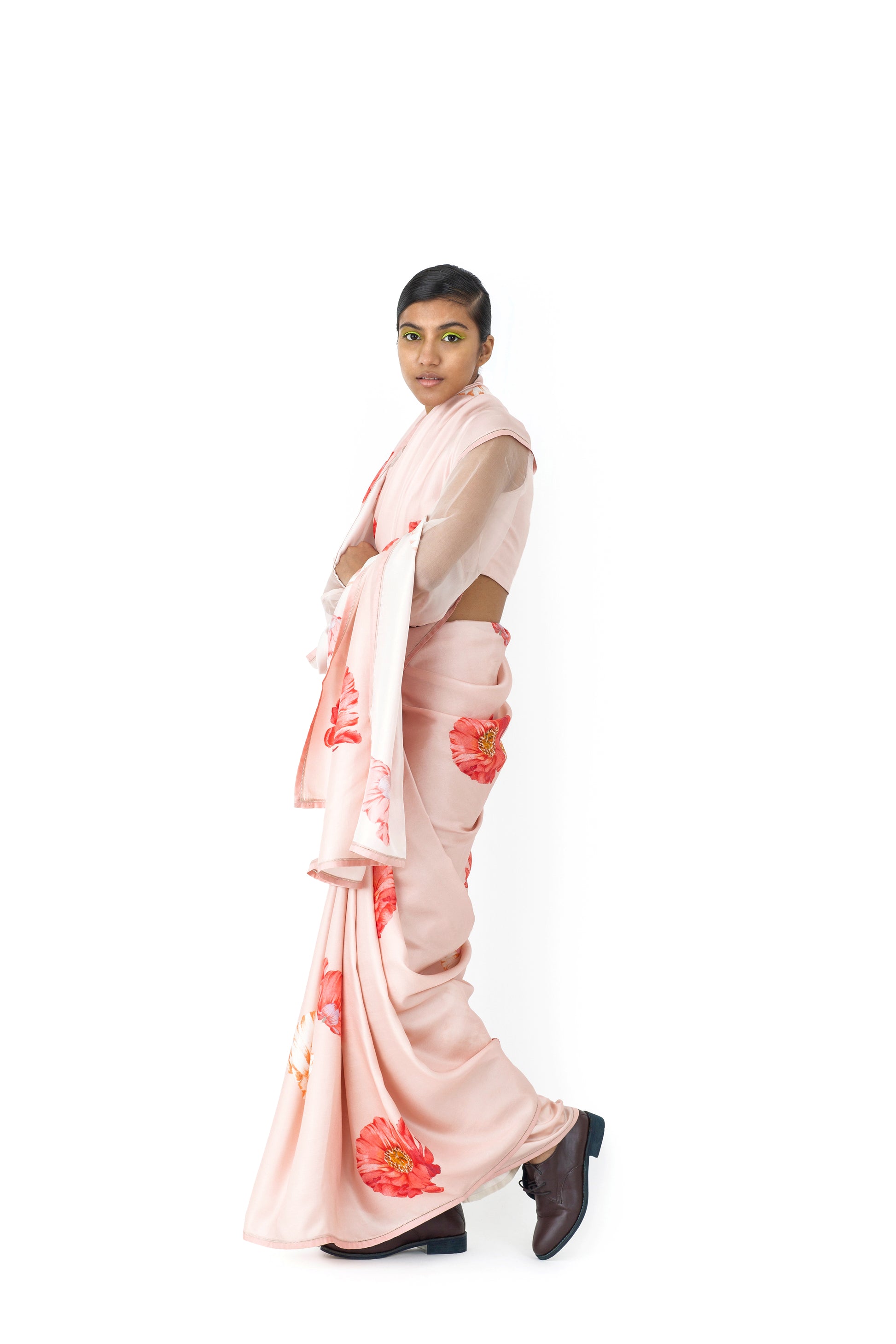 ‘Poppy’ peach silk twill sari features all-over digitally printed flowers.