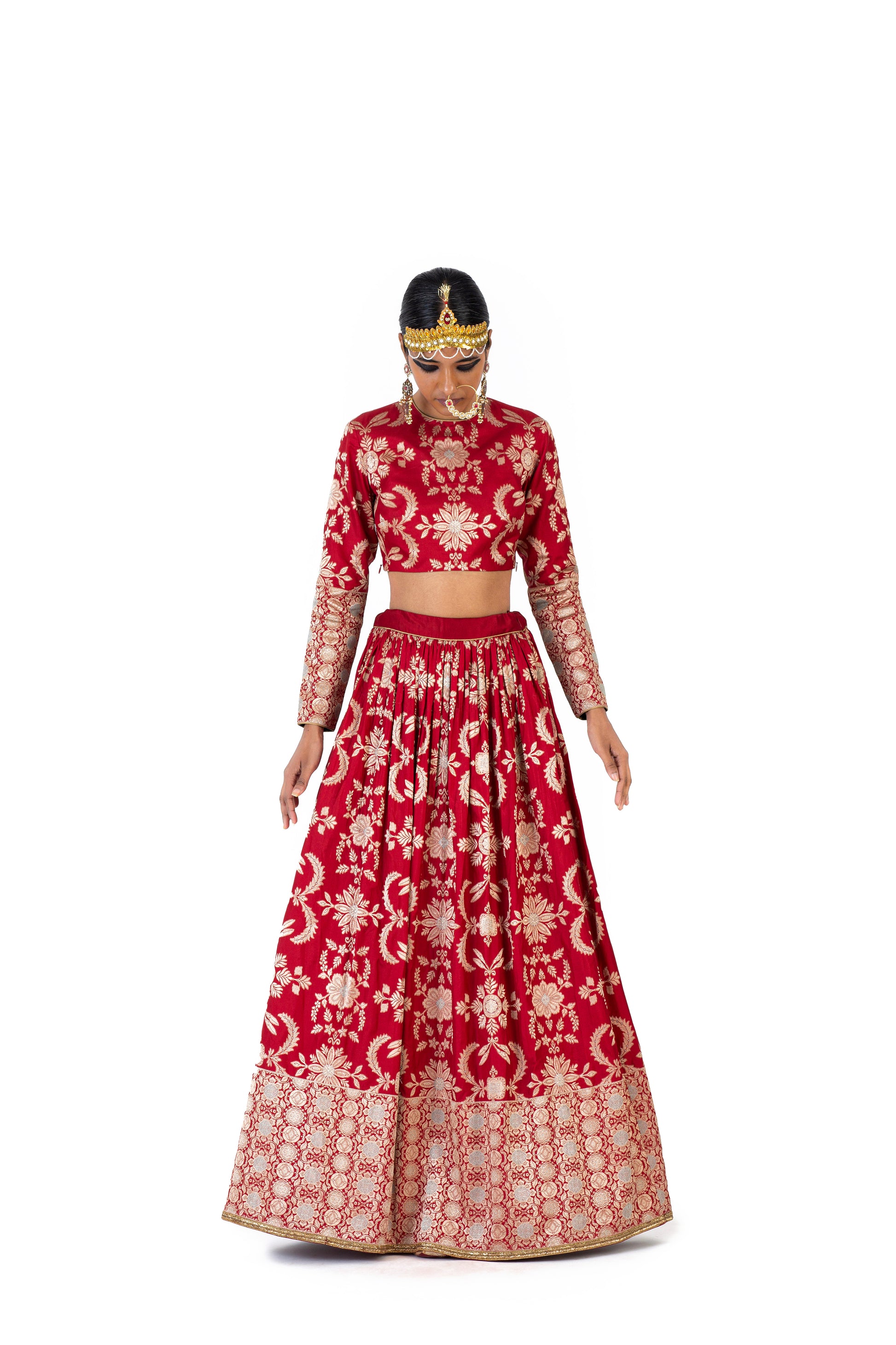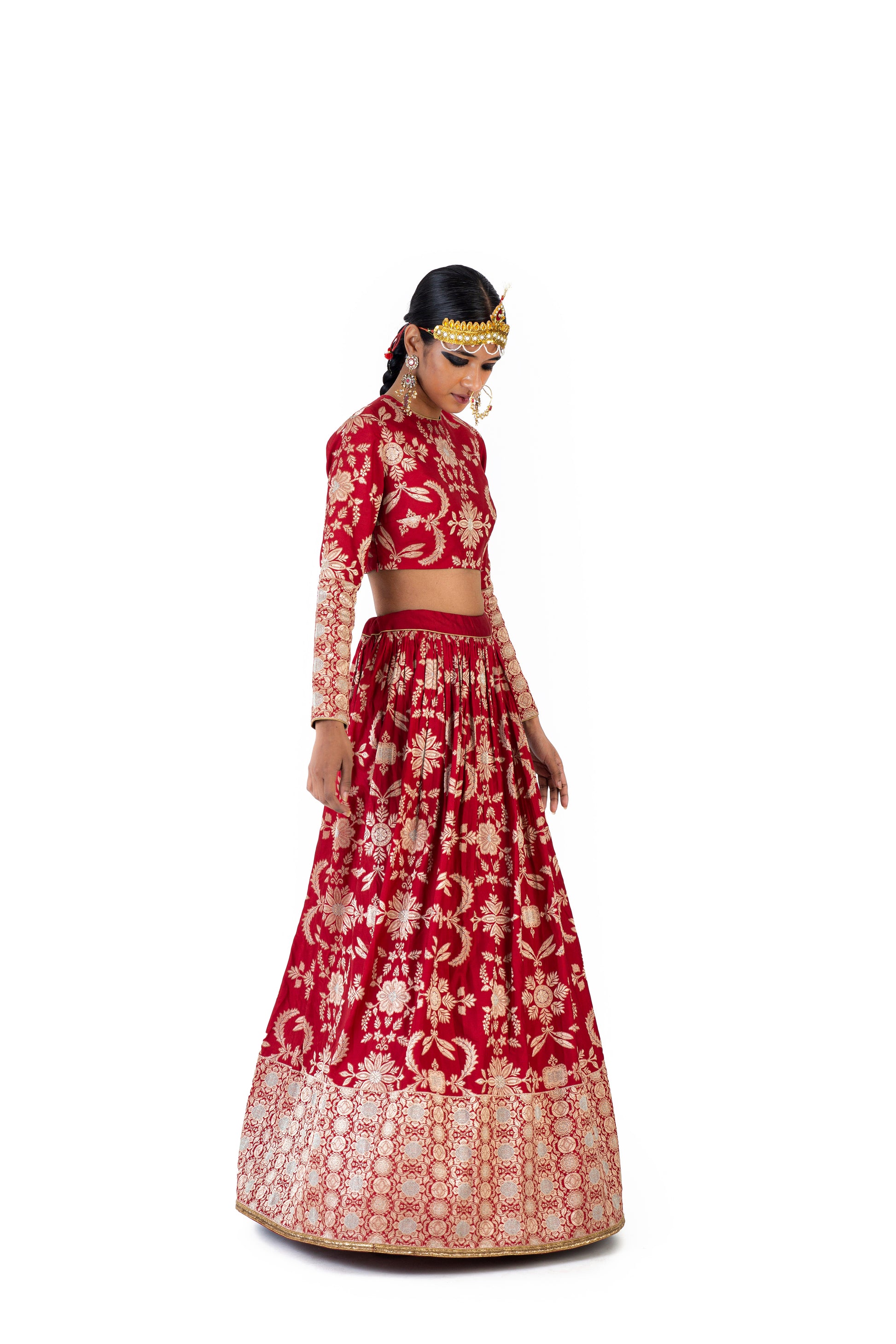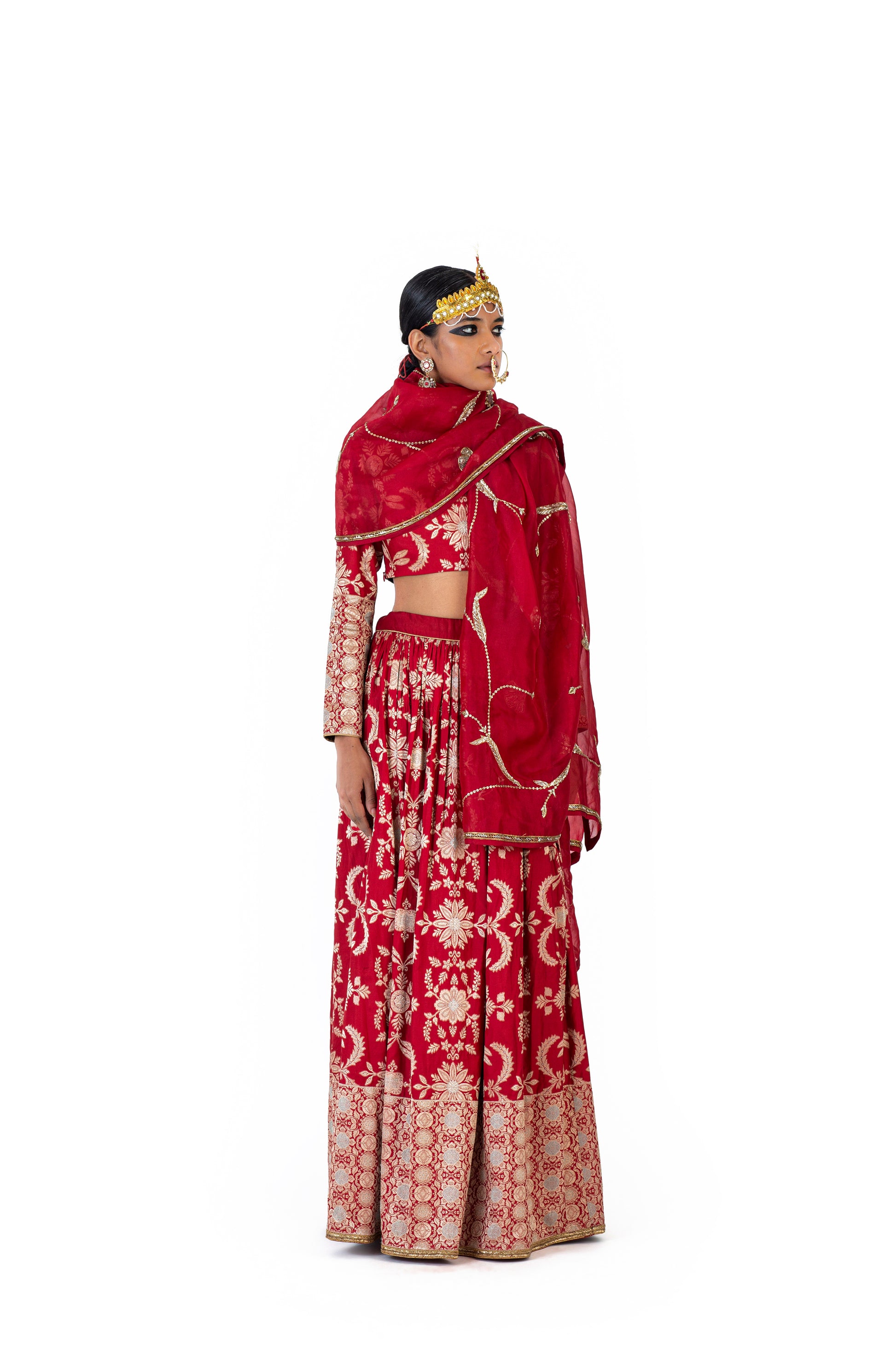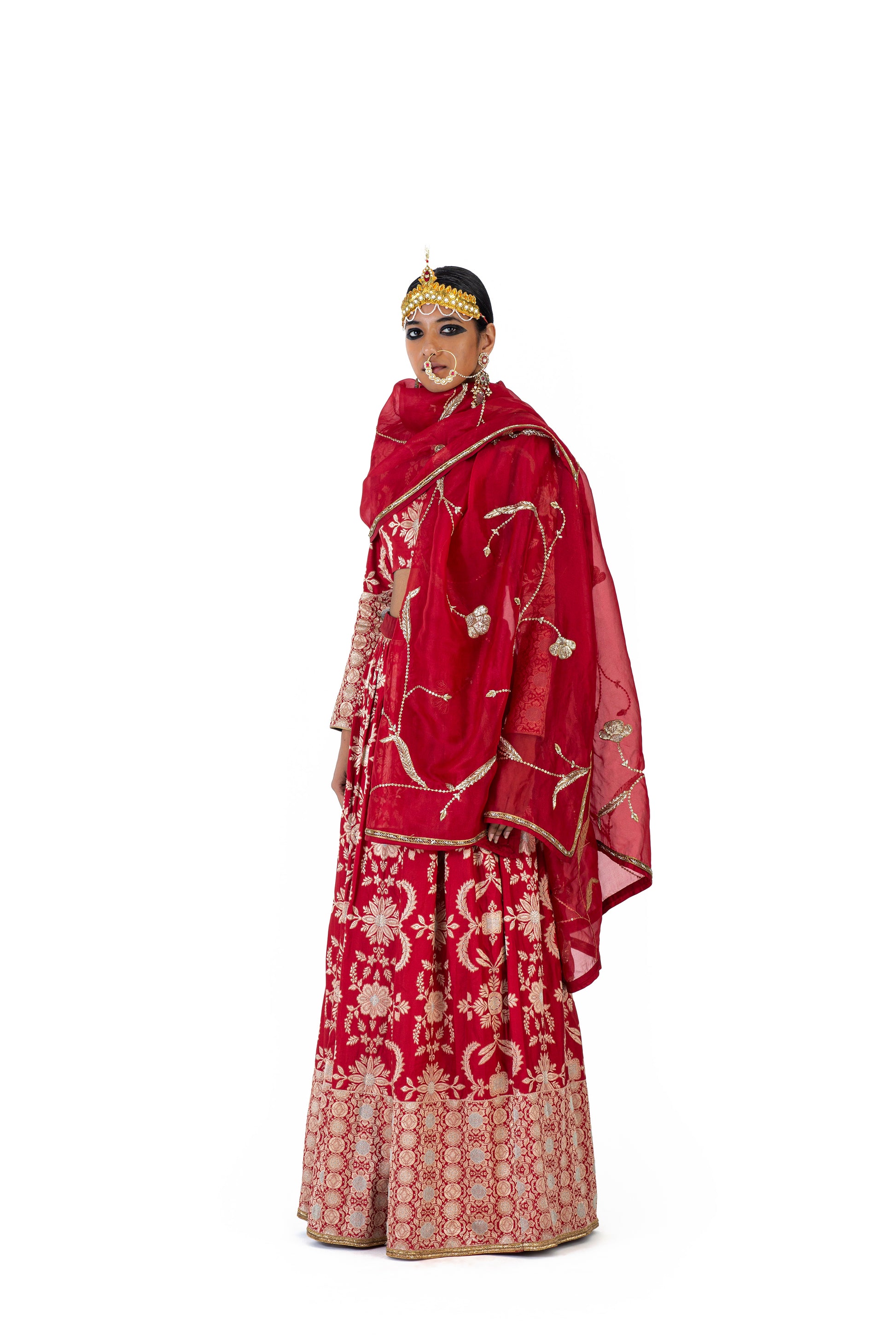 Chitrealekha' lehenga and ‘Prabha’ blouse in Varanasi silk brocade feature weave that is drawn from our textile archives, made using the elaborate Kadwa technique, where each motif is woven separately in a 'jangla' pattern. It has a play of Meenakari on the trellis of flowers, inspired by printed textiles such as kalamkari chintz depicting flora and fauna. Shivani pairs it with sheer organza ‘Unnao’ odhani with all-over hand-embroidered Mughal leaf ‘jaal’ and kiran along the border.