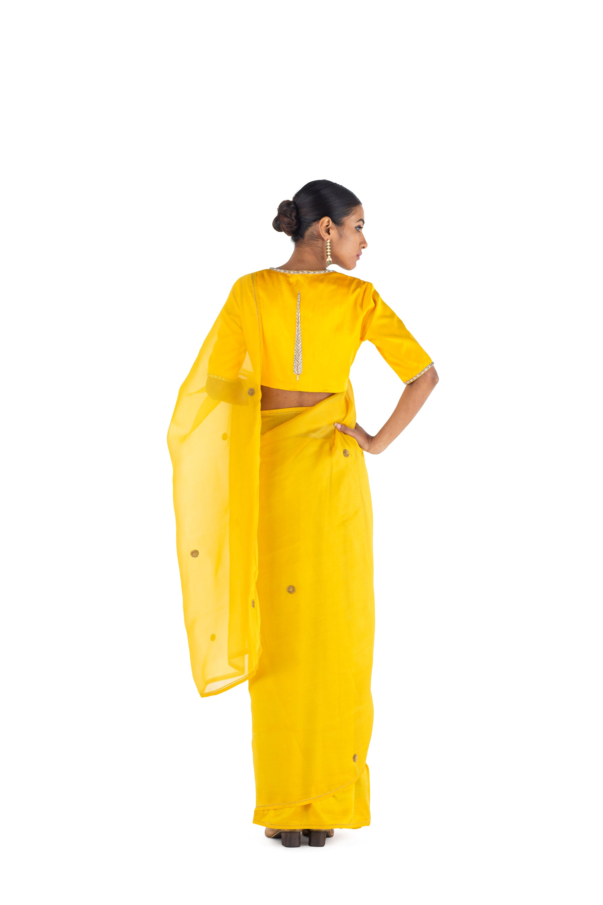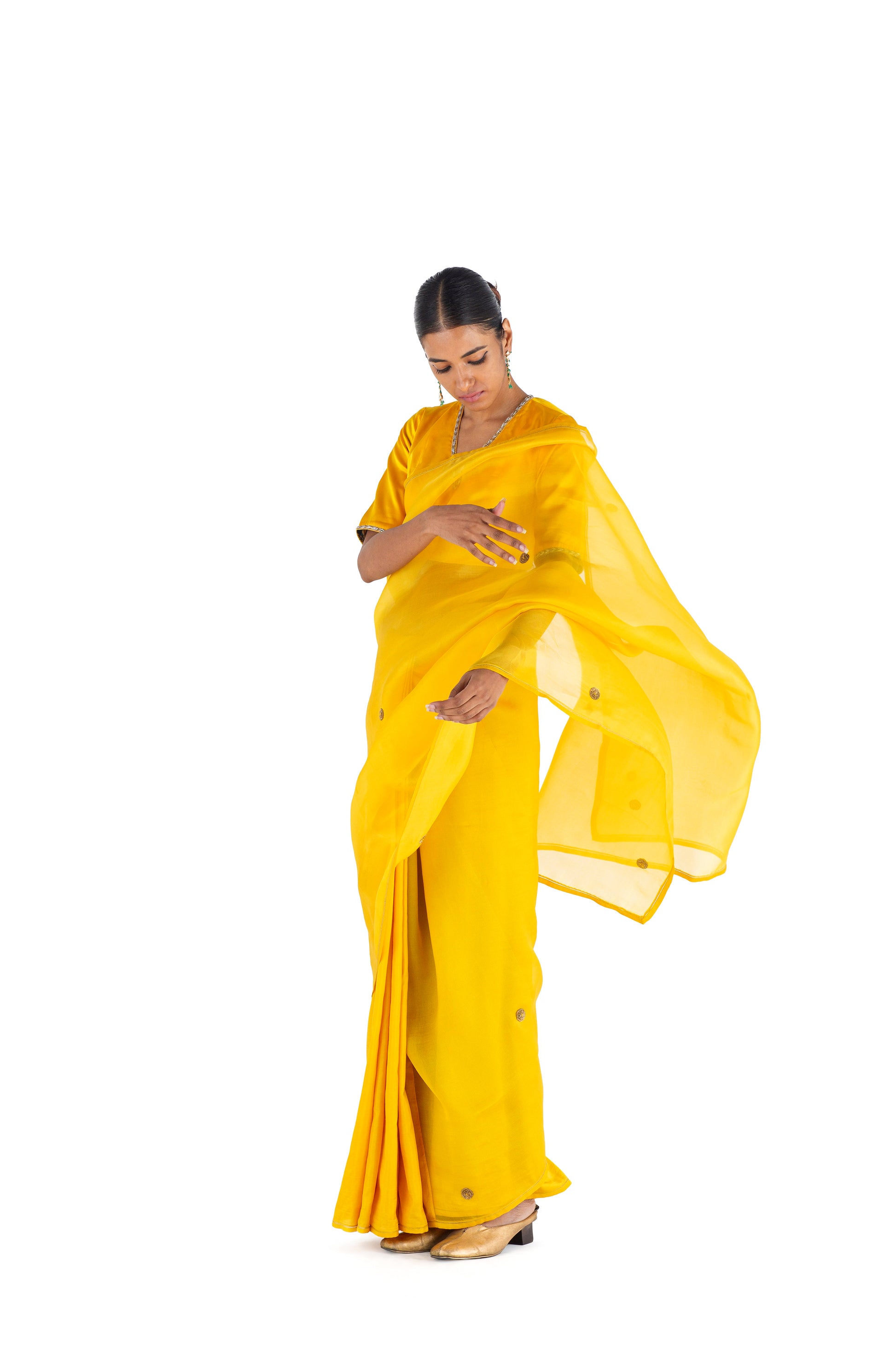 'Purva' yellow sari is made through the joinery of textiles: sheer organza silk and plain silk, which allows for a better suited drape and fall. It features floral butis along the body and palla and gold web-embroidered border,