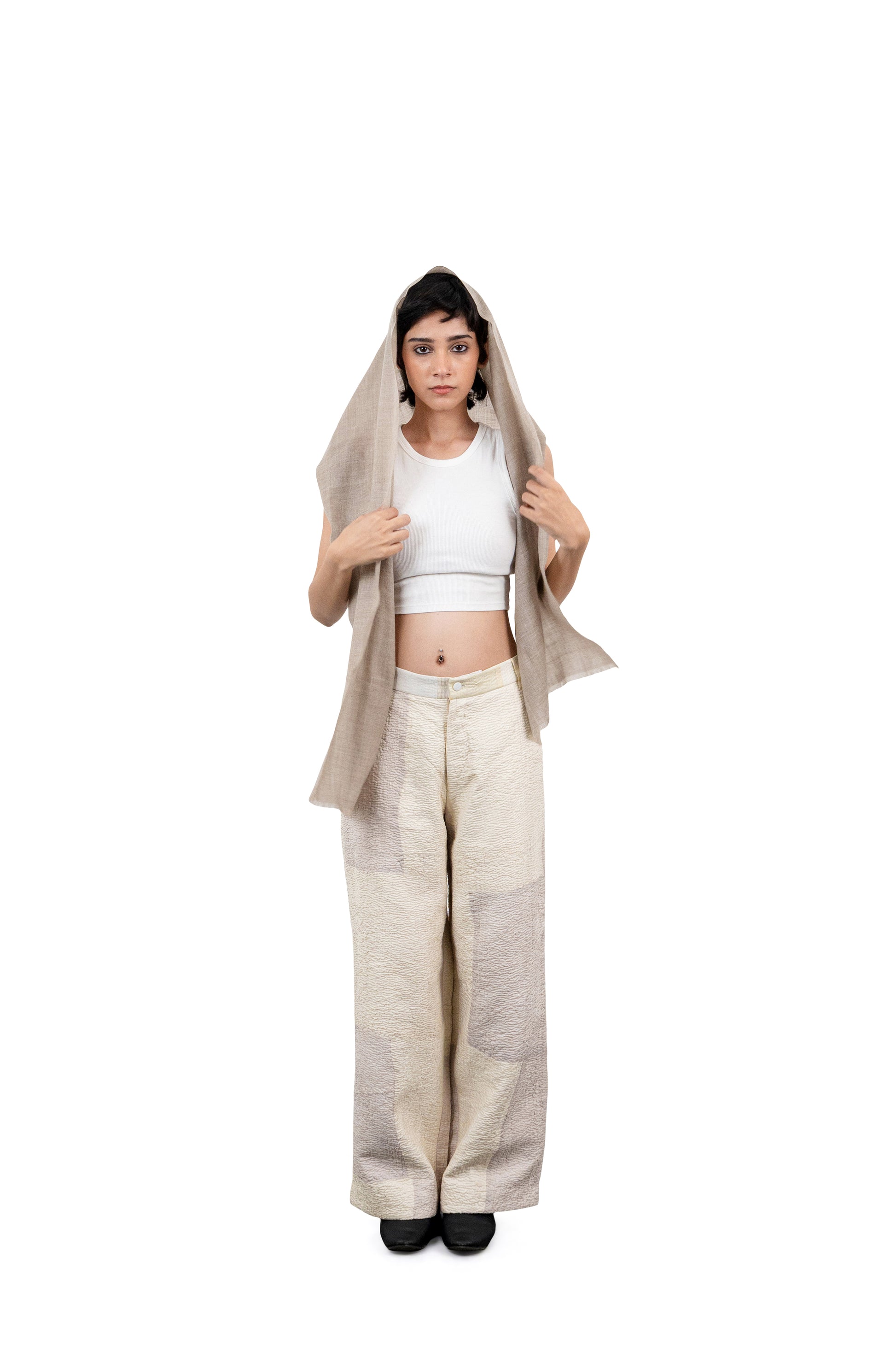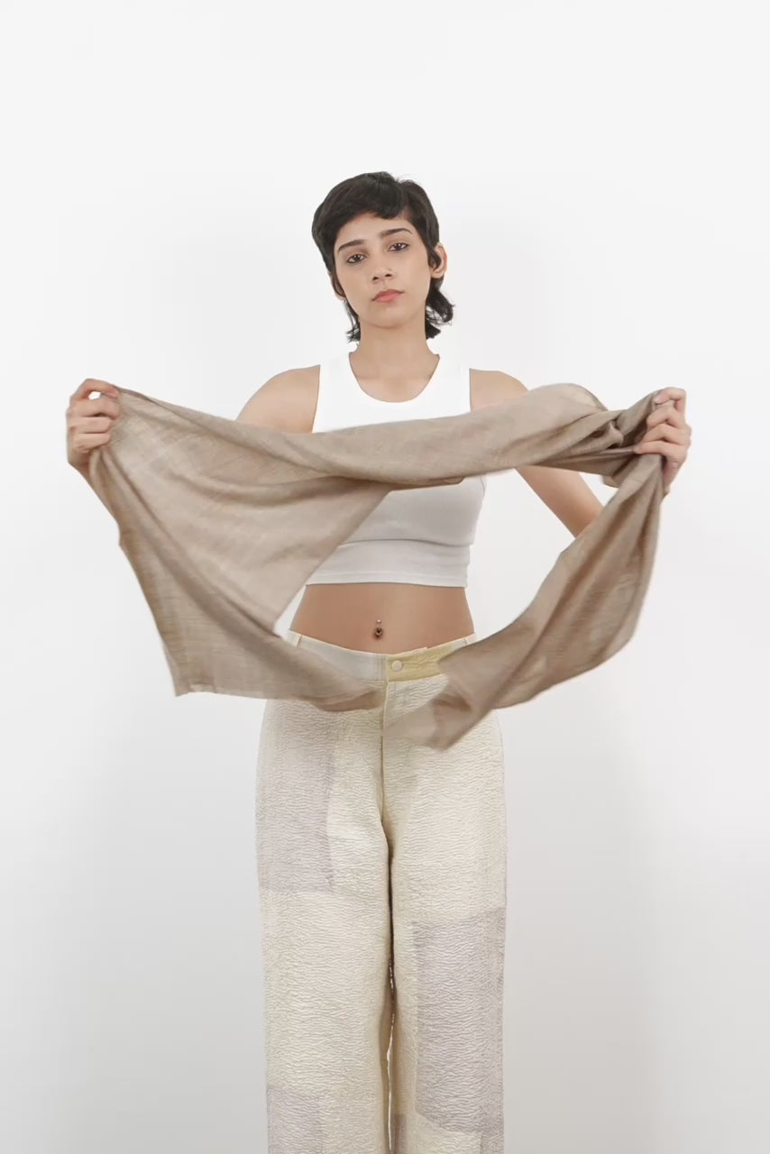 The ‘Rehti’ scarf is crafted in undyed Pashmina, retaining the natural colour of the yarn. The material is woven in Kashmir and reflects the softness and warmth of the fibre.