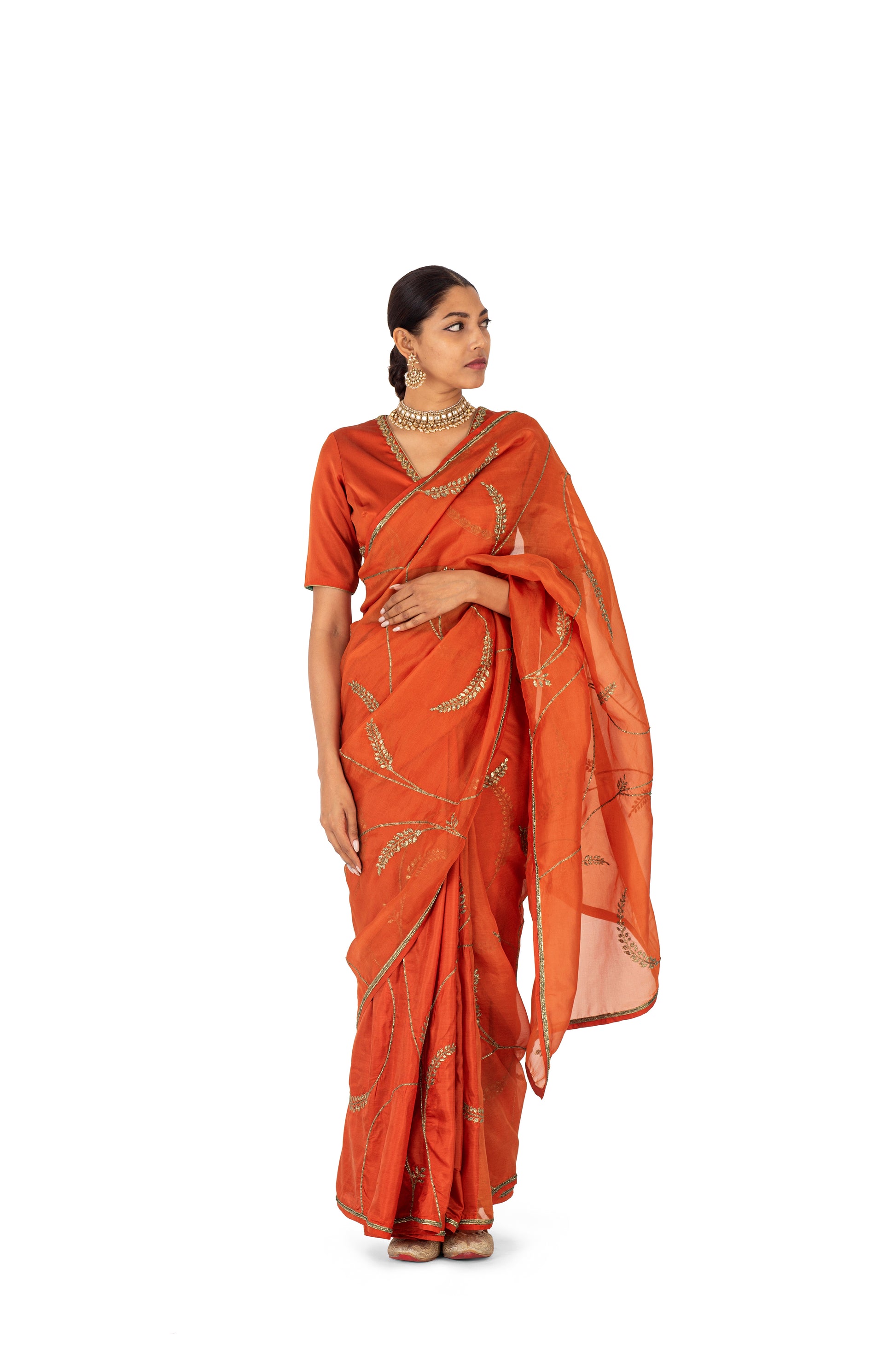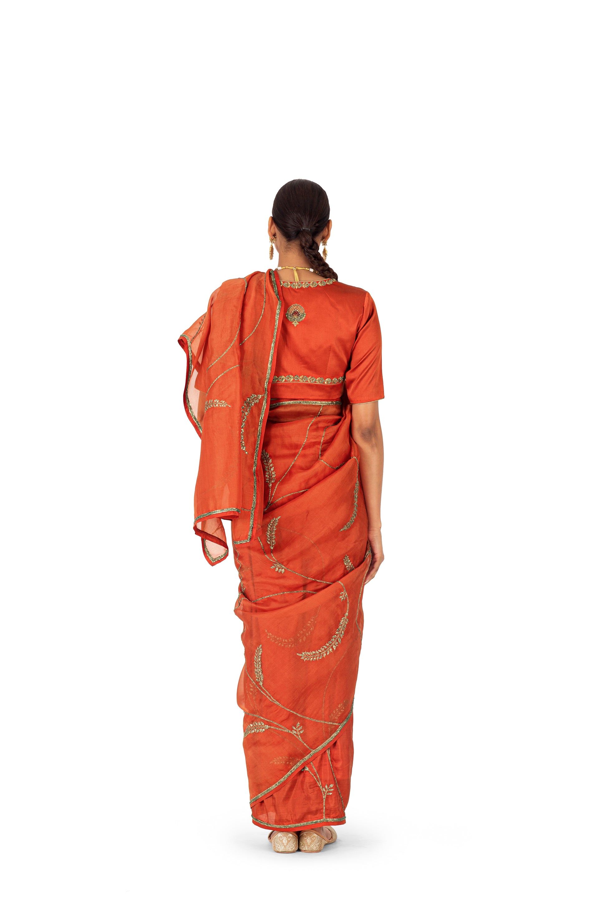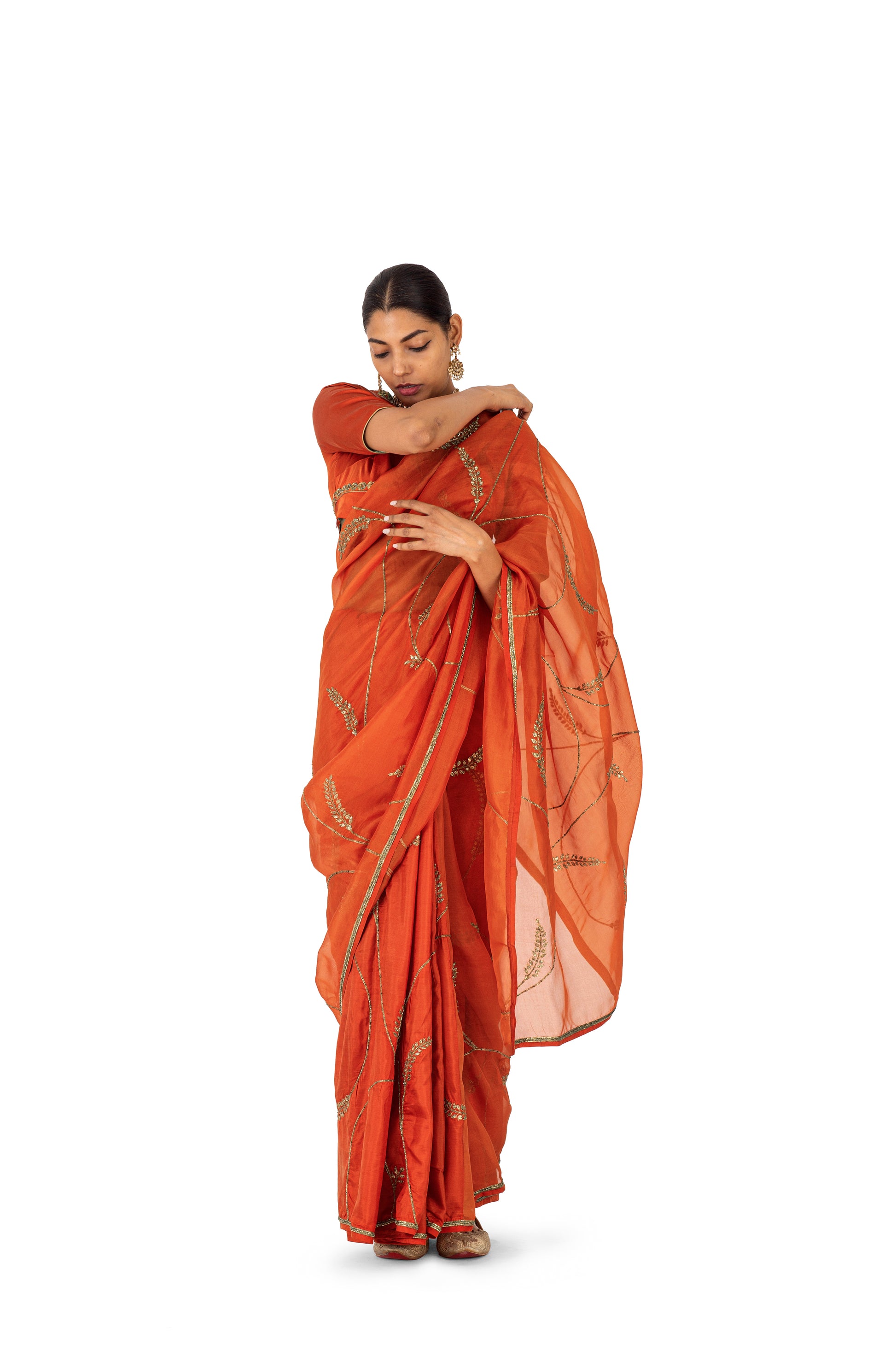 ‘Reis’ rust sari is made through the joinery of textiles: sheer organza silk and plain silk, which allows for a better suited drape and fall. The organza has floral motif jaal hand embrodiered in dori kaam and sequins .