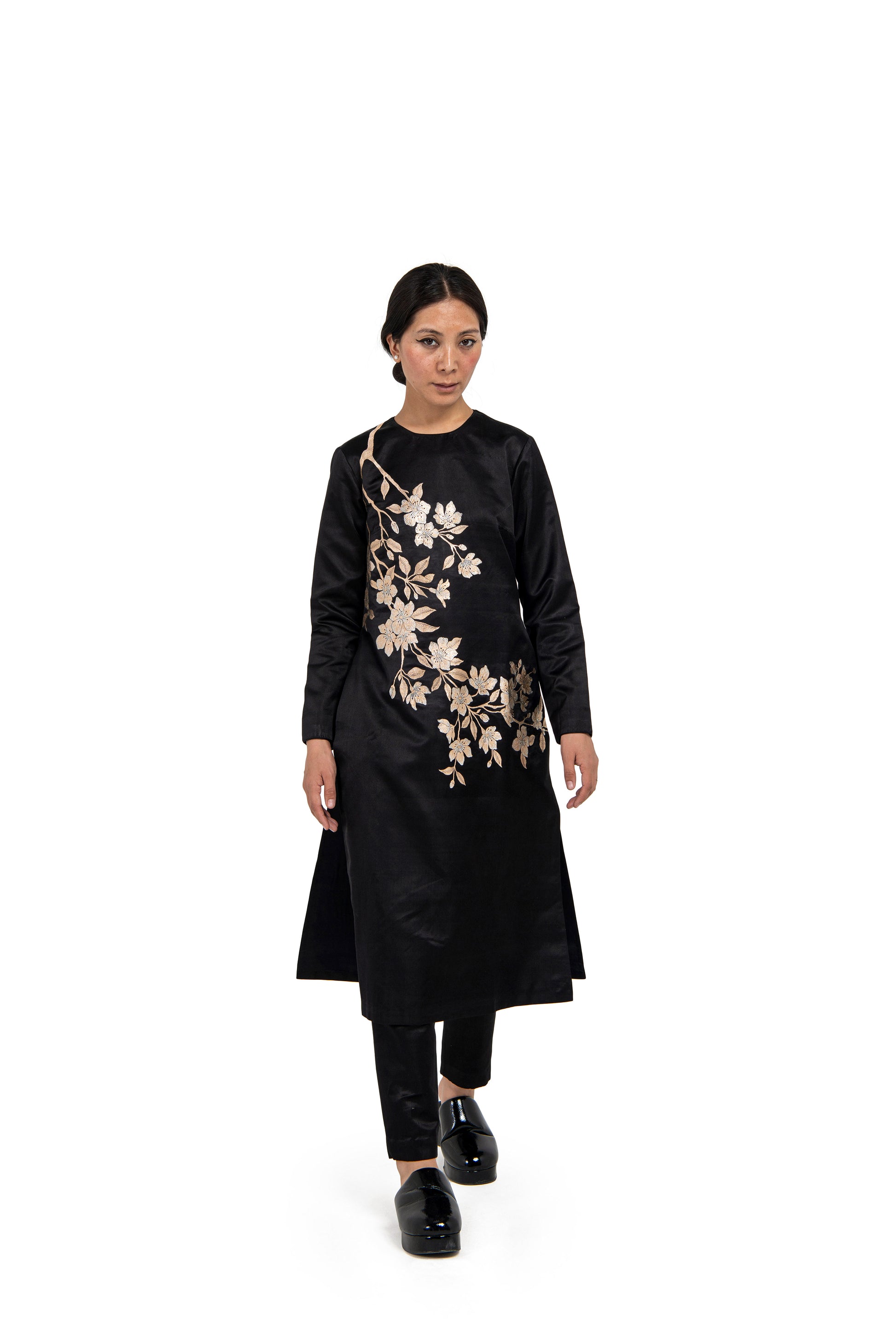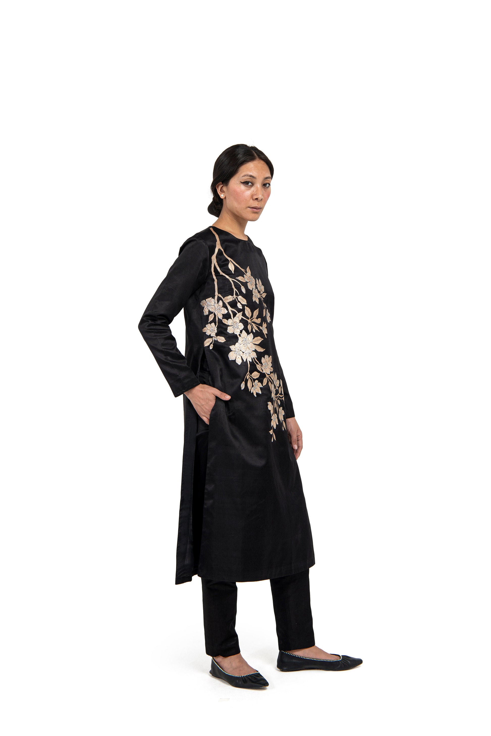 'Ruka' black silk kurta features a cherry blossom branch in gold zari realised through engineered weave on the handloom. It is paired with 'Suzume' pants.