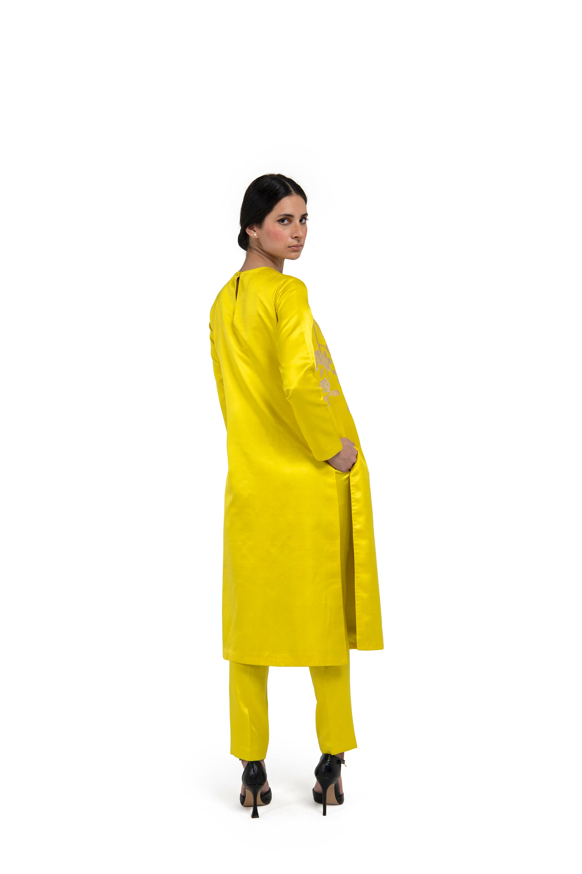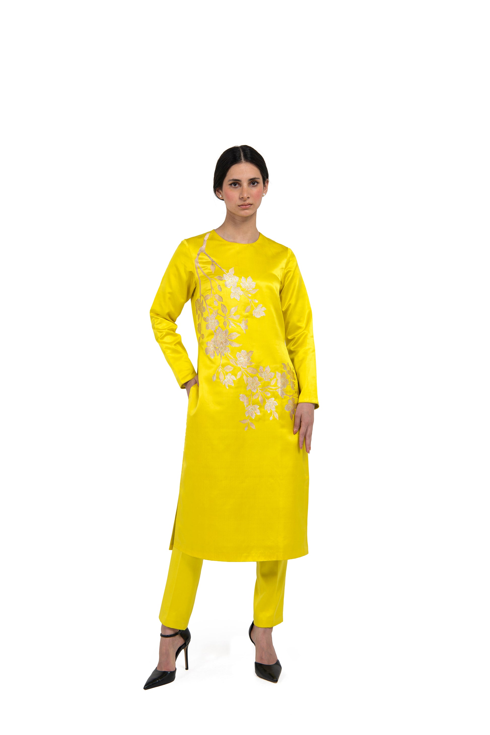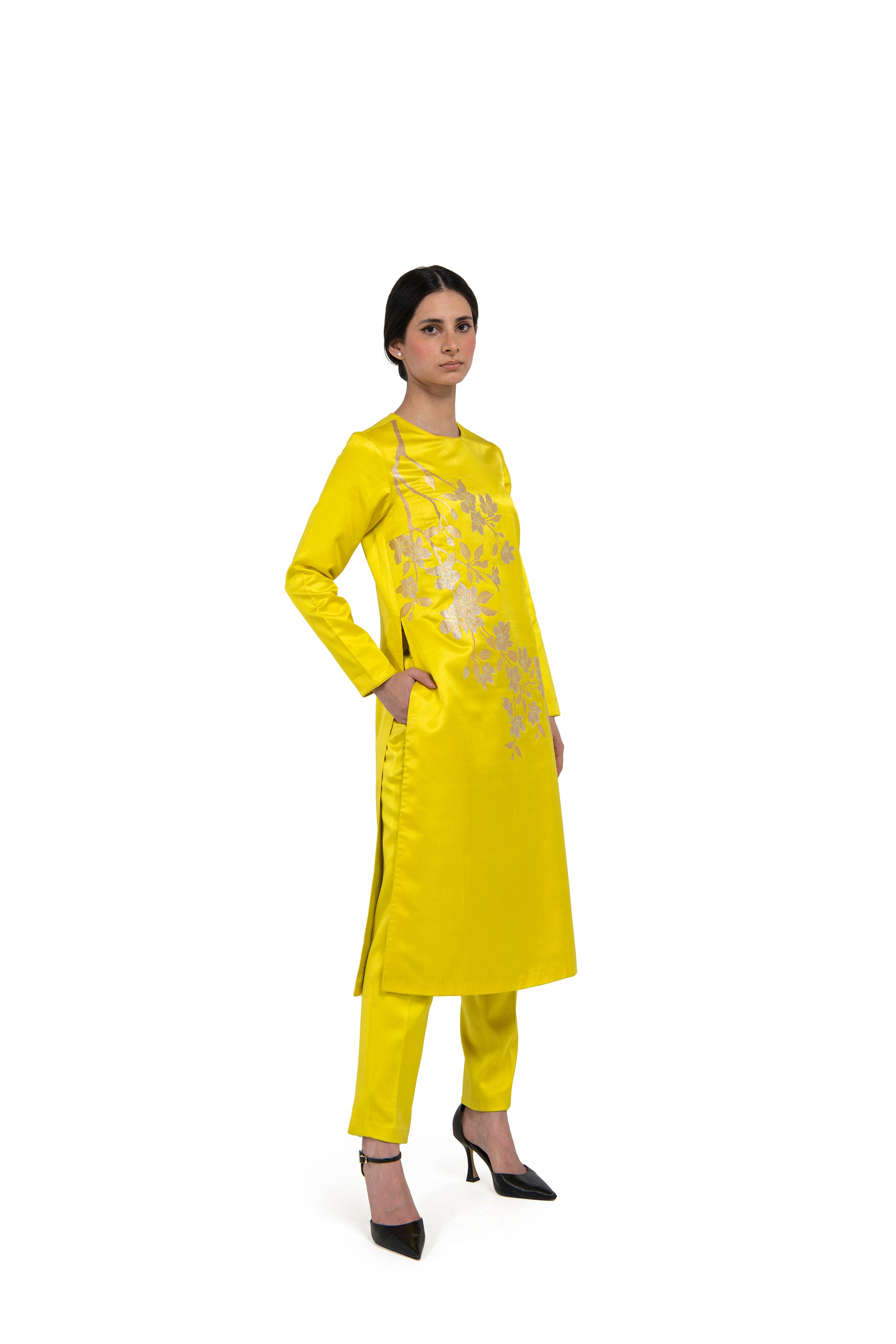 'Ruka' yellow silk kurta features a cherry blossom branch in gold zari realised through engineered weave on the handloom. It is paired with 'Suzume' pants.