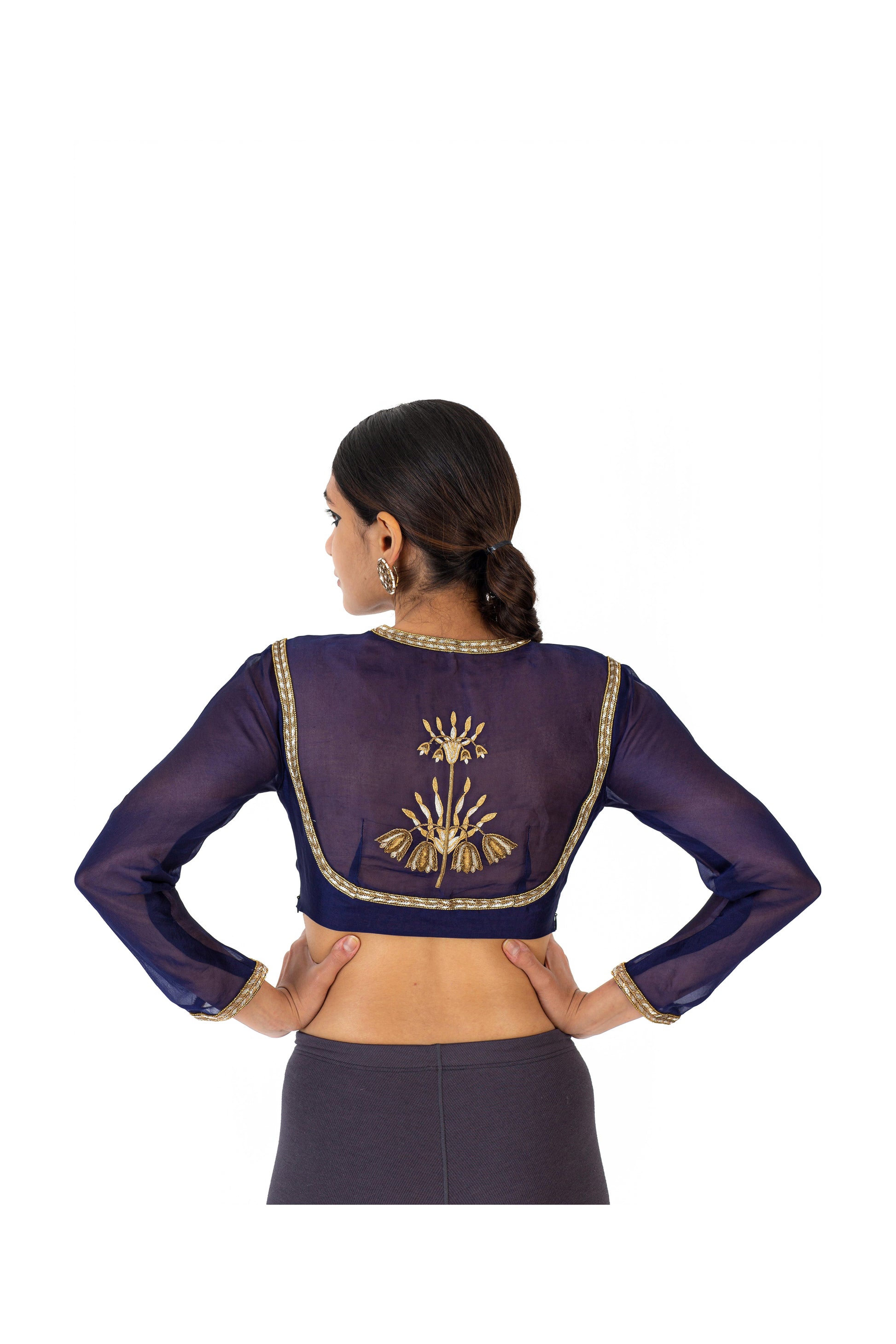 ‘Rukmani’ blouse in Varanasi silk tissue brocade bust that is highlighted with gold and silver naqshi hand-embroidery that speak to Ganga Jamuna tehzeeb. It features sheer organza sleeves and body.