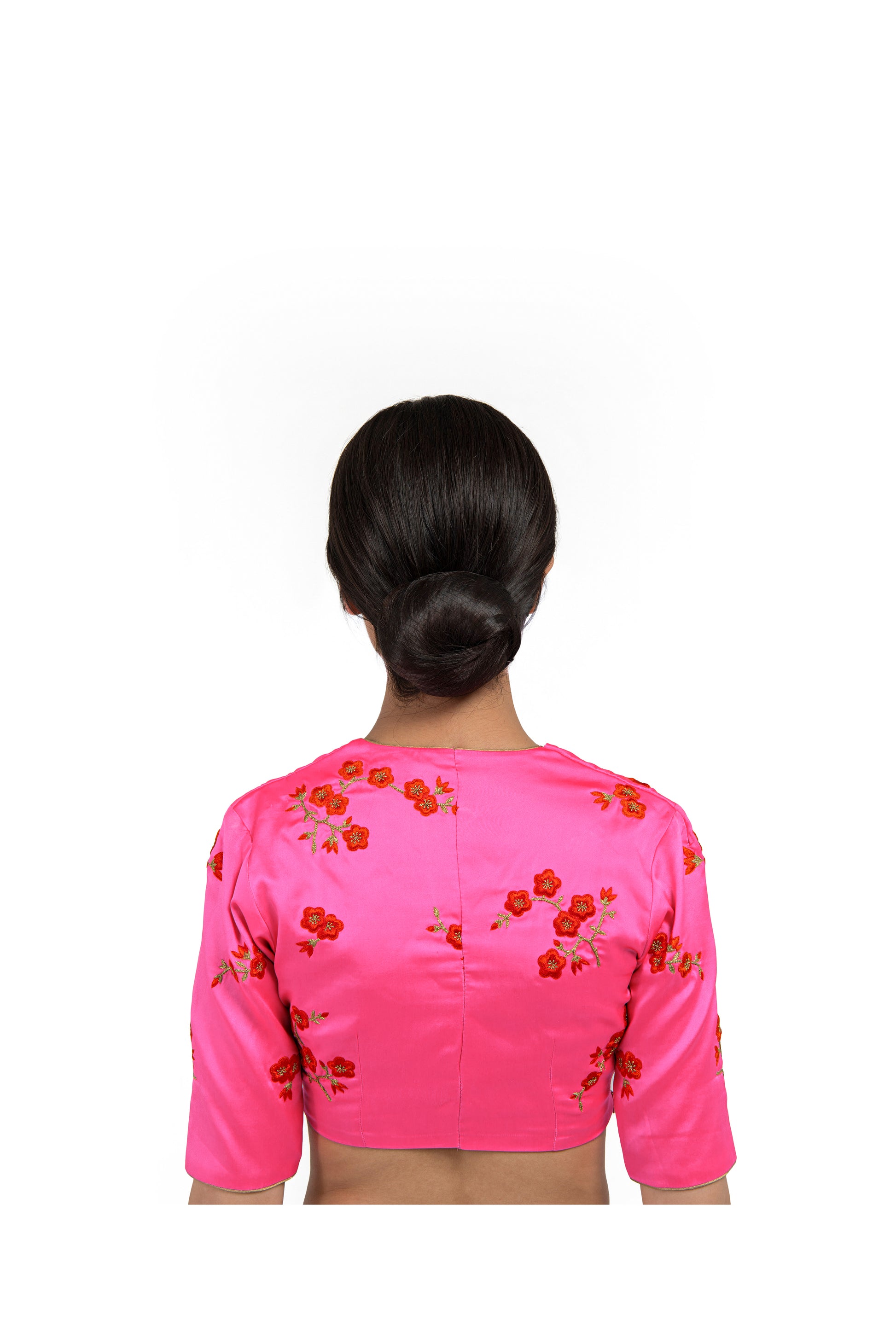 Sayuri' gulabi blouse in satin silk with zardozi embroidered Sakura flower branches with highlights in glass beads, sequins and dabka kaam.