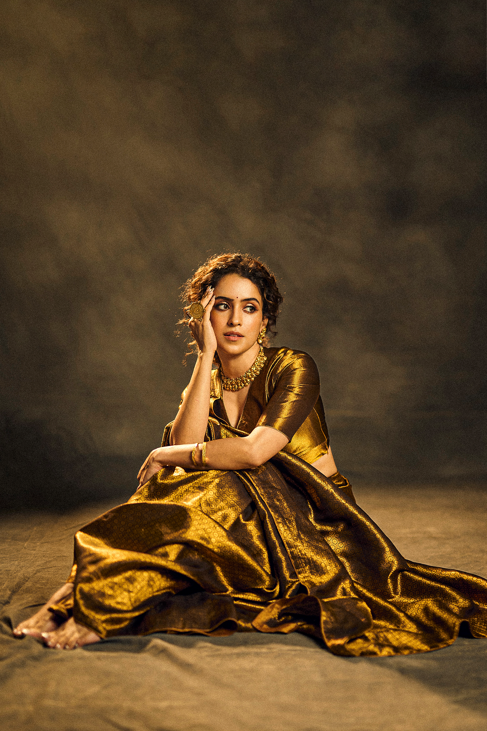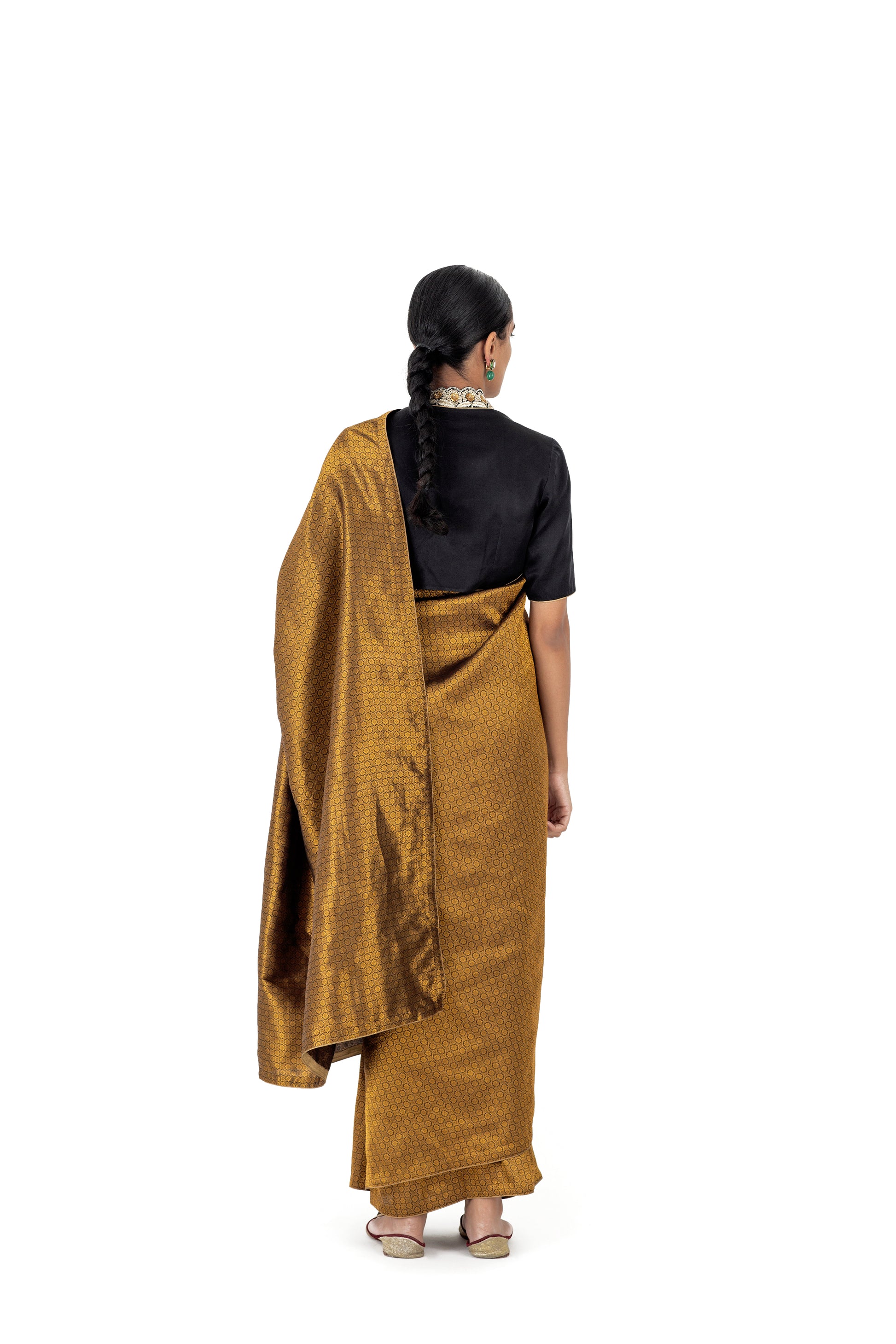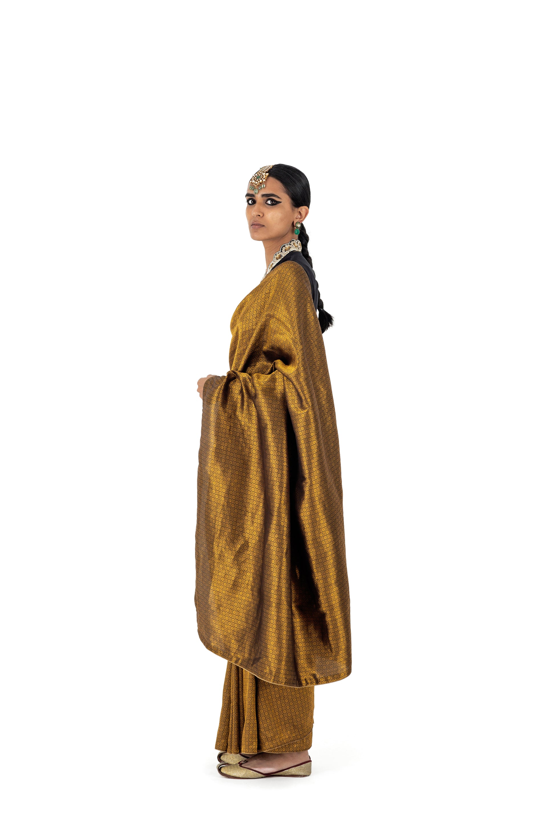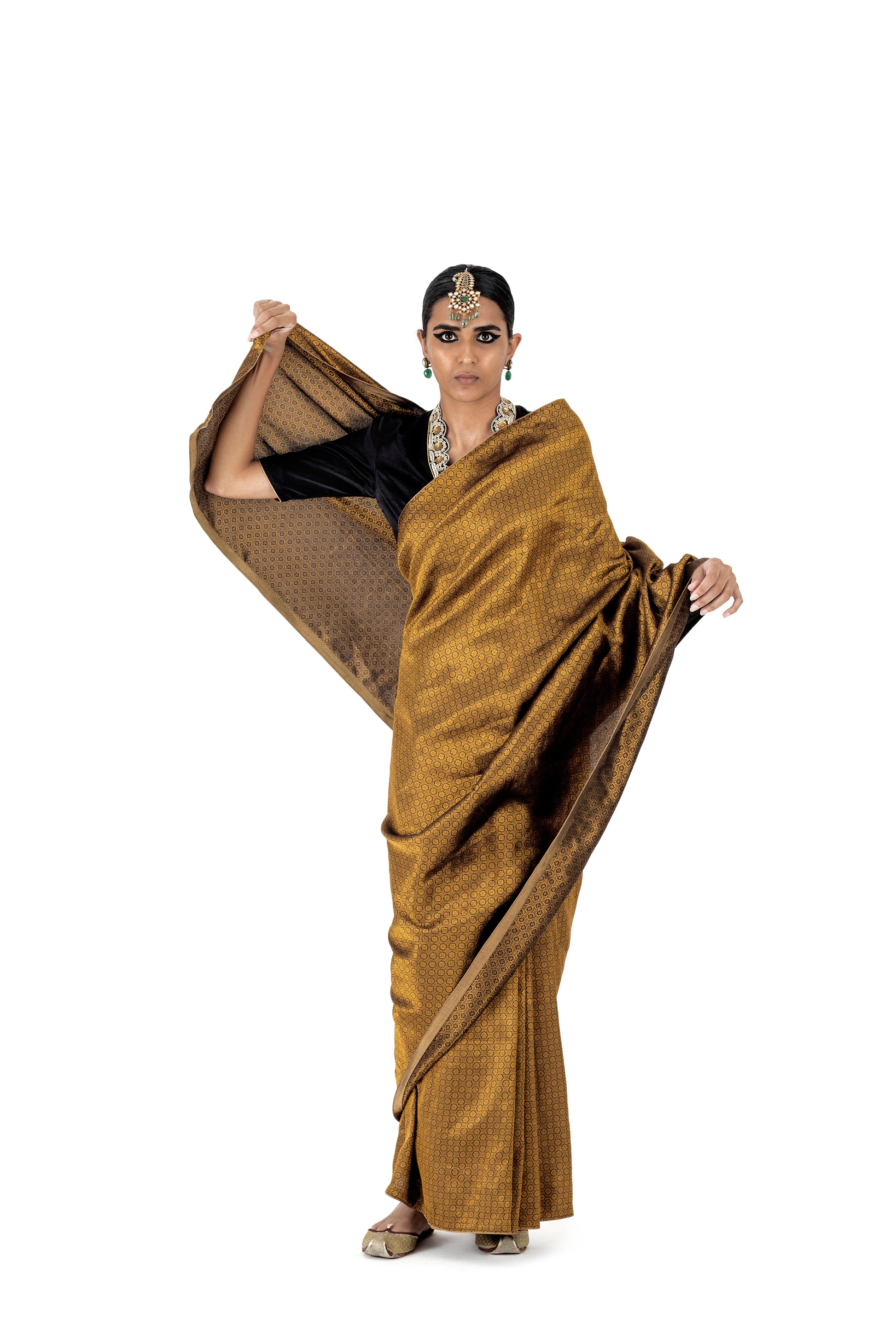 Molten gold: ‘Sunehari Phool’ Varanasi silk brocade sari features tiny floral motifs, and is loved for its versatility.